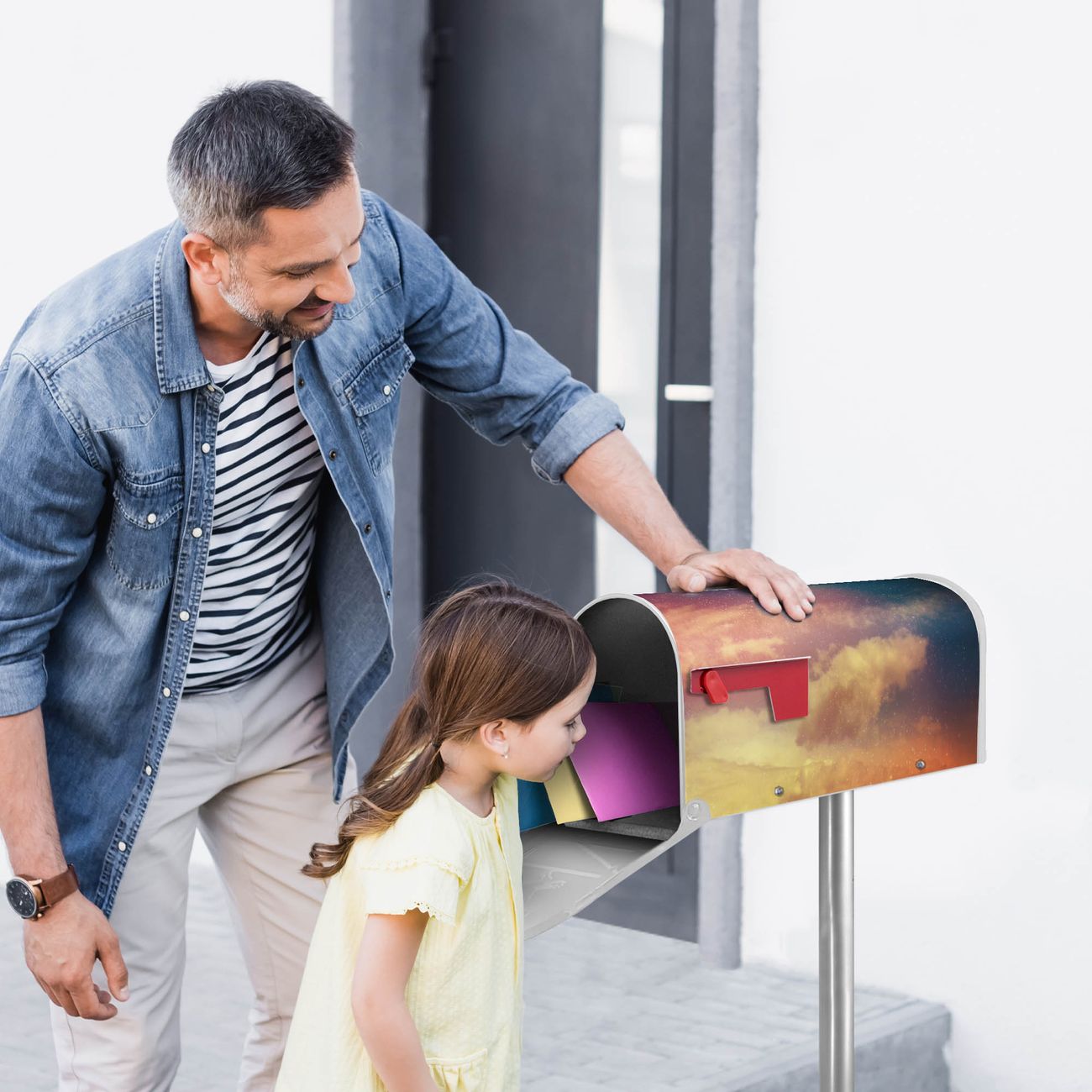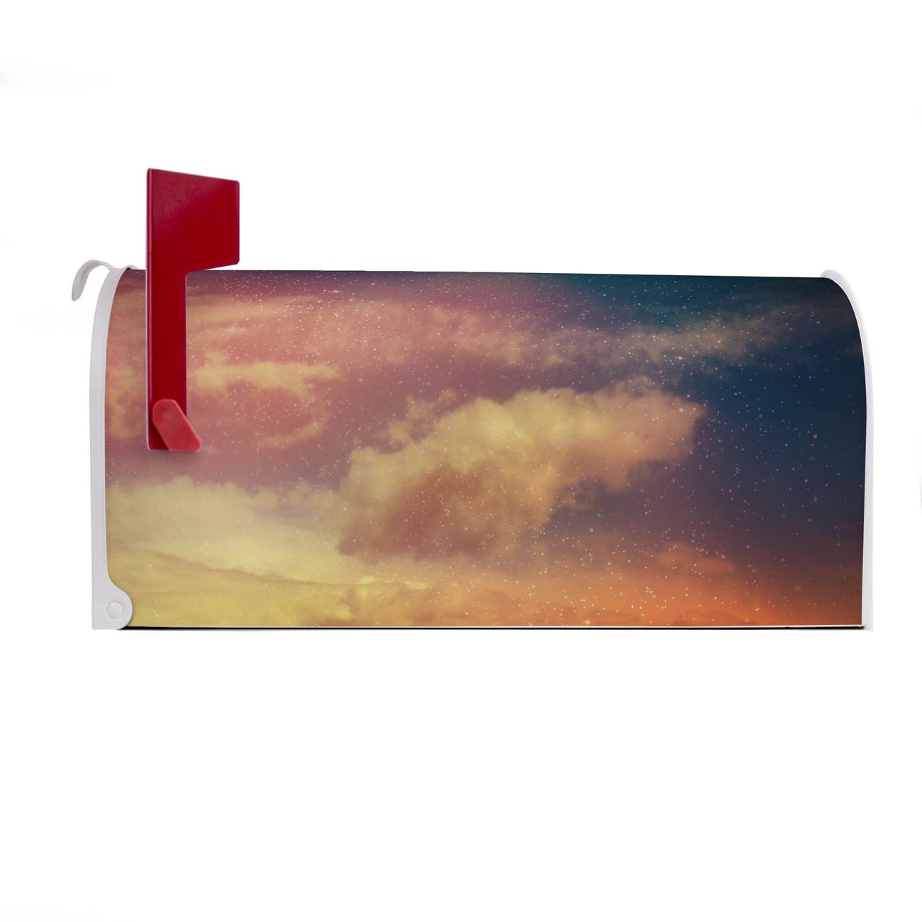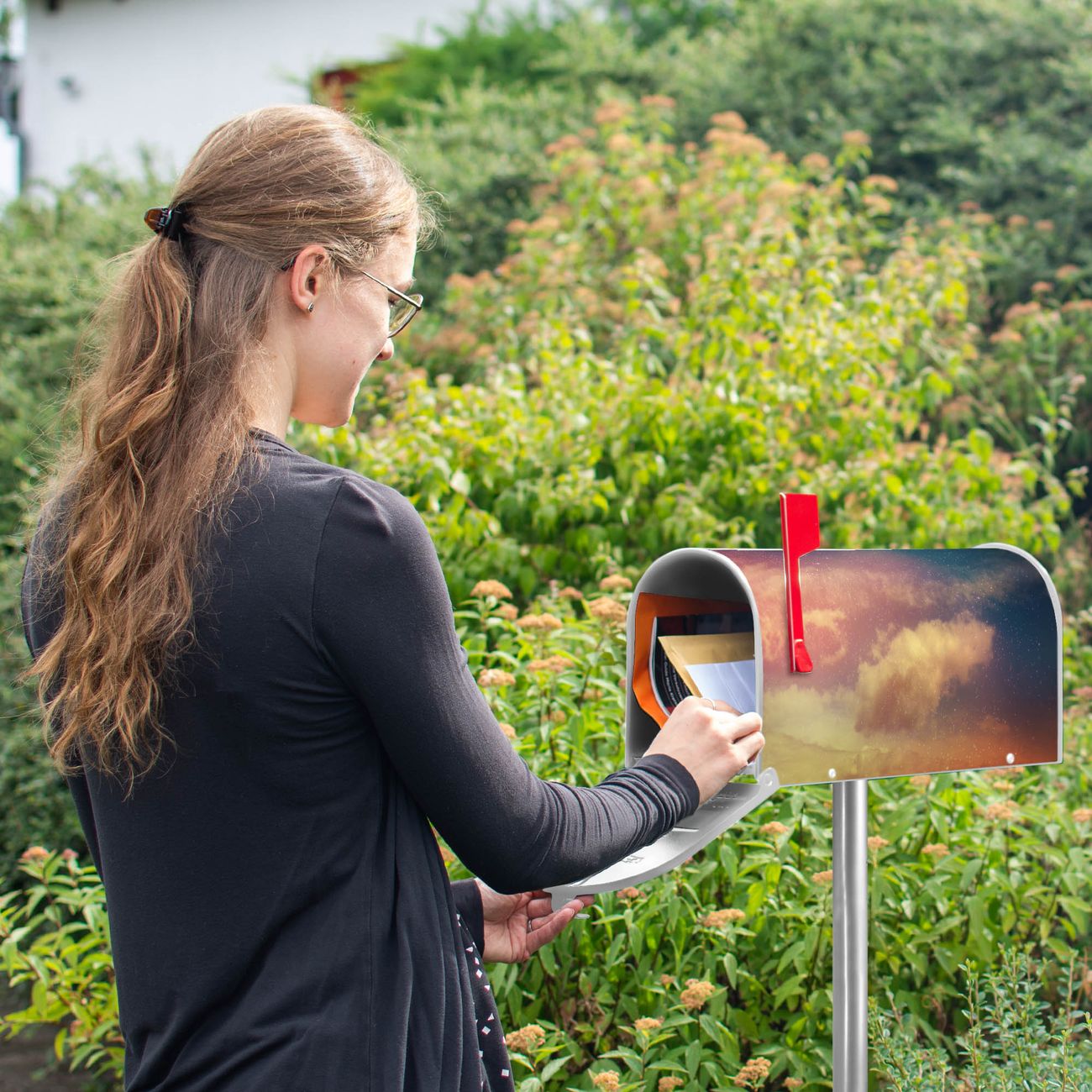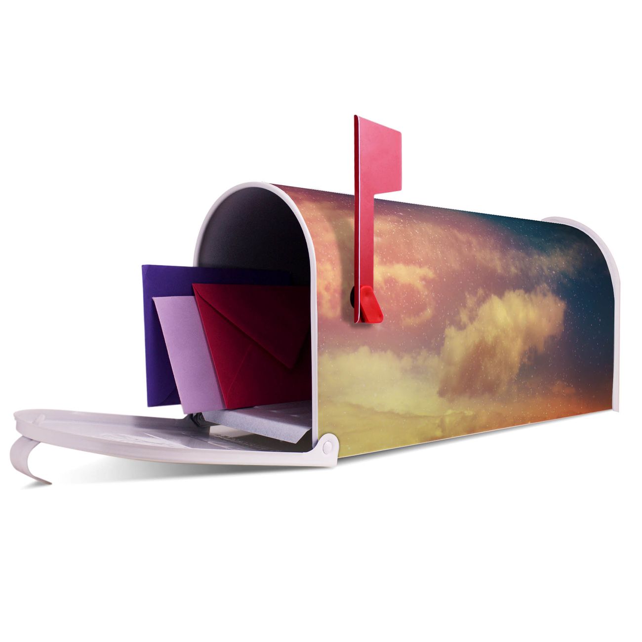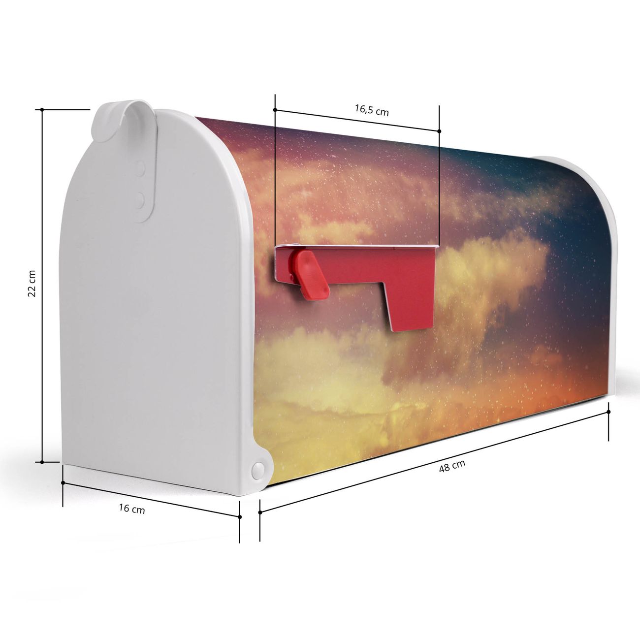 Der amerikanische Briefkasten von banjado mit Sternenhimmel Motiv bietet Ihnen ausreichend Fassungsvermögen, um große A4 Sendungen und Zeitschriften zu empfangen. Die typisch amerikanische rote Fahne zeigt Ihnen an, wenn Sie Post erhalten haben. Die US-Mailbox besteht aus verzinktem Stahlblech welches lackiert wurde und ist 48 x 22 x 16 CM (BxHxT) groß. Die Folie mit Motiv Sternenhimmel besteht aus einer wetter- und UV-resistenten Folie, die mit einem Schutzlaminat überzogen ist, sodass die US Mailbox zusätzlich vor Kratzern geschützt ist. An der Unterkante sind 4 Löcher je Seite um die Mailbox, typisch amerikanisch, an einem Holzpfahl oder einem Zaun zu befestigen. Auf Wunsch können Sie bei uns den passenden Standfuß oder die passende Wandhalterung kaufen um die US-Mailbox sicher zu befestigen. Wir bieten Ihnen ebenfalls Namensschilder, bereits beschriftet oder frei zu beschriften, und verschiedene selbst gestaltete Bitte-Keine-Werbung-Aufkleber.