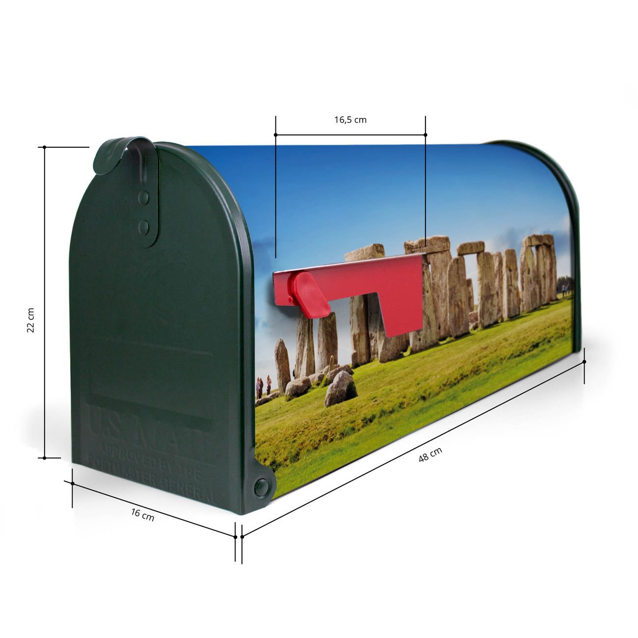 Der amerikanische Briefkasten von banjado mit Stonehenge Motiv bietet Ihnen ausreichend Fassungsvermögen, um große A4 Sendungen und Zeitschriften zu empfangen. Die typisch amerikanische rote Fahne zeigt Ihnen an, wenn Sie Post erhalten haben. Die US-Mailbox besteht aus verzinktem Stahlblech welches lackiert wurde und ist 48 x 22 x 16 CM (BxHxT) groß. Die Folie mit Motiv Stonehenge besteht aus einer wetter- und UV-resistenten Folie, die mit einem Schutzlaminat überzogen ist, sodass die US Mailbox zusätzlich vor Kratzern geschützt ist. An der Unterkante sind 4 Löcher je Seite um die Mailbox, typisch amerikanisch, an einem Holzpfahl oder einem Zaun zu befestigen. Auf Wunsch können Sie bei uns den passenden Standfuß oder die passende Wandhalterung kaufen um die US-Mailbox sicher zu befestigen. Wir bieten Ihnen ebenfalls Namensschilder, bereits beschriftet oder frei zu beschriften, und verschiedene selbst gestaltete Bitte-Keine-Werbung-Aufkleber.