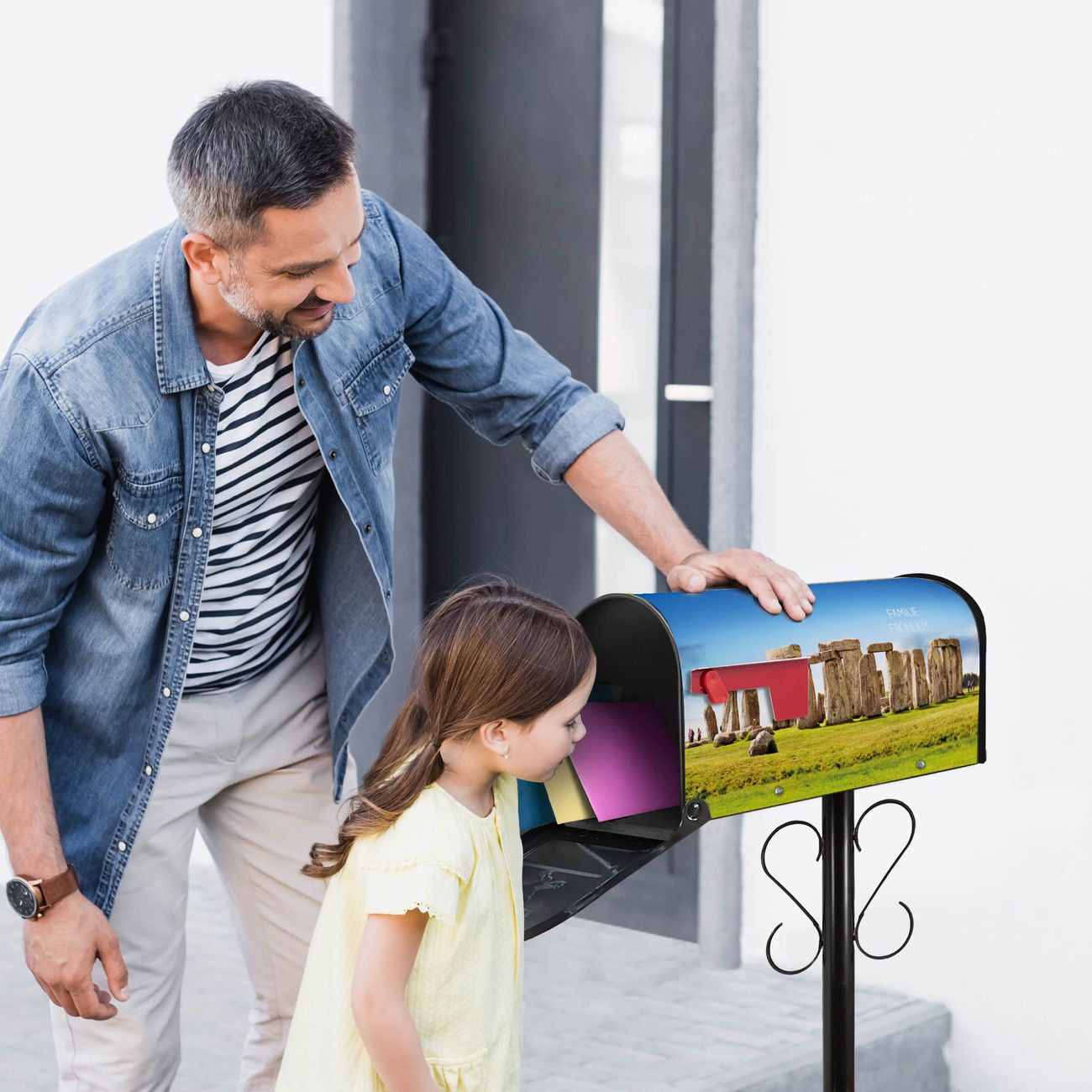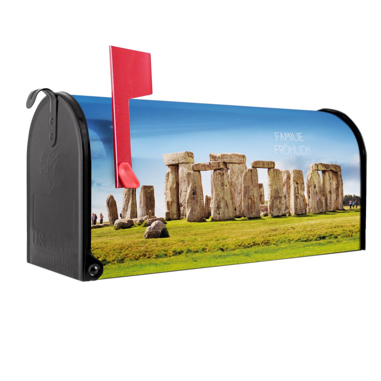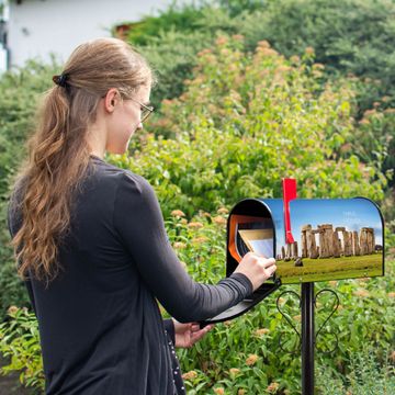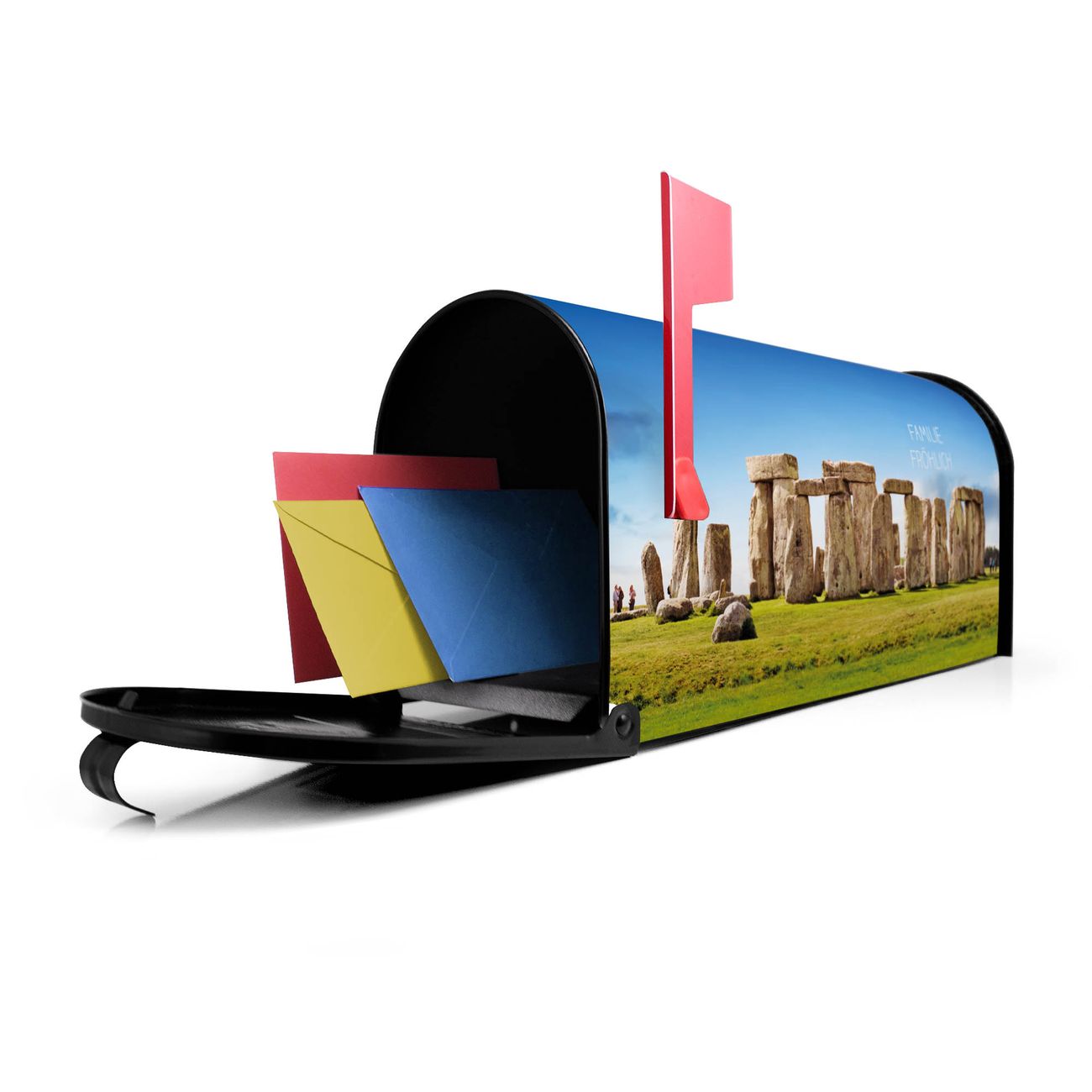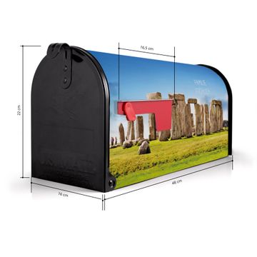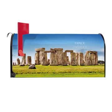 Der amerikanische Briefkasten von banjado mit Stonehenge Motiv bietet Ihnen ausreichend Fassungsvermögen, um große A4 Sendungen und Zeitschriften zu empfangen. Die typisch amerikanische rote Fahne zeigt Ihnen an, wenn Sie Post erhalten haben. Die US-Mailbox besteht aus verzinktem Stahlblech welches lackiert wurde und ist 48 x 22 x 16 CM (BxHxT) groß. Die Folie mit Motiv Stonehenge besteht aus einer wetter- und UV-resistenten Folie, die mit einem Schutzlaminat überzogen ist, sodass die US Mailbox zusätzlich vor Kratzern geschützt ist. An der Unterkante sind 4 Löcher je Seite um die Mailbox, typisch amerikanisch, an einem Holzpfahl oder einem Zaun zu befestigen. Auf Wunsch können Sie bei uns den passenden Standfuß oder die passende Wandhalterung kaufen um die US-Mailbox sicher zu befestigen. Wir bieten Ihnen ebenfalls Namensschilder, bereits beschriftet oder frei zu beschriften, und verschiedene selbst gestaltete Bitte-Keine-Werbung-Aufkleber.