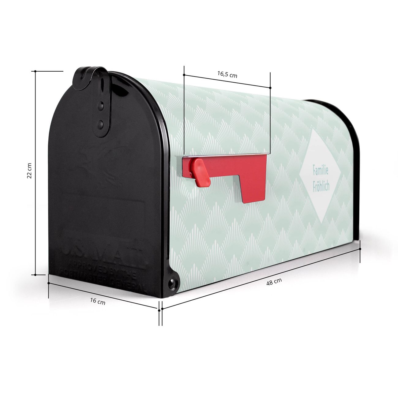Der amerikanische Briefkasten von banjado mit Strahlen Mint Motiv bietet Ihnen ausreichend Fassungsvermögen, um große A4 Sendungen und Zeitschriften zu empfangen. Die typisch amerikanische rote Fahne zeigt Ihnen an, wenn Sie Post erhalten haben. Die US-Mailbox besteht aus verzinktem Stahlblech welches lackiert wurde und ist 48 x 22 x 16 CM (BxHxT) groß. Die Folie mit Motiv Strahlen Mint besteht aus einer wetter- und UV-resistenten Folie, die mit einem Schutzlaminat überzogen ist, sodass die US Mailbox zusätzlich vor Kratzern geschützt ist. An der Unterkante sind 4 Löcher je Seite um die Mailbox, typisch amerikanisch, an einem Holzpfahl oder einem Zaun zu befestigen. Auf Wunsch können Sie bei uns den passenden Standfuß oder die passende Wandhalterung kaufen um die US-Mailbox sicher zu befestigen. Wir bieten Ihnen ebenfalls Namensschilder, bereits beschriftet oder frei zu beschriften, und verschiedene selbst gestaltete Bitte-Keine-Werbung-Aufkleber.