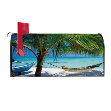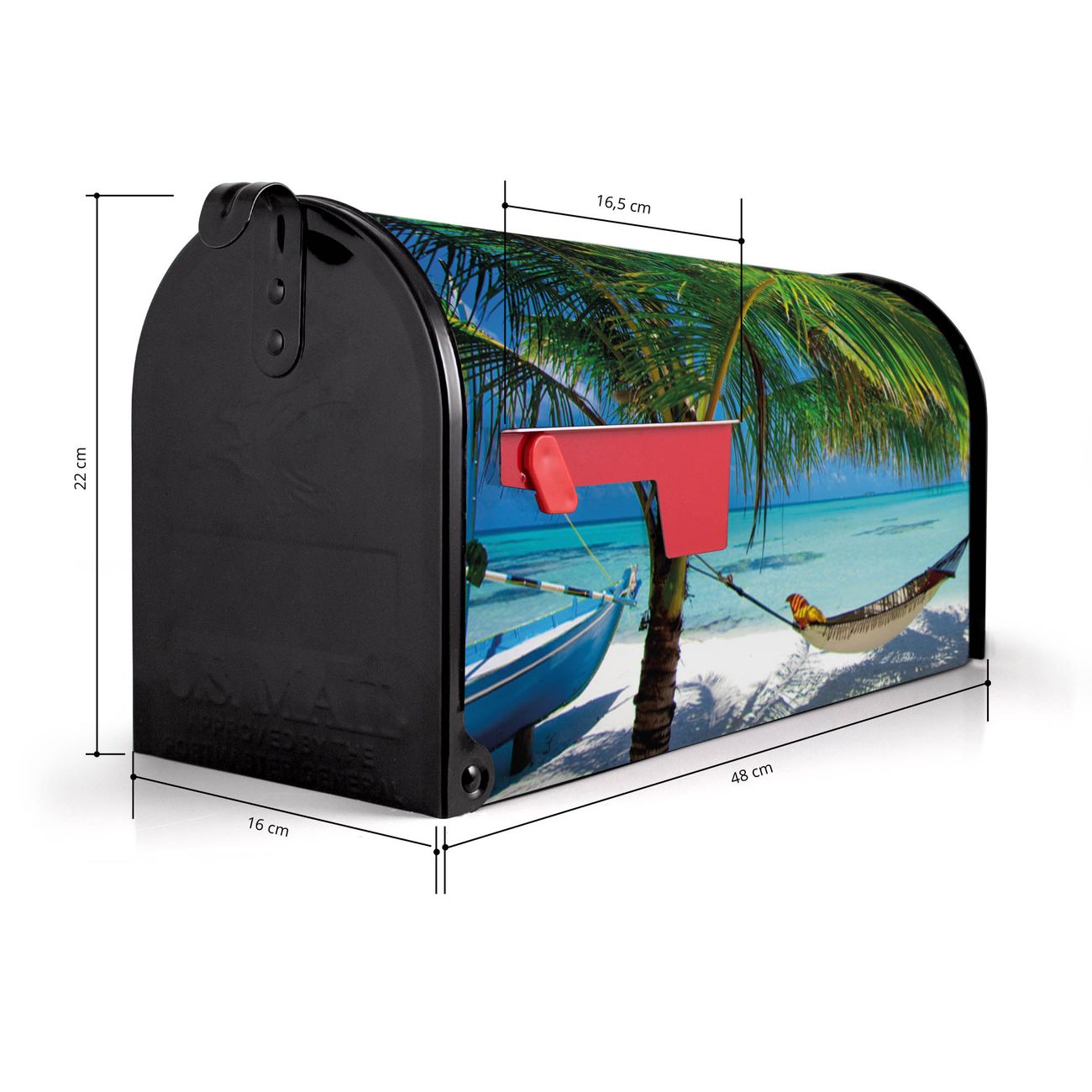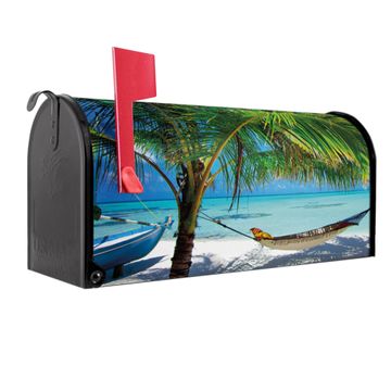 Der amerikanische Briefkasten von banjado mit Strand Motiv bietet Ihnen ausreichend Fassungsvermögen, um große A4 Sendungen und Zeitschriften zu empfangen. Die typisch amerikanische rote Fahne zeigt Ihnen an, wenn Sie Post erhalten haben. Die US-Mailbox besteht aus verzinktem Stahlblech welches lackiert wurde und ist 48 x 22 x 16 CM (BxHxT) groß. Die Folie mit Motiv Strand besteht aus einer wetter- und UV-resistenten Folie, die mit einem Schutzlaminat überzogen ist, sodass die US Mailbox zusätzlich vor Kratzern geschützt ist. An der Unterkante sind 4 Löcher je Seite um die Mailbox, typisch amerikanisch, an einem Holzpfahl oder einem Zaun zu befestigen. Auf Wunsch können Sie bei uns den passenden Standfuß oder die passende Wandhalterung kaufen um die US-Mailbox sicher zu befestigen. Wir bieten Ihnen ebenfalls Namensschilder, bereits beschriftet oder frei zu beschriften, und verschiedene selbst gestaltete Bitte-Keine-Werbung-Aufkleber.