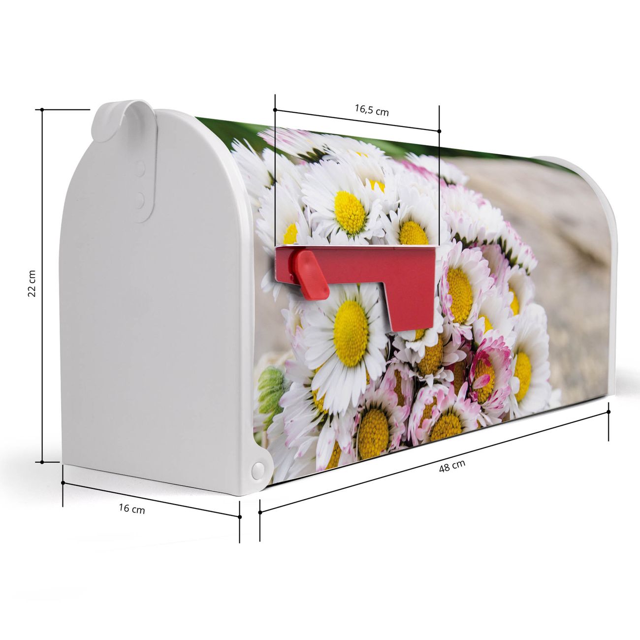 Der amerikanische Briefkasten von banjado mit Strauß Gänseblümchen Motiv bietet Ihnen ausreichend Fassungsvermögen, um große A4 Sendungen und Zeitschriften zu empfangen. Die typisch amerikanische rote Fahne zeigt Ihnen an, wenn Sie Post erhalten haben. Die US-Mailbox besteht aus verzinktem Stahlblech welches lackiert wurde und ist 48 x 22 x 16 CM (BxHxT) groß. Die Folie mit Motiv Strauß Gänseblümchen besteht aus einer wetter- und UV-resistenten Folie, die mit einem Schutzlaminat überzogen ist, sodass die US Mailbox zusätzlich vor Kratzern geschützt ist. An der Unterkante sind 4 Löcher je Seite um die Mailbox, typisch amerikanisch, an einem Holzpfahl oder einem Zaun zu befestigen. Auf Wunsch können Sie bei uns den passenden Standfuß oder die passende Wandhalterung kaufen um die US-Mailbox sicher zu befestigen. Wir bieten Ihnen ebenfalls Namensschilder, bereits beschriftet oder frei zu beschriften, und verschiedene selbst gestaltete Bitte-Keine-Werbung-Aufkleber.