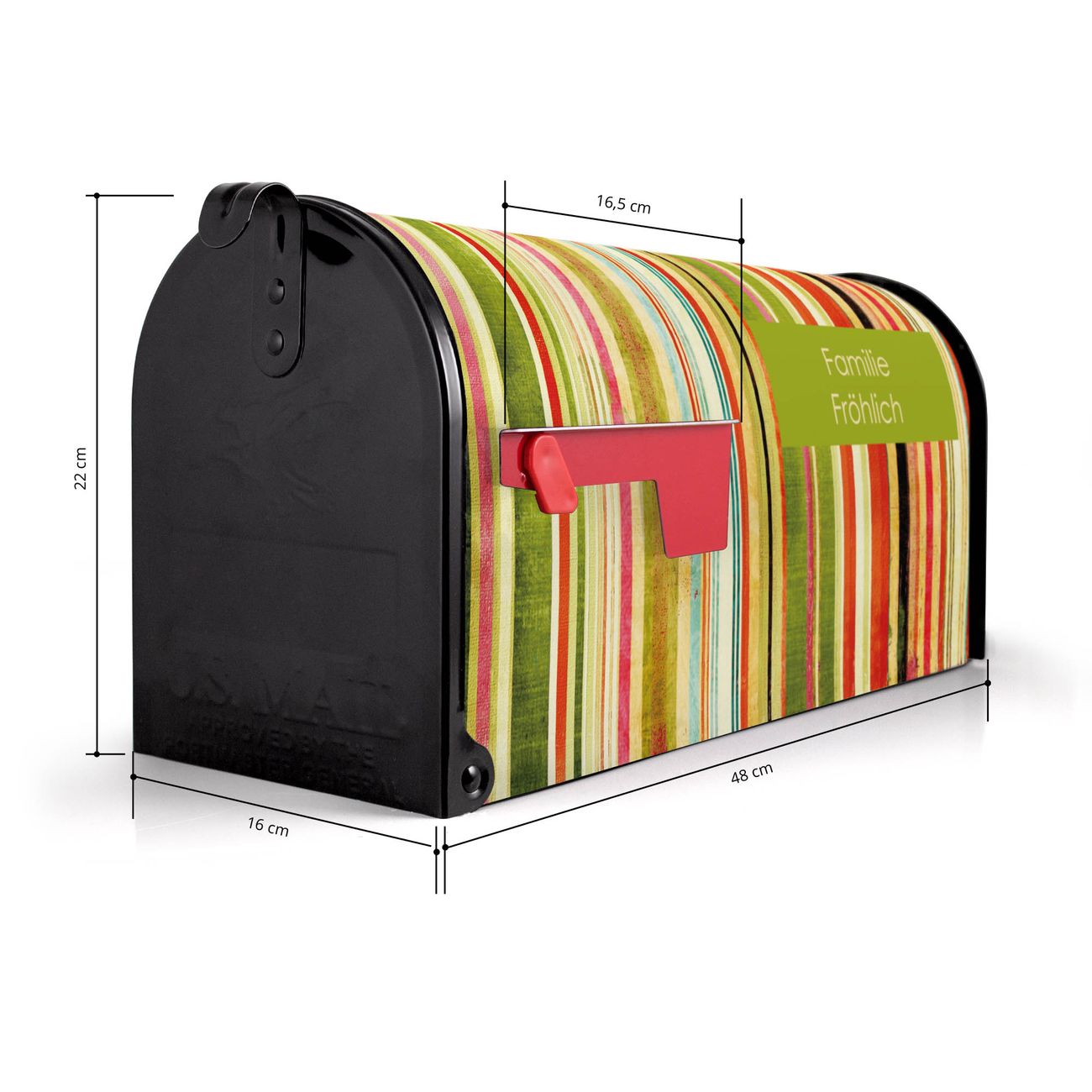Der amerikanische Briefkasten von banjado mit Streifen Motiv bietet Ihnen ausreichend Fassungsvermögen, um große A4 Sendungen und Zeitschriften zu empfangen. Die typisch amerikanische rote Fahne zeigt Ihnen an, wenn Sie Post erhalten haben. Die US-Mailbox besteht aus verzinktem Stahlblech welches lackiert wurde und ist 48 x 22 x 16 CM (BxHxT) groß. Die Folie mit Motiv Streifen besteht aus einer wetter- und UV-resistenten Folie, die mit einem Schutzlaminat überzogen ist, sodass die US Mailbox zusätzlich vor Kratzern geschützt ist. An der Unterkante sind 4 Löcher je Seite um die Mailbox, typisch amerikanisch, an einem Holzpfahl oder einem Zaun zu befestigen. Auf Wunsch können Sie bei uns den passenden Standfuß oder die passende Wandhalterung kaufen um die US-Mailbox sicher zu befestigen. Wir bieten Ihnen ebenfalls Namensschilder, bereits beschriftet oder frei zu beschriften, und verschiedene selbst gestaltete Bitte-Keine-Werbung-Aufkleber.