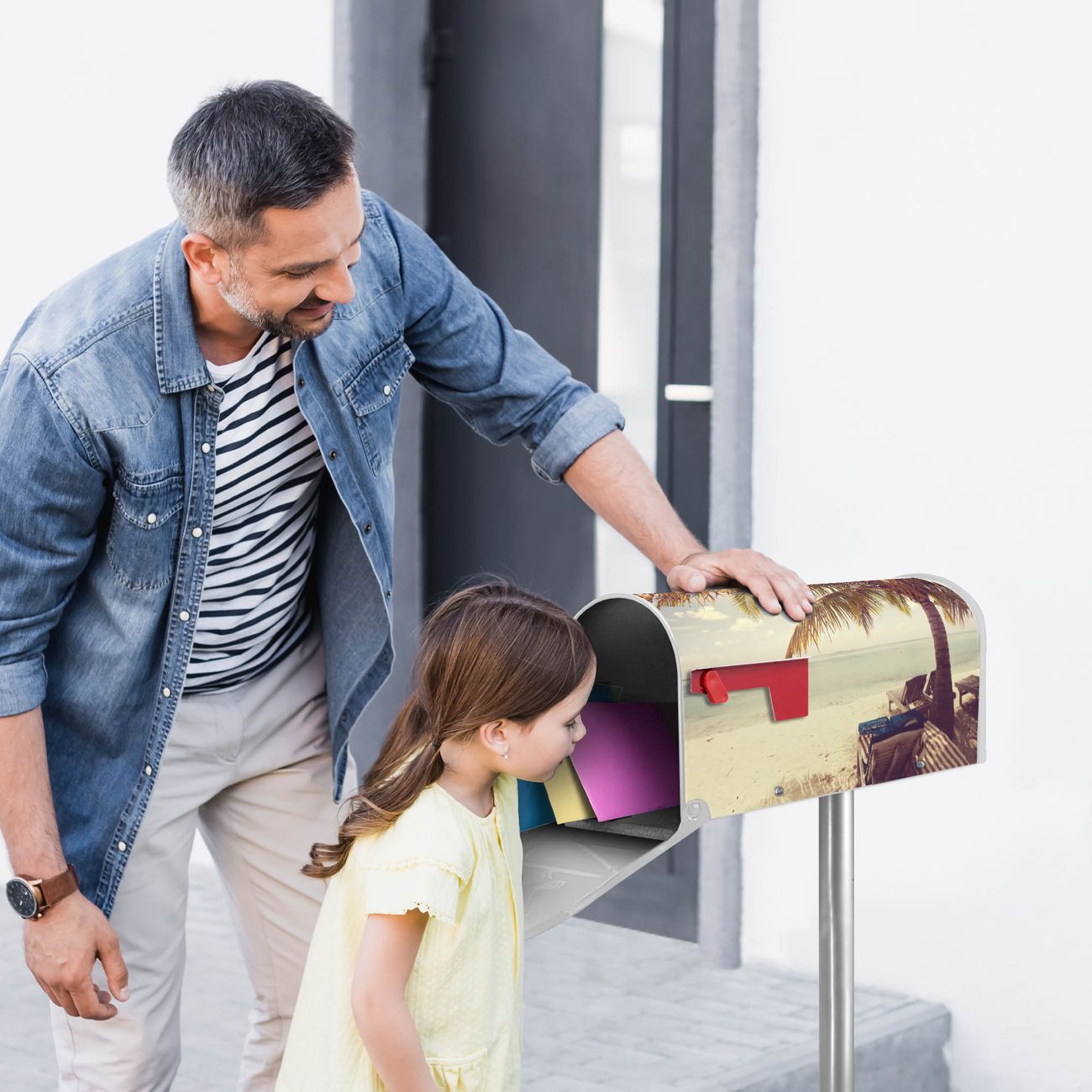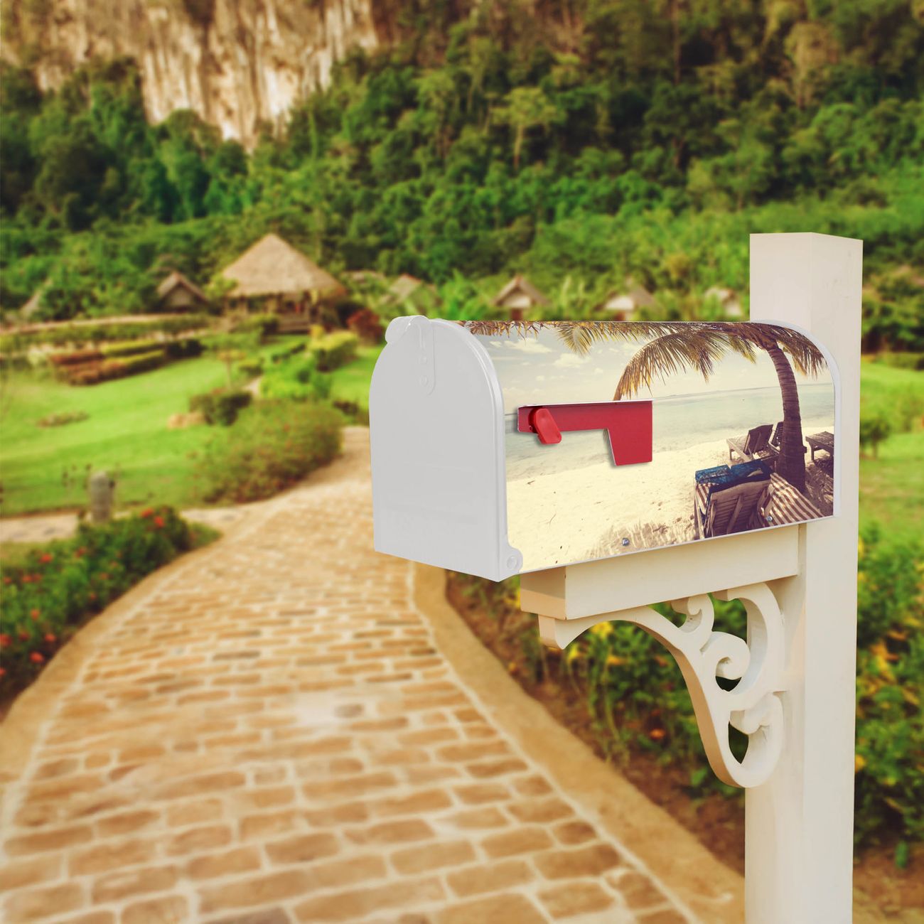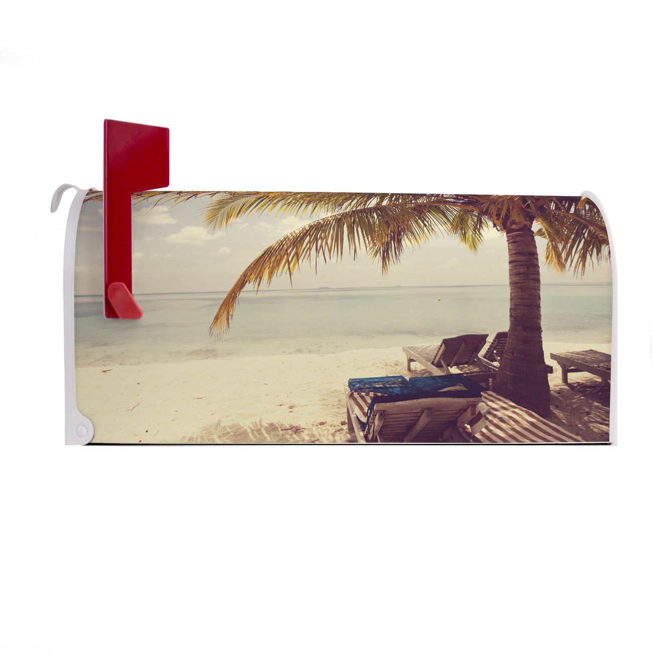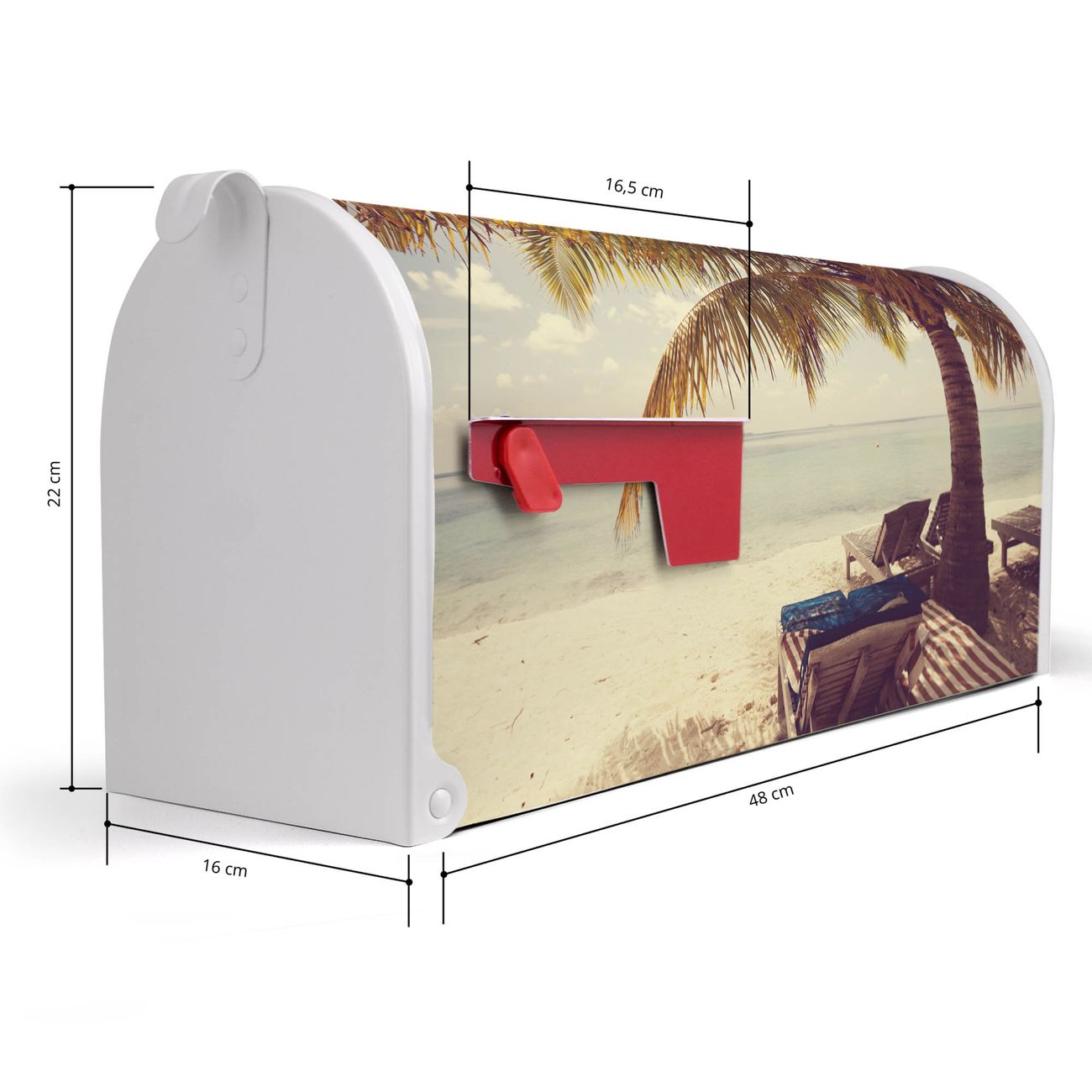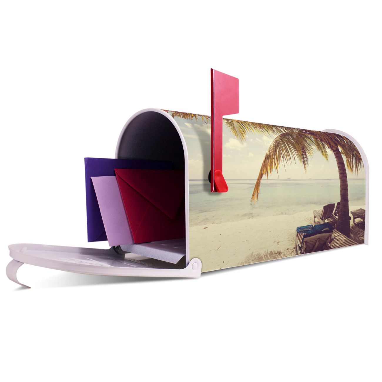 Der amerikanische Briefkasten von banjado mit Südseestrand Motiv bietet Ihnen ausreichend Fassungsvermögen, um große A4 Sendungen und Zeitschriften zu empfangen. Die typisch amerikanische rote Fahne zeigt Ihnen an, wenn Sie Post erhalten haben. Die US-Mailbox besteht aus verzinktem Stahlblech welches lackiert wurde und ist 48 x 22 x 16 CM (BxHxT) groß. Die Folie mit Motiv Südseestrand besteht aus einer wetter- und UV-resistenten Folie, die mit einem Schutzlaminat überzogen ist, sodass die US Mailbox zusätzlich vor Kratzern geschützt ist. An der Unterkante sind 4 Löcher je Seite um die Mailbox, typisch amerikanisch, an einem Holzpfahl oder einem Zaun zu befestigen. Auf Wunsch können Sie bei uns den passenden Standfuß oder die passende Wandhalterung kaufen um die US-Mailbox sicher zu befestigen. Wir bieten Ihnen ebenfalls Namensschilder, bereits beschriftet oder frei zu beschriften, und verschiedene selbst gestaltete Bitte-Keine-Werbung-Aufkleber.