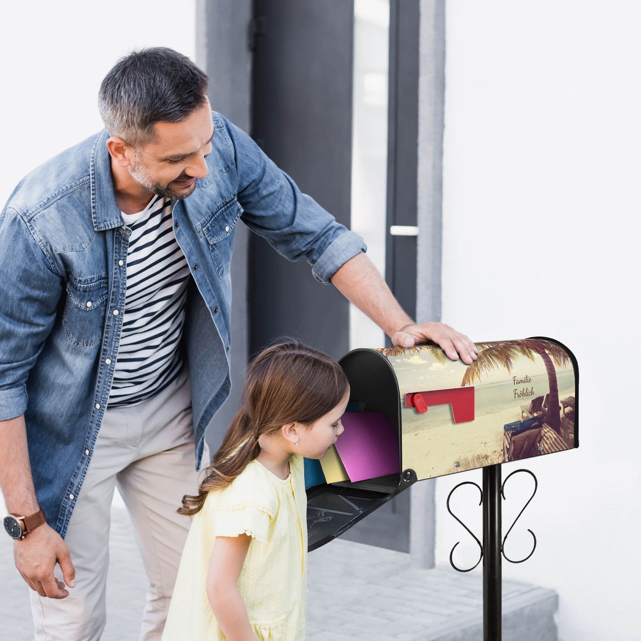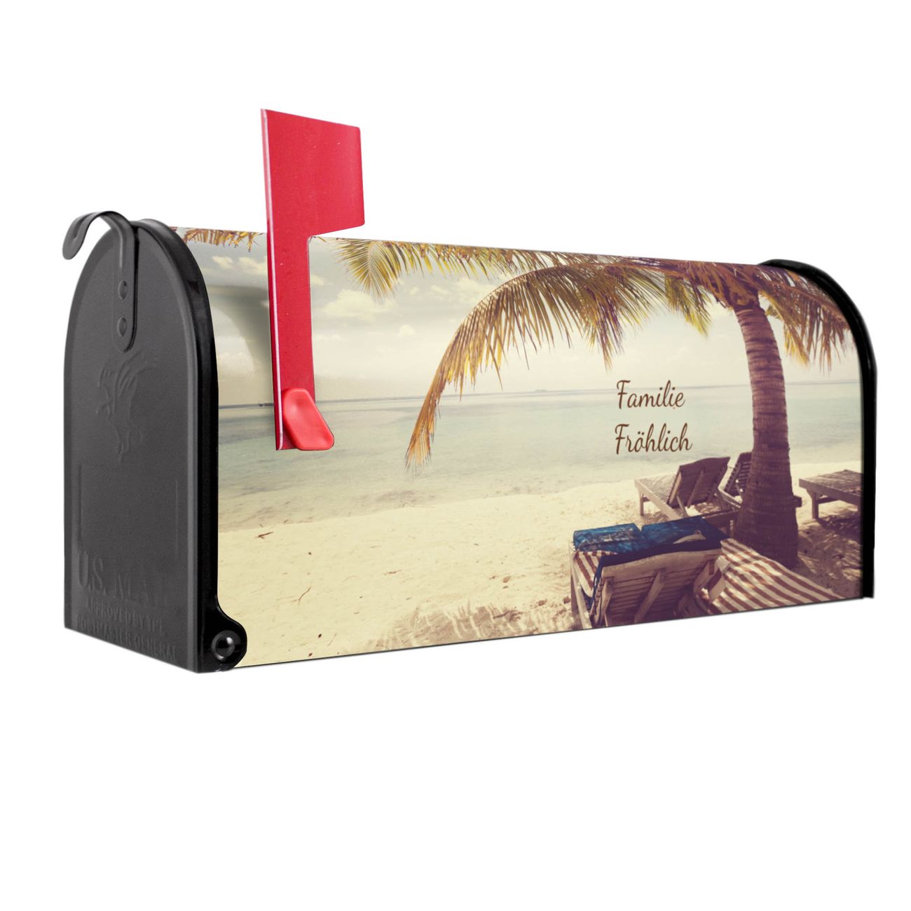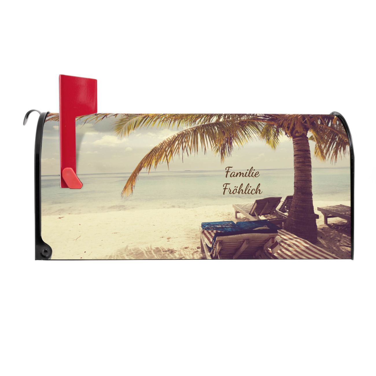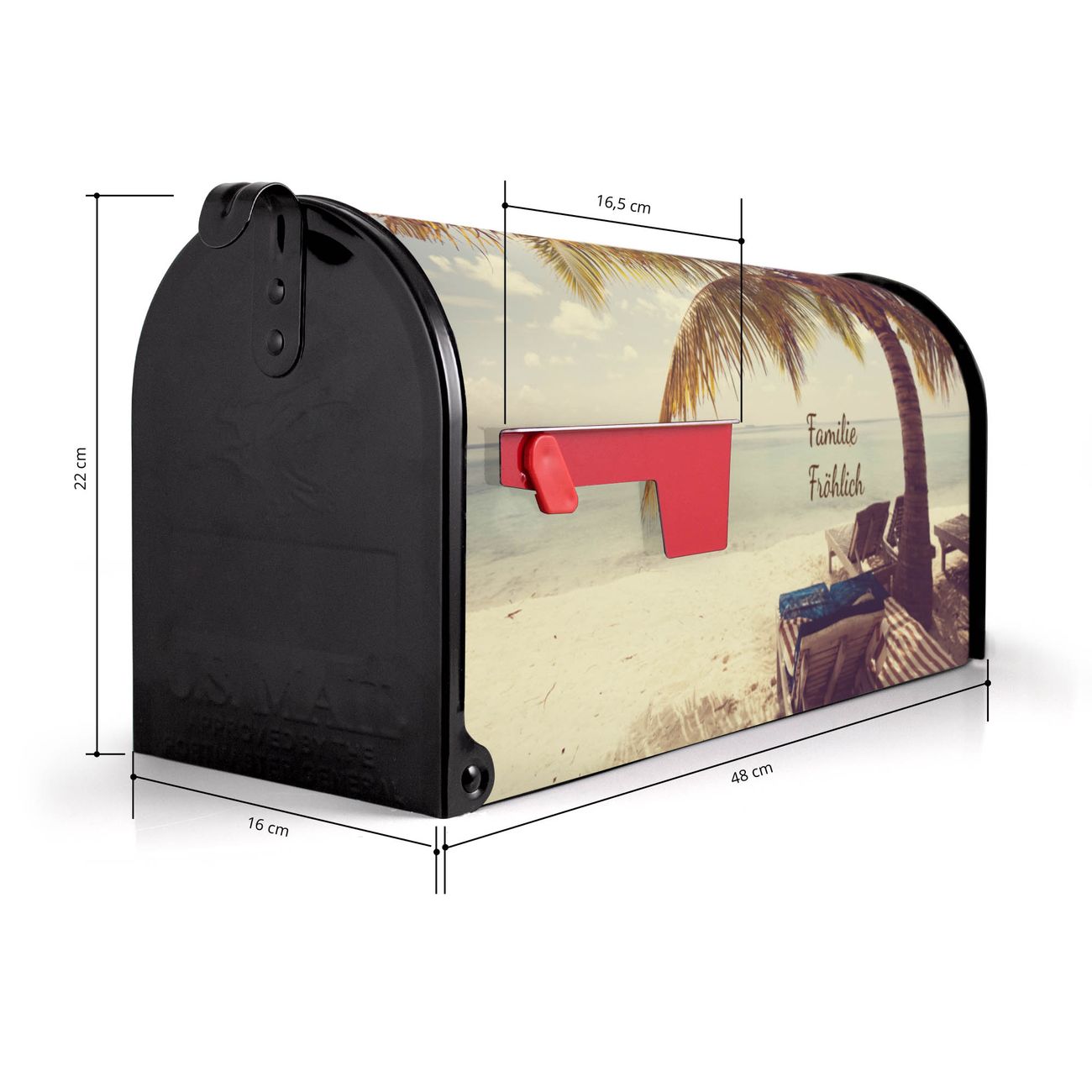 Der amerikanische Briefkasten von banjado mit Südseestrand Motiv bietet Ihnen ausreichend Fassungsvermögen, um große A4 Sendungen und Zeitschriften zu empfangen. Die typisch amerikanische rote Fahne zeigt Ihnen an, wenn Sie Post erhalten haben. Die US-Mailbox besteht aus verzinktem Stahlblech welches lackiert wurde und ist 48 x 22 x 16 CM (BxHxT) groß. Die Folie mit Motiv Südseestrand besteht aus einer wetter- und UV-resistenten Folie, die mit einem Schutzlaminat überzogen ist, sodass die US Mailbox zusätzlich vor Kratzern geschützt ist. An der Unterkante sind 4 Löcher je Seite um die Mailbox, typisch amerikanisch, an einem Holzpfahl oder einem Zaun zu befestigen. Auf Wunsch können Sie bei uns den passenden Standfuß oder die passende Wandhalterung kaufen um die US-Mailbox sicher zu befestigen. Wir bieten Ihnen ebenfalls Namensschilder, bereits beschriftet oder frei zu beschriften, und verschiedene selbst gestaltete Bitte-Keine-Werbung-Aufkleber.