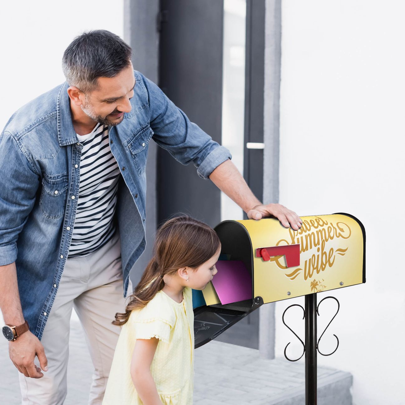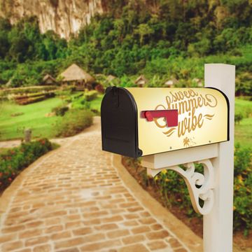Der amerikanische Briefkasten von banjado mit Summer Wibe Motiv bietet Ihnen ausreichend Fassungsvermögen, um große A4 Sendungen und Zeitschriften zu empfangen. Die typisch amerikanische rote Fahne zeigt Ihnen an, wenn Sie Post erhalten haben. Die US-Mailbox besteht aus verzinktem Stahlblech welches lackiert wurde und ist 48 x 22 x 16 CM (BxHxT) groß. Die Folie mit Motiv Summer Wibe besteht aus einer wetter- und UV-resistenten Folie, die mit einem Schutzlaminat überzogen ist, sodass die US Mailbox zusätzlich vor Kratzern geschützt ist. An der Unterkante sind 4 Löcher je Seite um die Mailbox, typisch amerikanisch, an einem Holzpfahl oder einem Zaun zu befestigen. Auf Wunsch können Sie bei uns den passenden Standfuß oder die passende Wandhalterung kaufen um die US-Mailbox sicher zu befestigen. Wir bieten Ihnen ebenfalls Namensschilder, bereits beschriftet oder frei zu beschriften, und verschiedene selbst gestaltete Bitte-Keine-Werbung-Aufkleber.