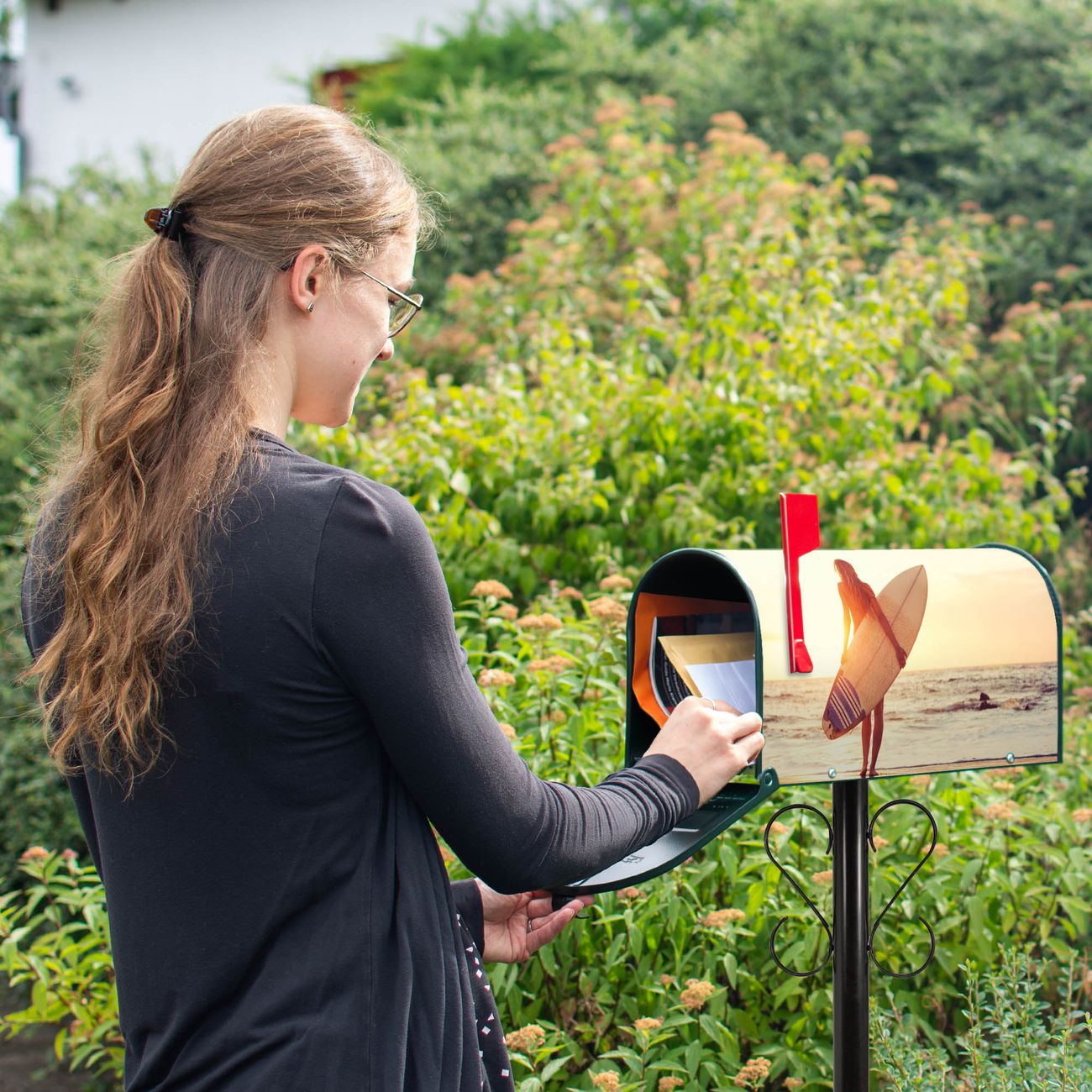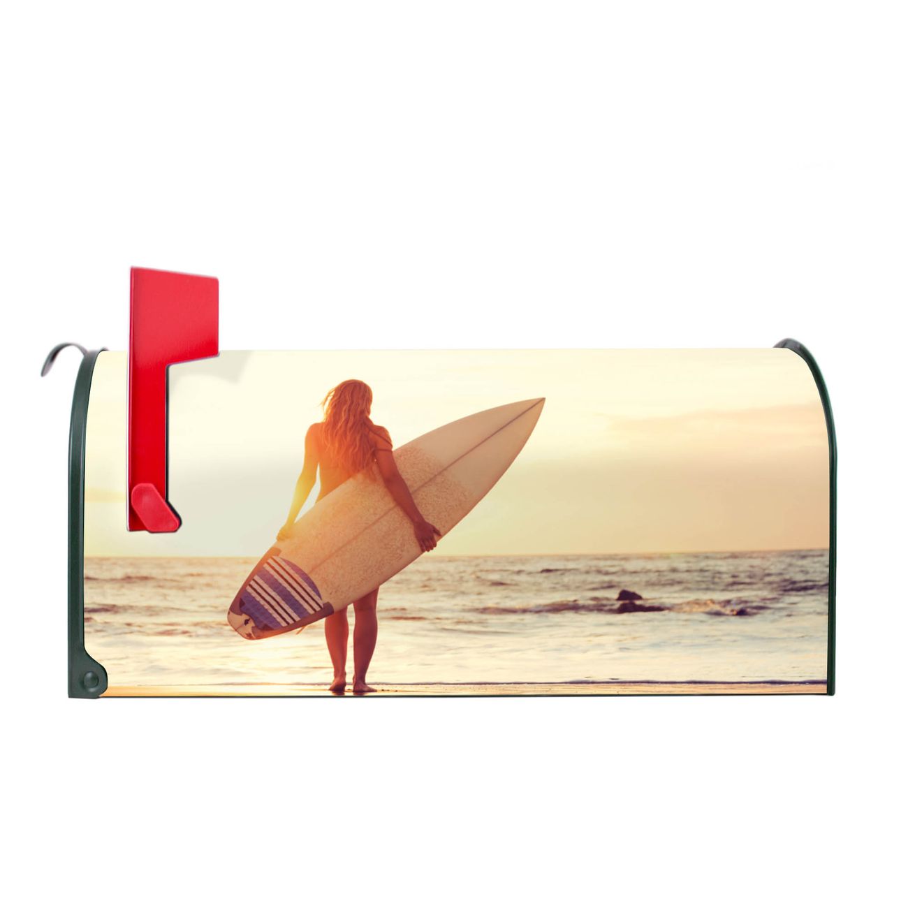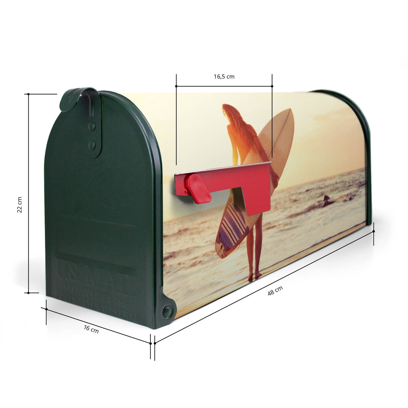 Der amerikanische Briefkasten von banjado mit Surfer Girl Motiv bietet Ihnen ausreichend Fassungsvermögen, um große A4 Sendungen und Zeitschriften zu empfangen. Die typisch amerikanische rote Fahne zeigt Ihnen an, wenn Sie Post erhalten haben. Die US-Mailbox besteht aus verzinktem Stahlblech welches lackiert wurde und ist 48 x 22 x 16 CM (BxHxT) groß. Die Folie mit Motiv Surfer Girl besteht aus einer wetter- und UV-resistenten Folie, die mit einem Schutzlaminat überzogen ist, sodass die US Mailbox zusätzlich vor Kratzern geschützt ist. An der Unterkante sind 4 Löcher je Seite um die Mailbox, typisch amerikanisch, an einem Holzpfahl oder einem Zaun zu befestigen. Auf Wunsch können Sie bei uns den passenden Standfuß oder die passende Wandhalterung kaufen um die US-Mailbox sicher zu befestigen. Wir bieten Ihnen ebenfalls Namensschilder, bereits beschriftet oder frei zu beschriften, und verschiedene selbst gestaltete Bitte-Keine-Werbung-Aufkleber.