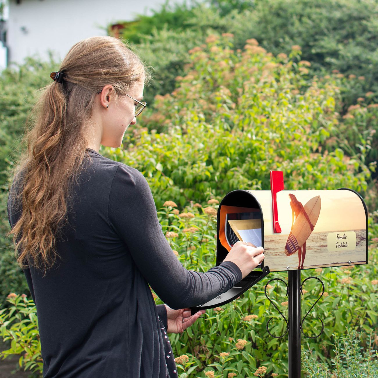 Unser amerikanischer Briefkasten mit dem Motiv Surfer Girl hat ein sehr ansprechendes und ausgefallenes Design, ist in der Grundfarbe weiß, grün oder schwarz erhältlich. Damit entlocken Sie Ihren Nachbarn und dem Postboten immer wieder ein Lächeln. Die Mailbox ist ein Original Import aus Mississippi USA und wird von unserer kleinen Manufaktur in Sachsen von Hand veredelt. Die US-Mailbox bietet ausreichend Platz auch für große Sendungen, eine Fahne die Ihnen Post anzeigt, wetterfestes und äußerst stabiles Material - so macht Post empfangen Freude.