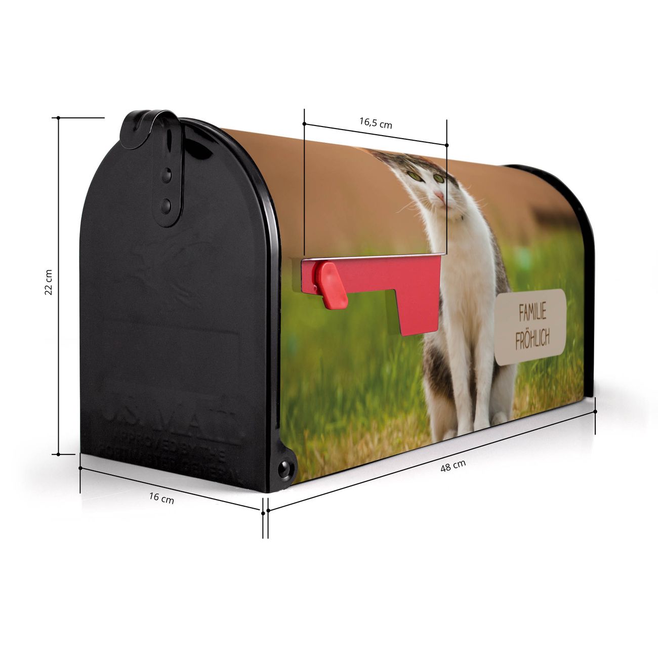 Der amerikanische Briefkasten von banjado mit Suse Motiv bietet Ihnen ausreichend Fassungsvermögen, um große A4 Sendungen und Zeitschriften zu empfangen. Die typisch amerikanische rote Fahne zeigt Ihnen an, wenn Sie Post erhalten haben. Die US-Mailbox besteht aus verzinktem Stahlblech welches lackiert wurde und ist 48 x 22 x 16 CM (BxHxT) groß. Die Folie mit Motiv Suse besteht aus einer wetter- und UV-resistenten Folie, die mit einem Schutzlaminat überzogen ist, sodass die US Mailbox zusätzlich vor Kratzern geschützt ist. An der Unterkante sind 4 Löcher je Seite um die Mailbox, typisch amerikanisch, an einem Holzpfahl oder einem Zaun zu befestigen. Auf Wunsch können Sie bei uns den passenden Standfuß oder die passende Wandhalterung kaufen um die US-Mailbox sicher zu befestigen. Wir bieten Ihnen ebenfalls Namensschilder, bereits beschriftet oder frei zu beschriften, und verschiedene selbst gestaltete Bitte-Keine-Werbung-Aufkleber.