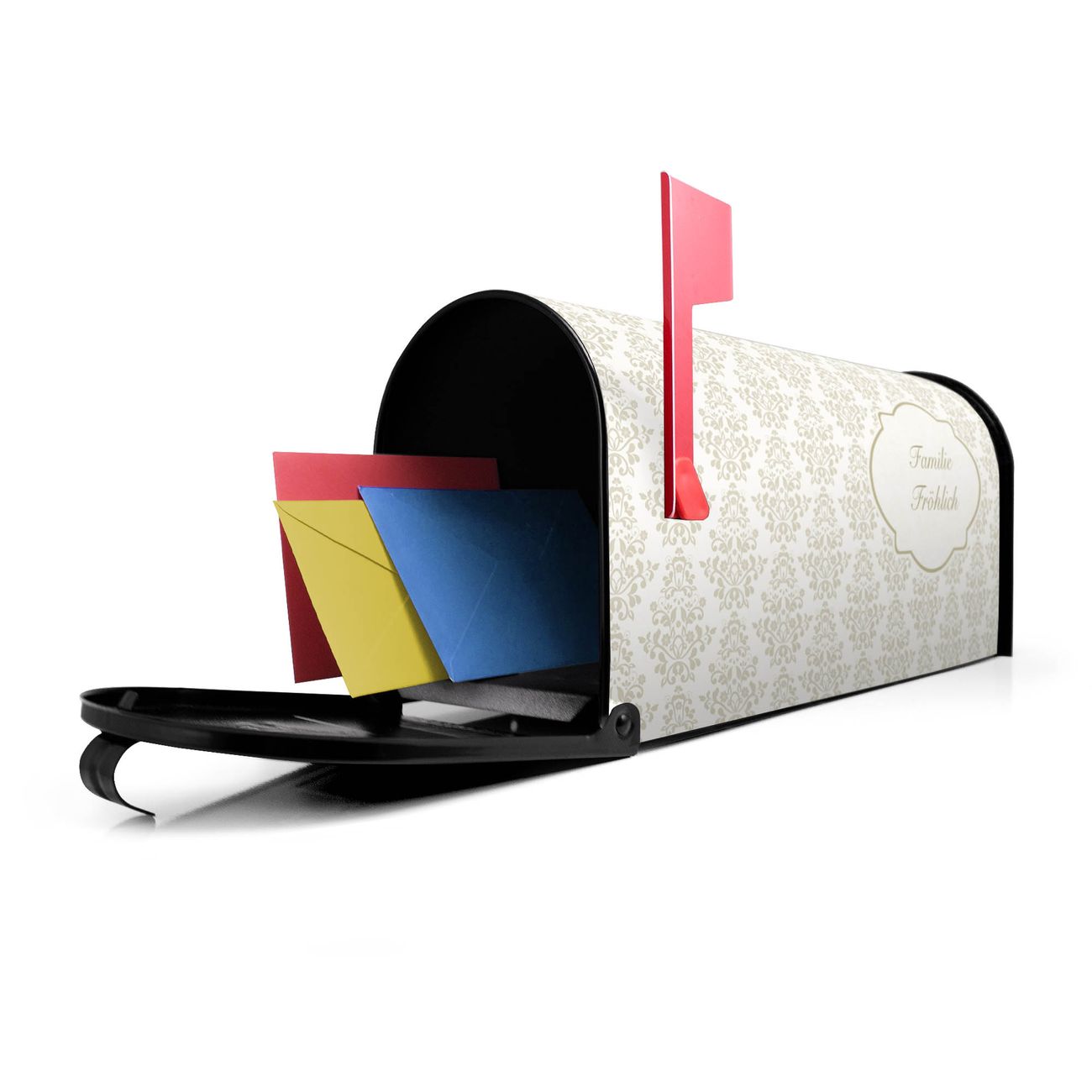 Der amerikanische Briefkasten von banjado mit WT Tapete Motiv bietet Ihnen ausreichend Fassungsvermögen, um große A4 Sendungen und Zeitschriften zu empfangen. Die typisch amerikanische rote Fahne zeigt Ihnen an, wenn Sie Post erhalten haben. Die US-Mailbox besteht aus verzinktem Stahlblech welches lackiert wurde und ist 48 x 22 x 16 CM (BxHxT) groß. Die Folie mit Motiv WT Tapete besteht aus einer wetter- und UV-resistenten Folie, die mit einem Schutzlaminat überzogen ist, sodass die US Mailbox zusätzlich vor Kratzern geschützt ist. An der Unterkante sind 4 Löcher je Seite um die Mailbox, typisch amerikanisch, an einem Holzpfahl oder einem Zaun zu befestigen. Auf Wunsch können Sie bei uns den passenden Standfuß oder die passende Wandhalterung kaufen um die US-Mailbox sicher zu befestigen. Wir bieten Ihnen ebenfalls Namensschilder, bereits beschriftet oder frei zu beschriften, und verschiedene selbst gestaltete Bitte-Keine-Werbung-Aufkleber.
