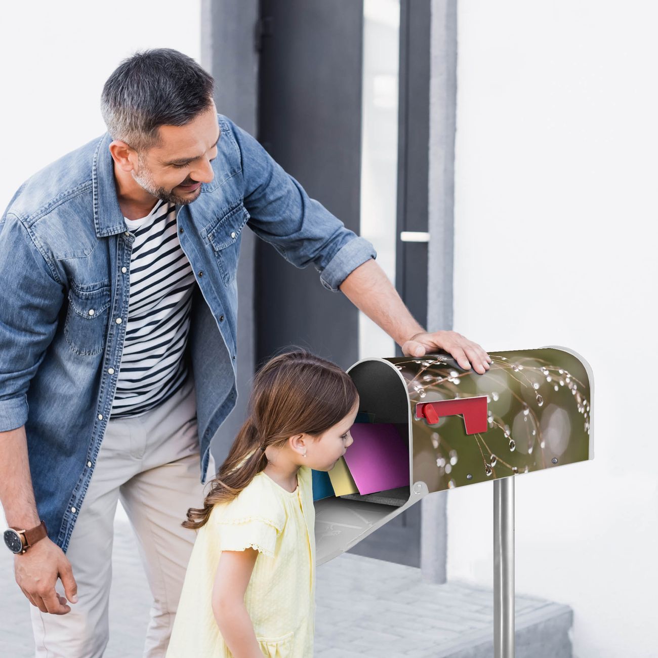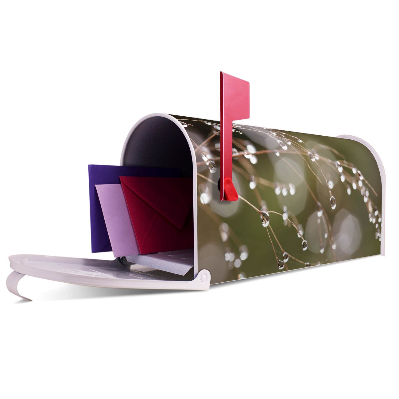 Unser amerikanischer Briefkasten mit dem Motiv Tau Auf Zweigen hat ein sehr ansprechendes und ausgefallenes Design, ist in der Grundfarbe weiß, grün oder schwarz erhältlich. Damit entlocken Sie Ihren Nachbarn und dem Postboten immer wieder ein Lächeln. Die Mailbox ist ein Original Import aus Mississippi USA und wird von unserer kleinen Manufaktur in Sachsen von Hand veredelt. Die US-Mailbox bietet ausreichend Platz auch für große Sendungen, eine Fahne die Ihnen Post anzeigt, wetterfestes und äußerst stabiles Material - so macht Post empfangen Freude.
