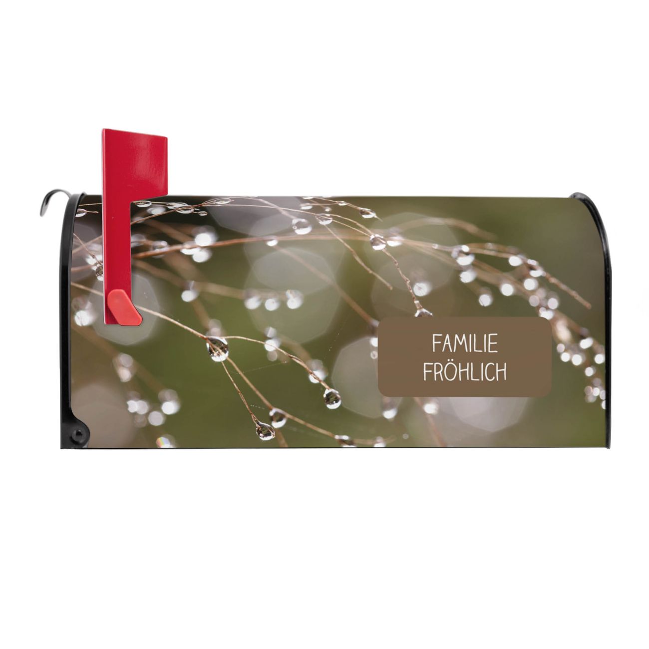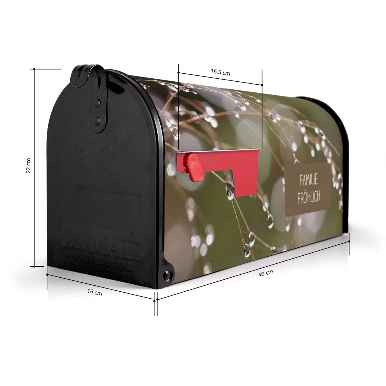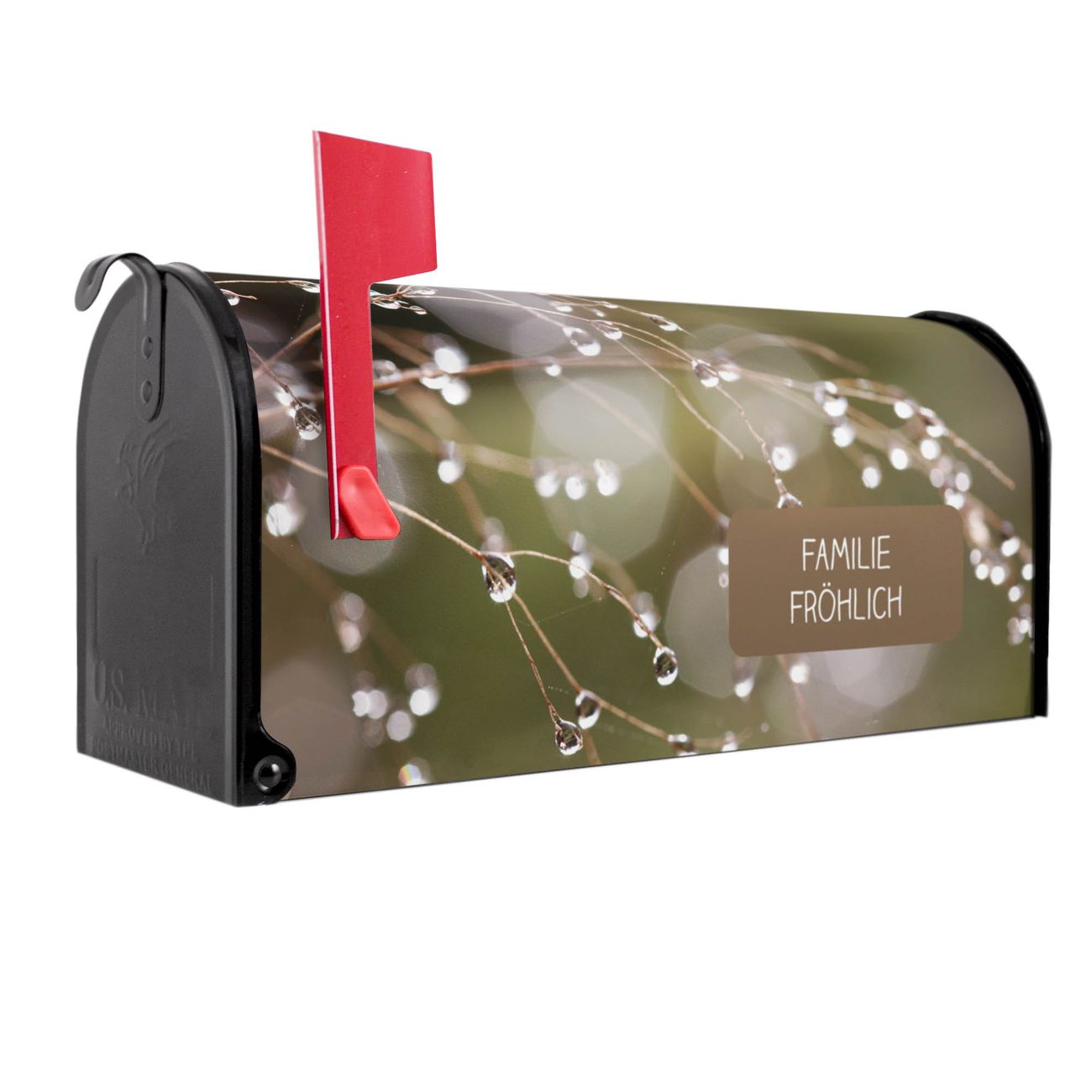 Der amerikanische Briefkasten von banjado mit Tau Auf Zweigen Motiv bietet Ihnen ausreichend Fassungsvermögen, um große A4 Sendungen und Zeitschriften zu empfangen. Die typisch amerikanische rote Fahne zeigt Ihnen an, wenn Sie Post erhalten haben. Die US-Mailbox besteht aus verzinktem Stahlblech welches lackiert wurde und ist 48 x 22 x 16 CM (BxHxT) groß. Die Folie mit Motiv Tau Auf Zweigen besteht aus einer wetter- und UV-resistenten Folie, die mit einem Schutzlaminat überzogen ist, sodass die US Mailbox zusätzlich vor Kratzern geschützt ist. An der Unterkante sind 4 Löcher je Seite um die Mailbox, typisch amerikanisch, an einem Holzpfahl oder einem Zaun zu befestigen. Auf Wunsch können Sie bei uns den passenden Standfuß oder die passende Wandhalterung kaufen um die US-Mailbox sicher zu befestigen. Wir bieten Ihnen ebenfalls Namensschilder, bereits beschriftet oder frei zu beschriften, und verschiedene selbst gestaltete Bitte-Keine-Werbung-Aufkleber.