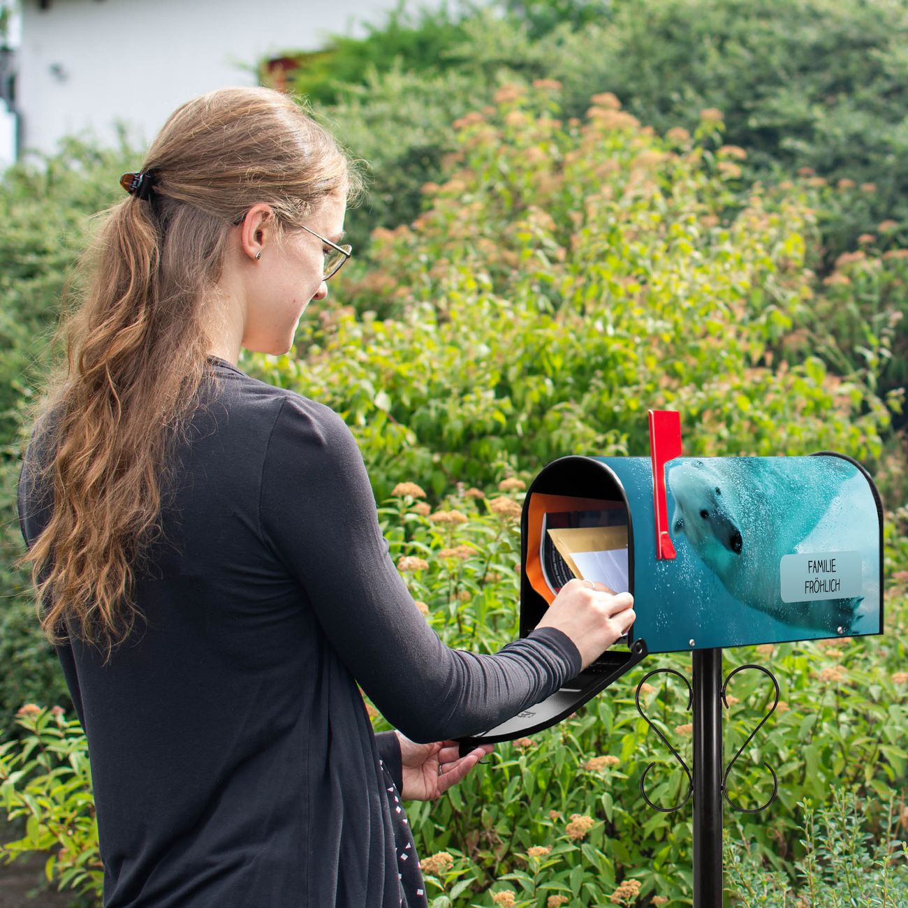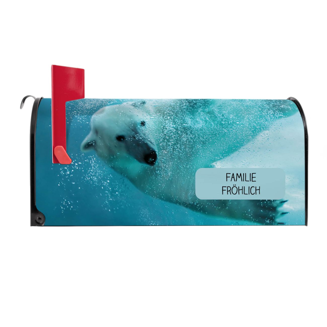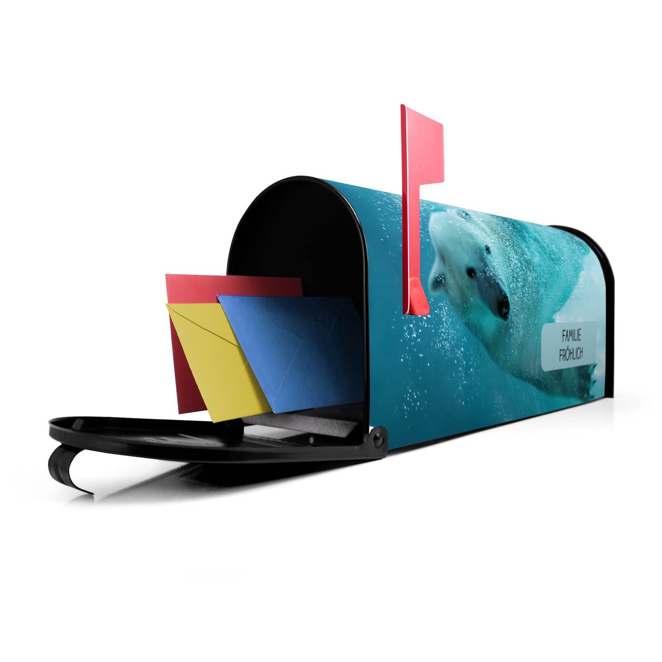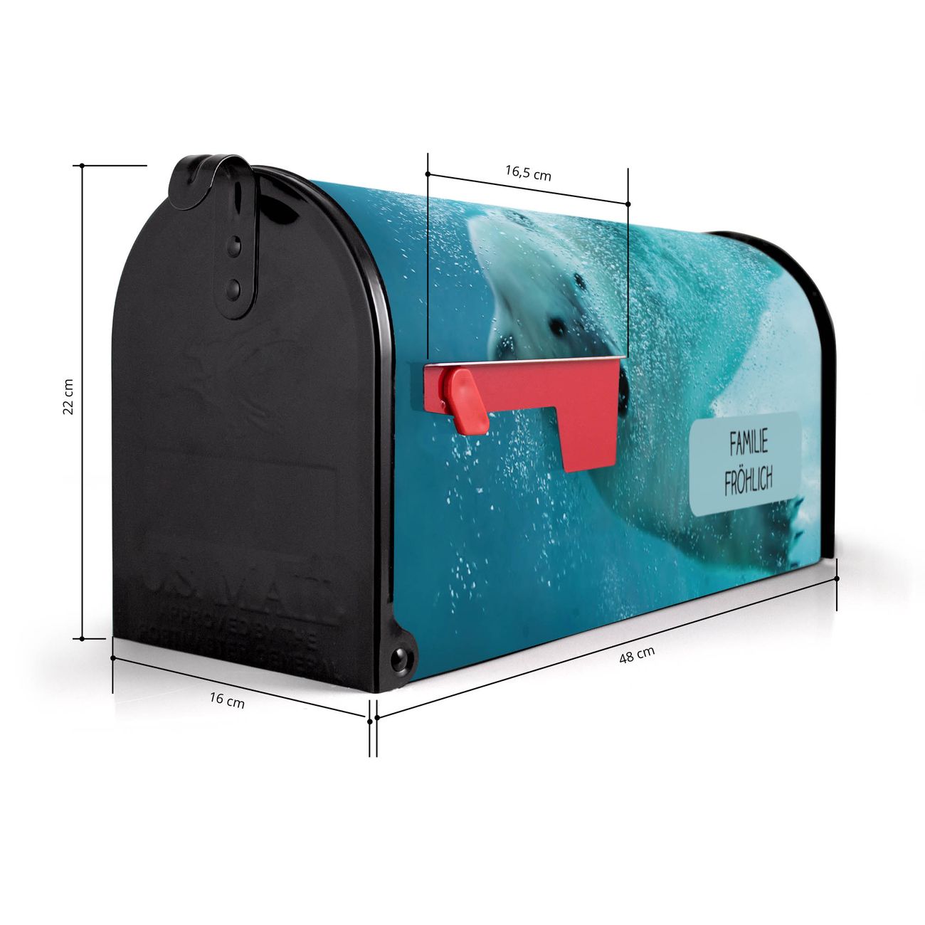 Der amerikanische Briefkasten von banjado mit Tauchender Eisbär Motiv bietet Ihnen ausreichend Fassungsvermögen, um große A4 Sendungen und Zeitschriften zu empfangen. Die typisch amerikanische rote Fahne zeigt Ihnen an, wenn Sie Post erhalten haben. Die US-Mailbox besteht aus verzinktem Stahlblech welches lackiert wurde und ist 48 x 22 x 16 CM (BxHxT) groß. Die Folie mit Motiv Tauchender Eisbär besteht aus einer wetter- und UV-resistenten Folie, die mit einem Schutzlaminat überzogen ist, sodass die US Mailbox zusätzlich vor Kratzern geschützt ist. An der Unterkante sind 4 Löcher je Seite um die Mailbox, typisch amerikanisch, an einem Holzpfahl oder einem Zaun zu befestigen. Auf Wunsch können Sie bei uns den passenden Standfuß oder die passende Wandhalterung kaufen um die US-Mailbox sicher zu befestigen. Wir bieten Ihnen ebenfalls Namensschilder, bereits beschriftet oder frei zu beschriften, und verschiedene selbst gestaltete Bitte-Keine-Werbung-Aufkleber.