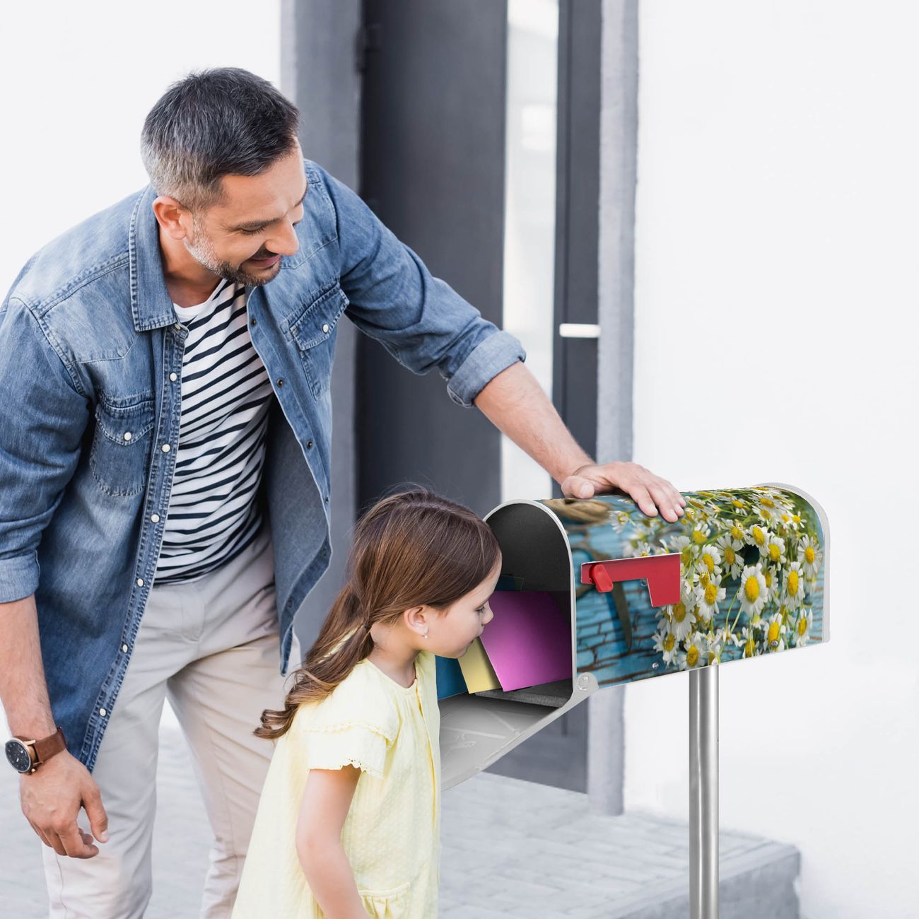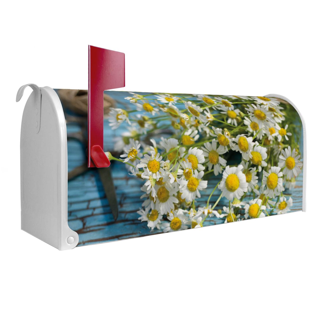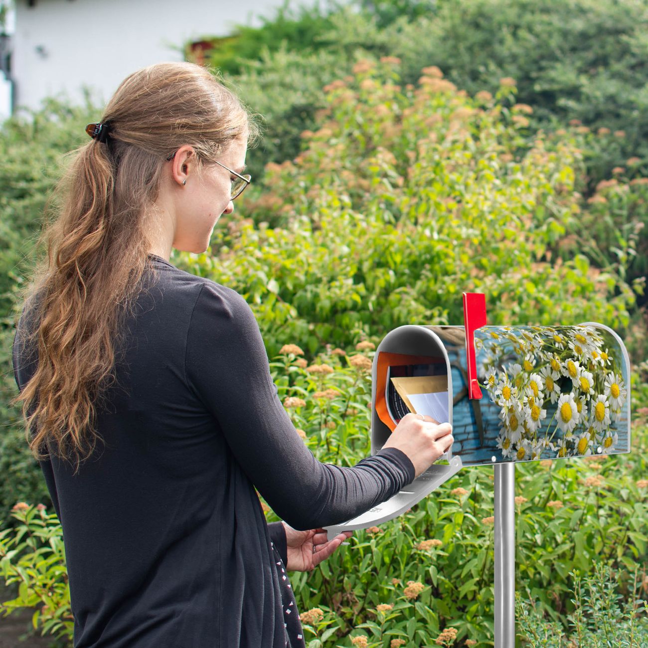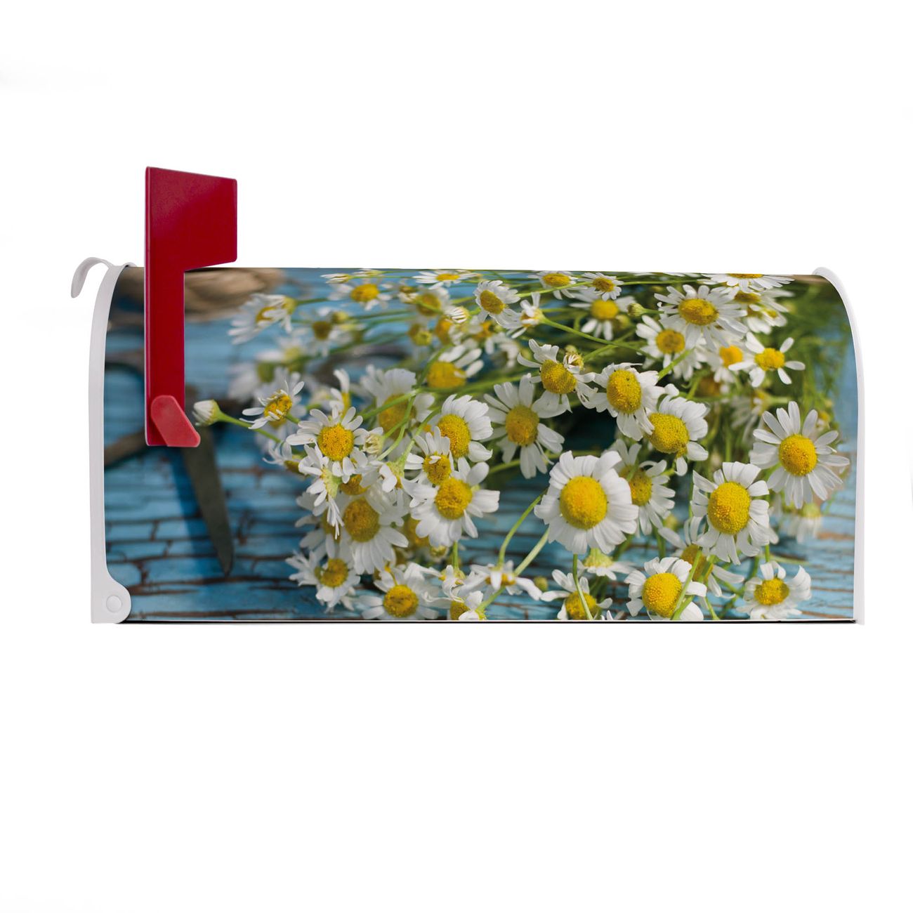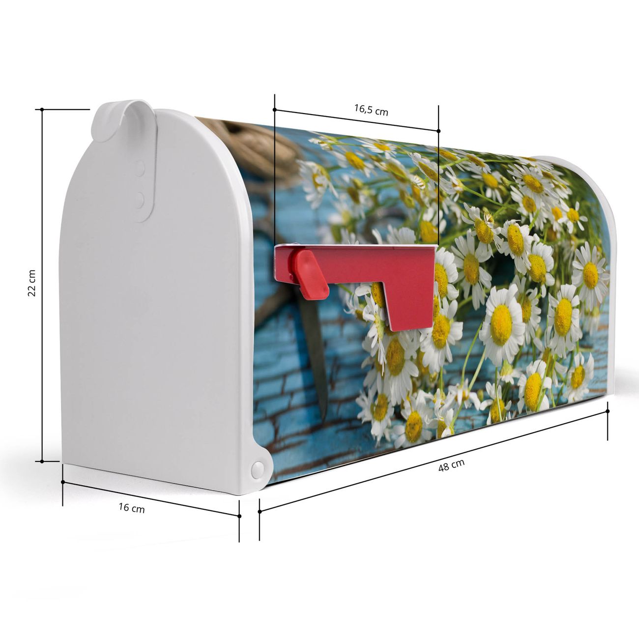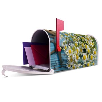 Der amerikanische Briefkasten von banjado mit Tausendschön Motiv bietet Ihnen ausreichend Fassungsvermögen, um große A4 Sendungen und Zeitschriften zu empfangen. Die typisch amerikanische rote Fahne zeigt Ihnen an, wenn Sie Post erhalten haben. Die US-Mailbox besteht aus verzinktem Stahlblech welches lackiert wurde und ist 48 x 22 x 16 CM (BxHxT) groß. Die Folie mit Motiv Tausendschön besteht aus einer wetter- und UV-resistenten Folie, die mit einem Schutzlaminat überzogen ist, sodass die US Mailbox zusätzlich vor Kratzern geschützt ist. An der Unterkante sind 4 Löcher je Seite um die Mailbox, typisch amerikanisch, an einem Holzpfahl oder einem Zaun zu befestigen. Auf Wunsch können Sie bei uns den passenden Standfuß oder die passende Wandhalterung kaufen um die US-Mailbox sicher zu befestigen. Wir bieten Ihnen ebenfalls Namensschilder, bereits beschriftet oder frei zu beschriften, und verschiedene selbst gestaltete Bitte-Keine-Werbung-Aufkleber.