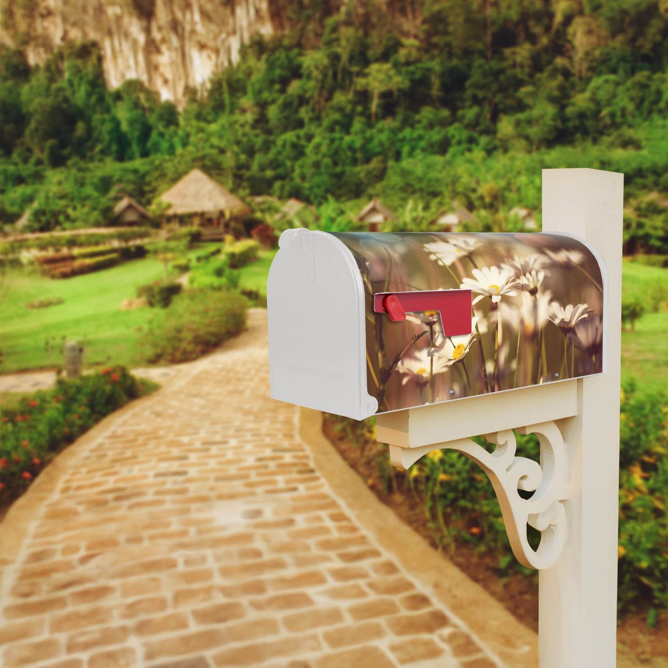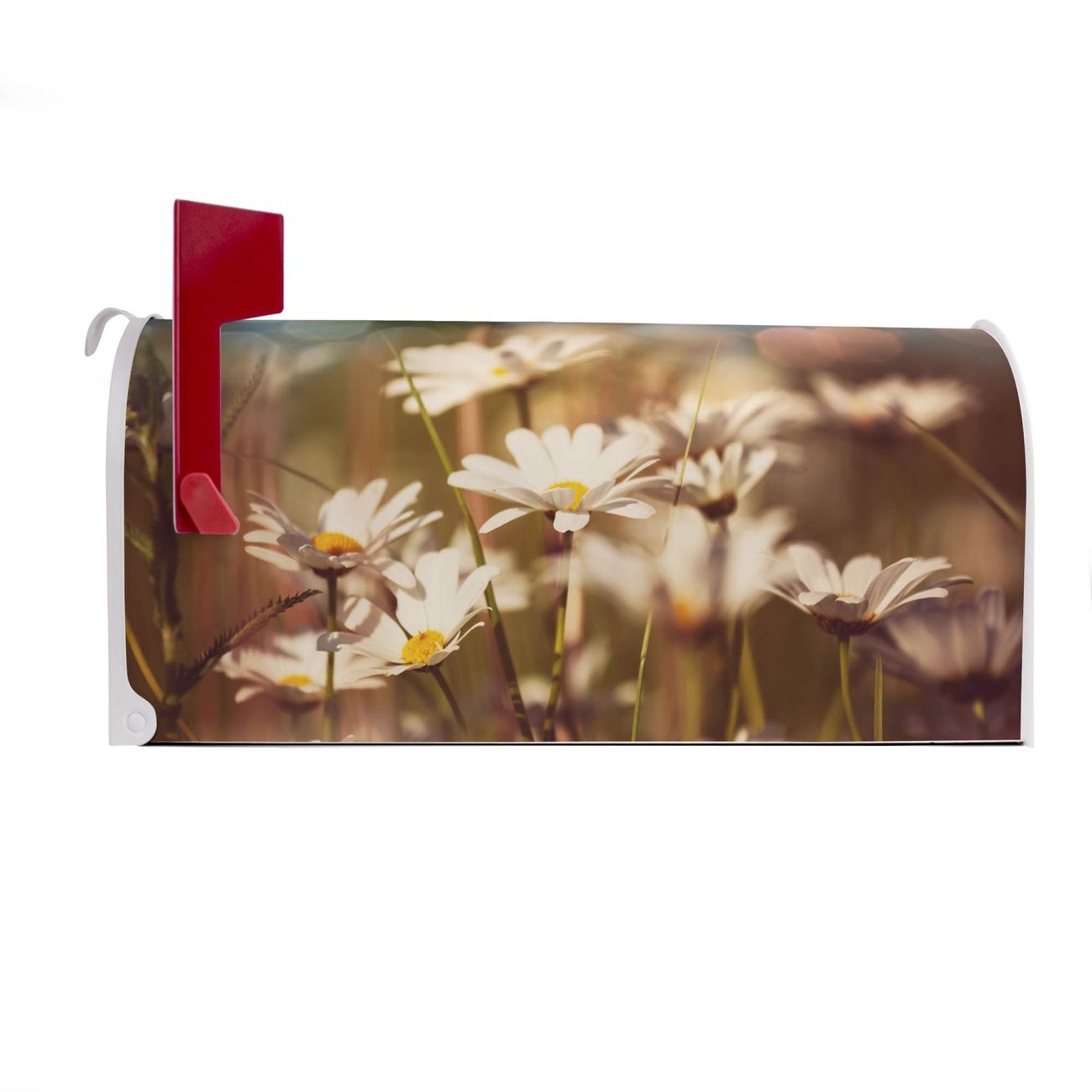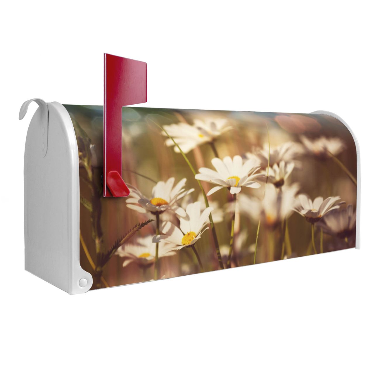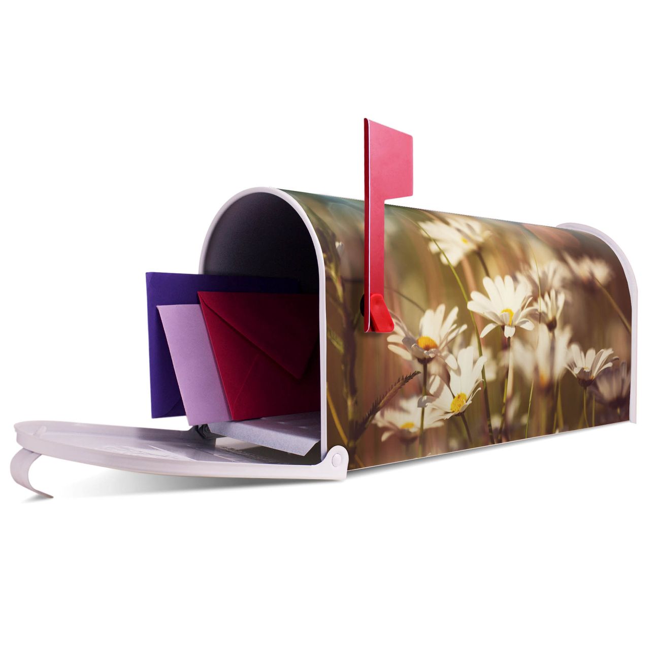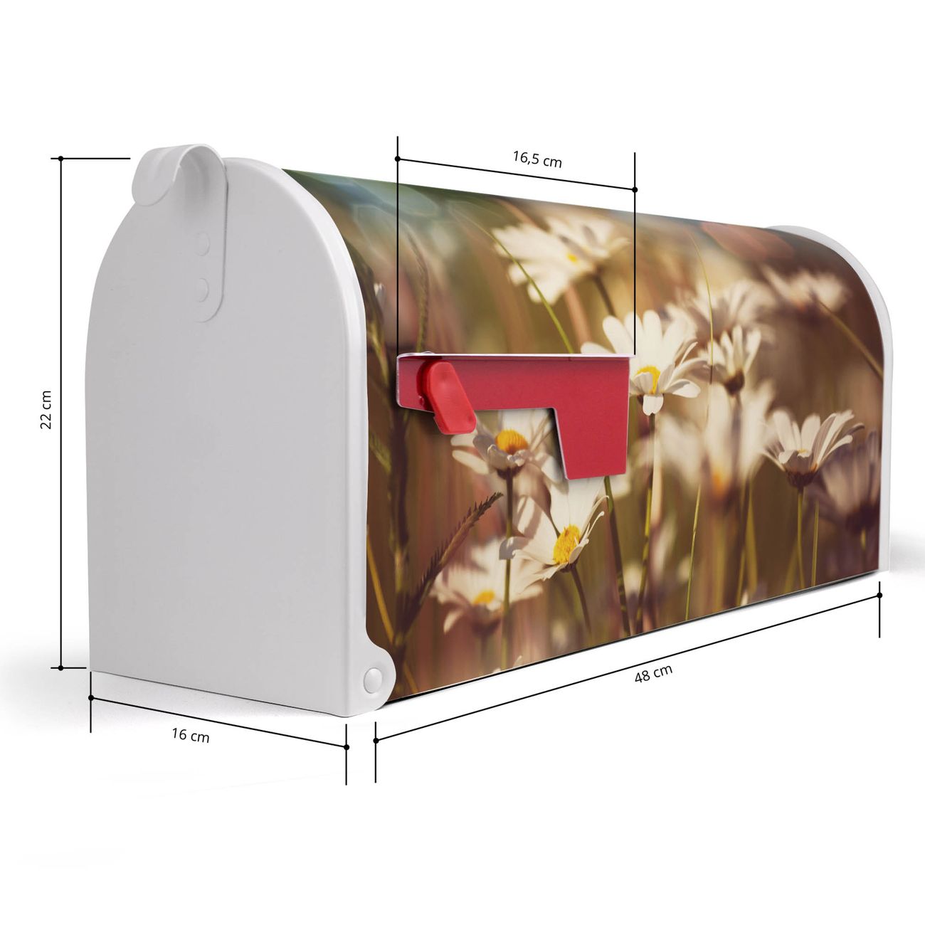 Der amerikanische Briefkasten von banjado mit Tausendschönwiese Motiv bietet Ihnen ausreichend Fassungsvermögen, um große A4 Sendungen und Zeitschriften zu empfangen. Die typisch amerikanische rote Fahne zeigt Ihnen an, wenn Sie Post erhalten haben. Die US-Mailbox besteht aus verzinktem Stahlblech welches lackiert wurde und ist 48 x 22 x 16 CM (BxHxT) groß. Die Folie mit Motiv Tausendschönwiese besteht aus einer wetter- und UV-resistenten Folie, die mit einem Schutzlaminat überzogen ist, sodass die US Mailbox zusätzlich vor Kratzern geschützt ist. An der Unterkante sind 4 Löcher je Seite um die Mailbox, typisch amerikanisch, an einem Holzpfahl oder einem Zaun zu befestigen. Auf Wunsch können Sie bei uns den passenden Standfuß oder die passende Wandhalterung kaufen um die US-Mailbox sicher zu befestigen. Wir bieten Ihnen ebenfalls Namensschilder, bereits beschriftet oder frei zu beschriften, und verschiedene selbst gestaltete Bitte-Keine-Werbung-Aufkleber.