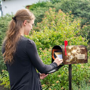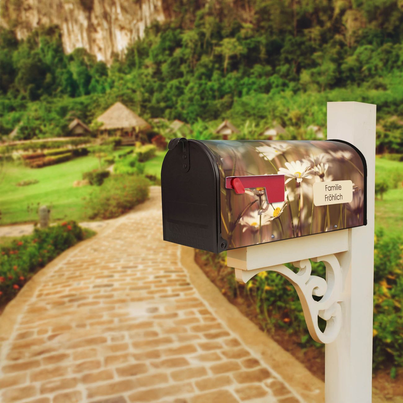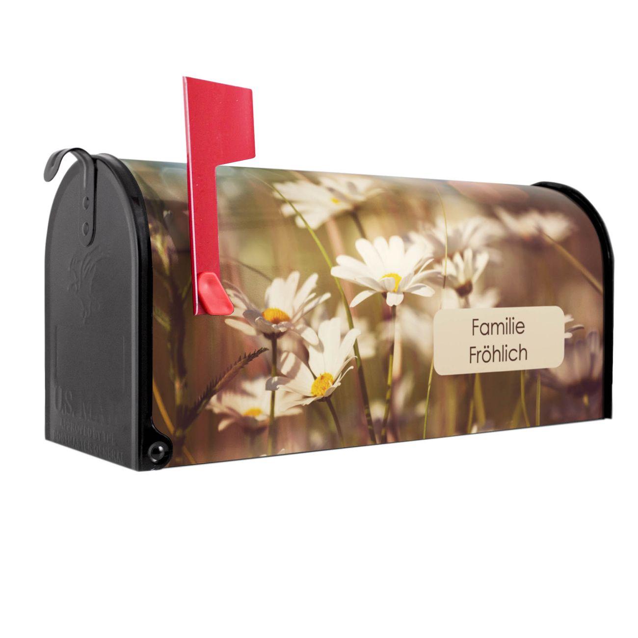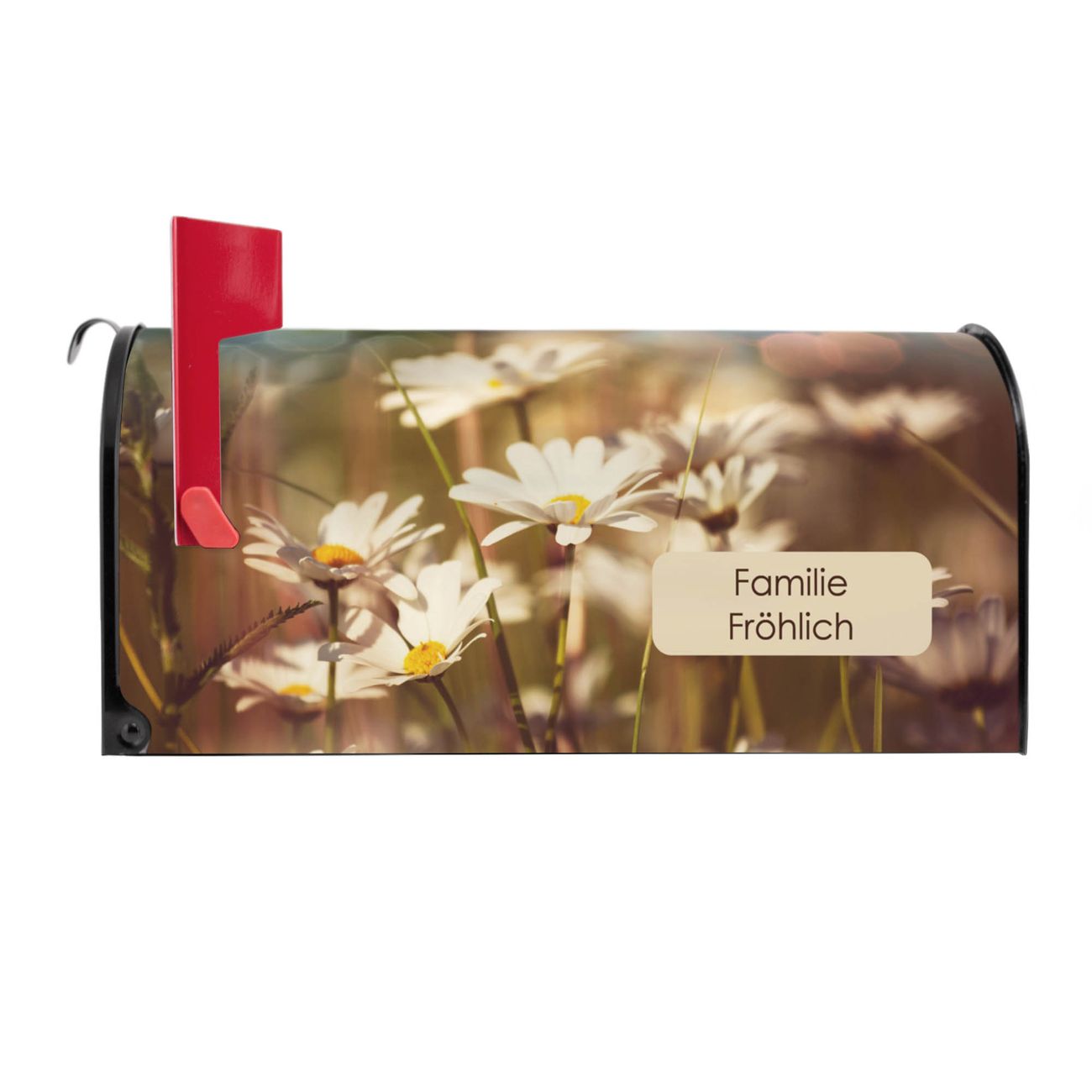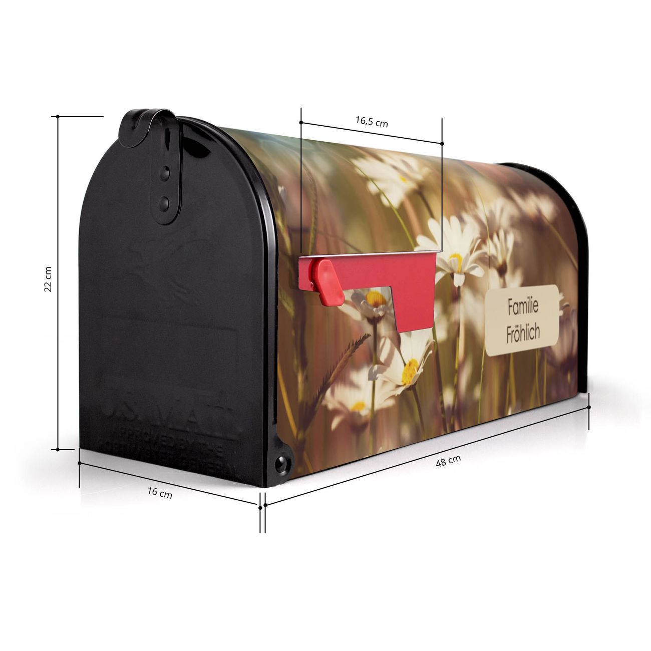 Der amerikanische Briefkasten von banjado mit Tausendschönwiese Motiv bietet Ihnen ausreichend Fassungsvermögen, um große A4 Sendungen und Zeitschriften zu empfangen. Die typisch amerikanische rote Fahne zeigt Ihnen an, wenn Sie Post erhalten haben. Die US-Mailbox besteht aus verzinktem Stahlblech welches lackiert wurde und ist 48 x 22 x 16 CM (BxHxT) groß. Die Folie mit Motiv Tausendschönwiese besteht aus einer wetter- und UV-resistenten Folie, die mit einem Schutzlaminat überzogen ist, sodass die US Mailbox zusätzlich vor Kratzern geschützt ist. An der Unterkante sind 4 Löcher je Seite um die Mailbox, typisch amerikanisch, an einem Holzpfahl oder einem Zaun zu befestigen. Auf Wunsch können Sie bei uns den passenden Standfuß oder die passende Wandhalterung kaufen um die US-Mailbox sicher zu befestigen. Wir bieten Ihnen ebenfalls Namensschilder, bereits beschriftet oder frei zu beschriften, und verschiedene selbst gestaltete Bitte-Keine-Werbung-Aufkleber.