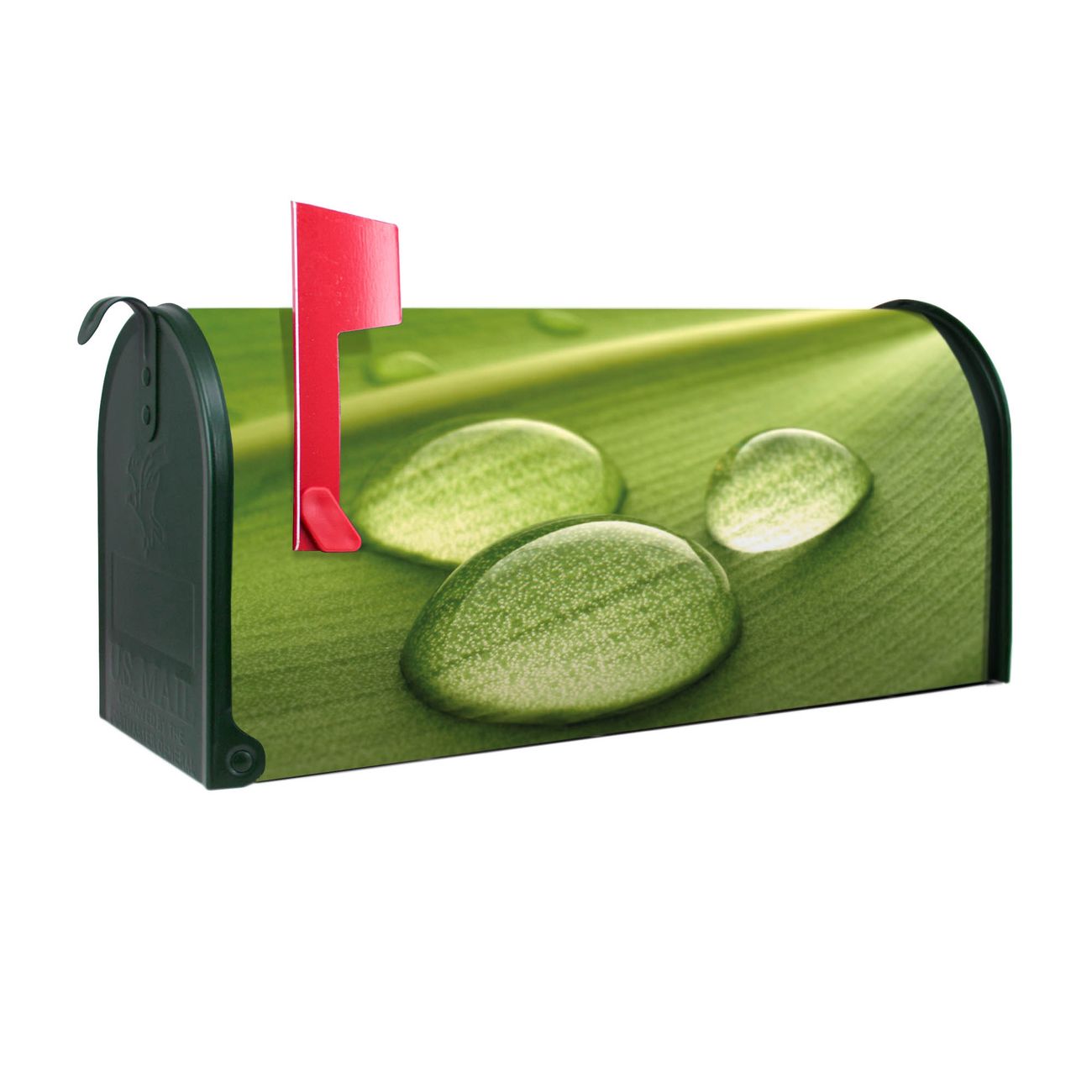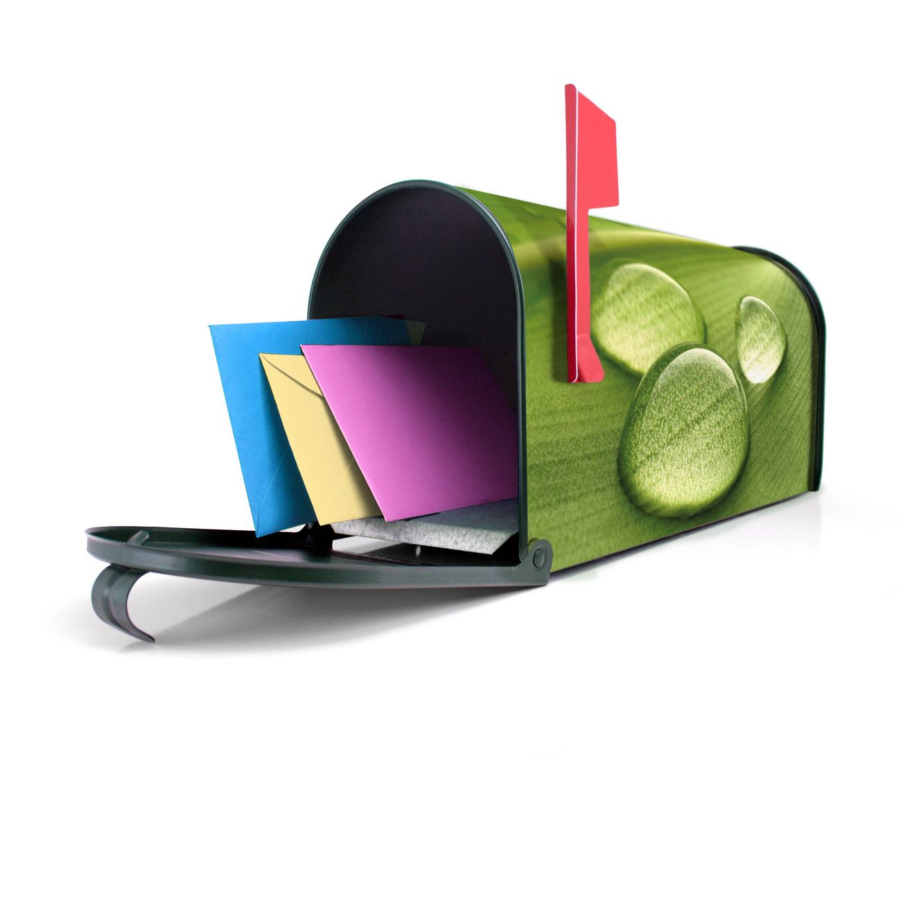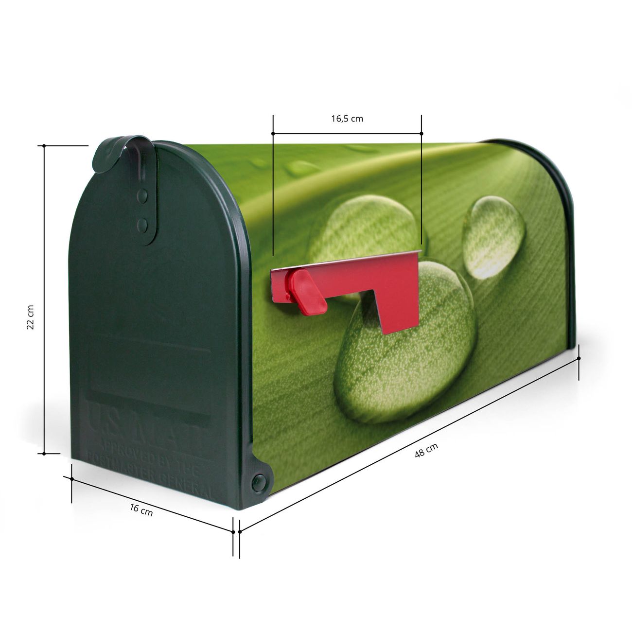 Der amerikanische Briefkasten von banjado mit Tautropfen Motiv bietet Ihnen ausreichend Fassungsvermögen, um große A4 Sendungen und Zeitschriften zu empfangen. Die typisch amerikanische rote Fahne zeigt Ihnen an, wenn Sie Post erhalten haben. Die US-Mailbox besteht aus verzinktem Stahlblech welches lackiert wurde und ist 48 x 22 x 16 CM (BxHxT) groß. Die Folie mit Motiv Tautropfen besteht aus einer wetter- und UV-resistenten Folie, die mit einem Schutzlaminat überzogen ist, sodass die US Mailbox zusätzlich vor Kratzern geschützt ist. An der Unterkante sind 4 Löcher je Seite um die Mailbox, typisch amerikanisch, an einem Holzpfahl oder einem Zaun zu befestigen. Auf Wunsch können Sie bei uns den passenden Standfuß oder die passende Wandhalterung kaufen um die US-Mailbox sicher zu befestigen. Wir bieten Ihnen ebenfalls Namensschilder, bereits beschriftet oder frei zu beschriften, und verschiedene selbst gestaltete Bitte-Keine-Werbung-Aufkleber.