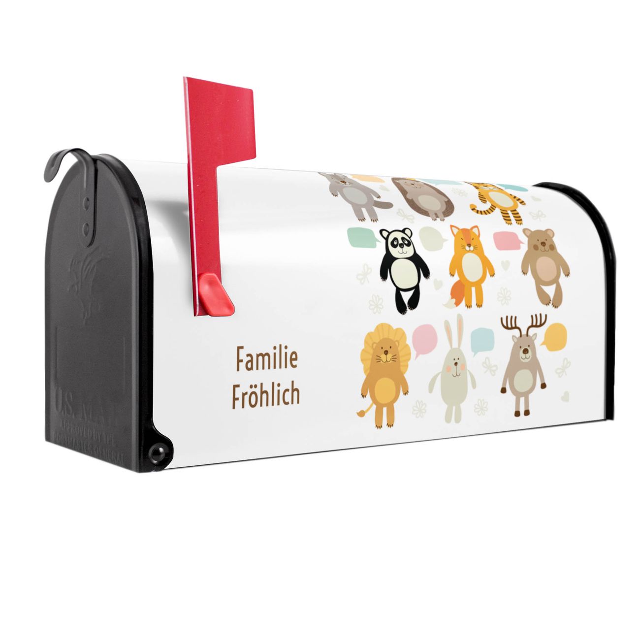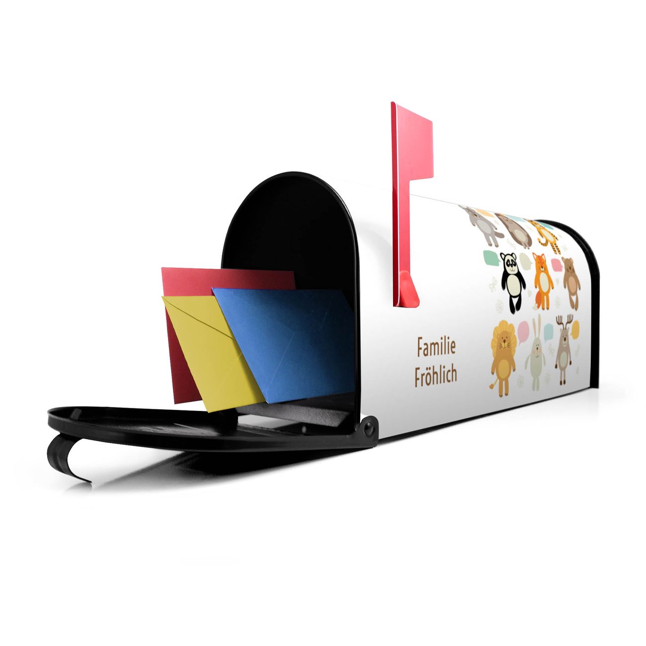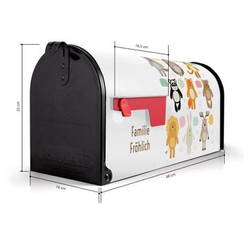 Der amerikanische Briefkasten von banjado mit Tierfreunde Motiv bietet Ihnen ausreichend Fassungsvermögen, um große A4 Sendungen und Zeitschriften zu empfangen. Die typisch amerikanische rote Fahne zeigt Ihnen an, wenn Sie Post erhalten haben. Die US-Mailbox besteht aus verzinktem Stahlblech welches lackiert wurde und ist 48 x 22 x 16 CM (BxHxT) groß. Die Folie mit Motiv Tierfreunde besteht aus einer wetter- und UV-resistenten Folie, die mit einem Schutzlaminat überzogen ist, sodass die US Mailbox zusätzlich vor Kratzern geschützt ist. An der Unterkante sind 4 Löcher je Seite um die Mailbox, typisch amerikanisch, an einem Holzpfahl oder einem Zaun zu befestigen. Auf Wunsch können Sie bei uns den passenden Standfuß oder die passende Wandhalterung kaufen um die US-Mailbox sicher zu befestigen. Wir bieten Ihnen ebenfalls Namensschilder, bereits beschriftet oder frei zu beschriften, und verschiedene selbst gestaltete Bitte-Keine-Werbung-Aufkleber.
