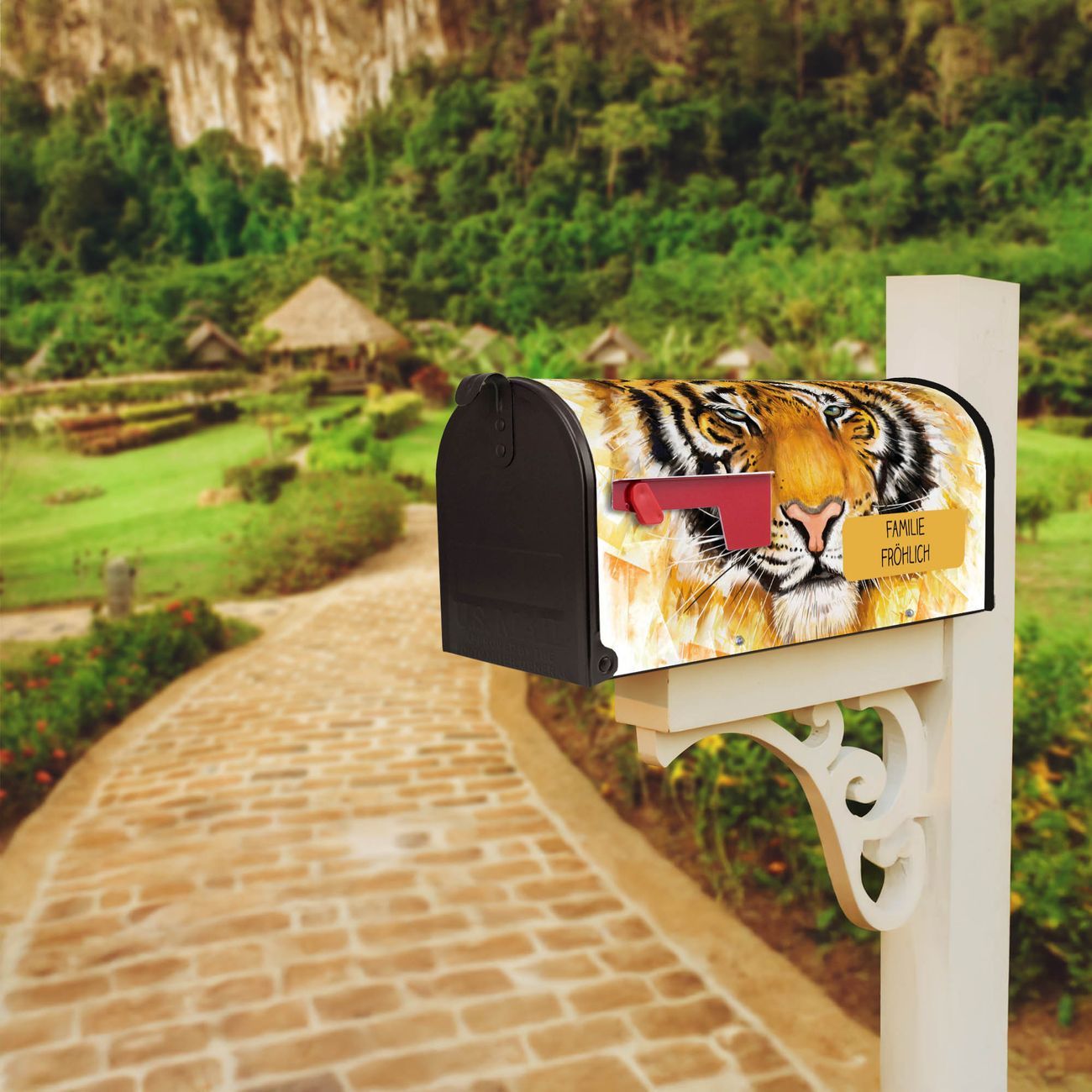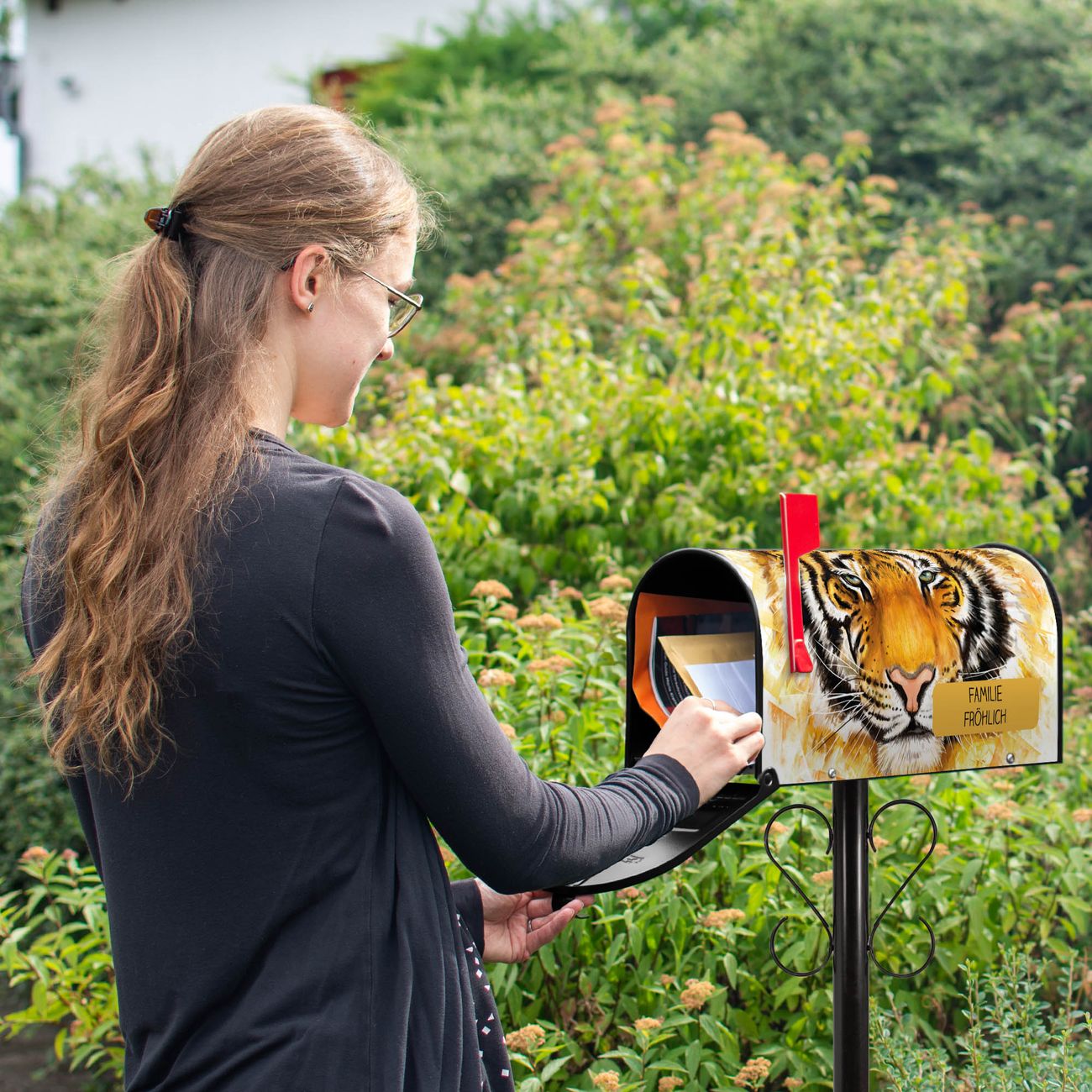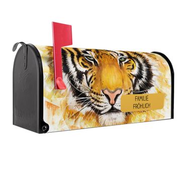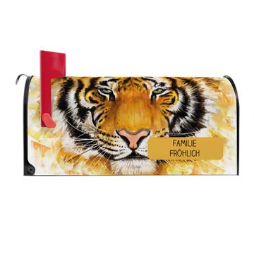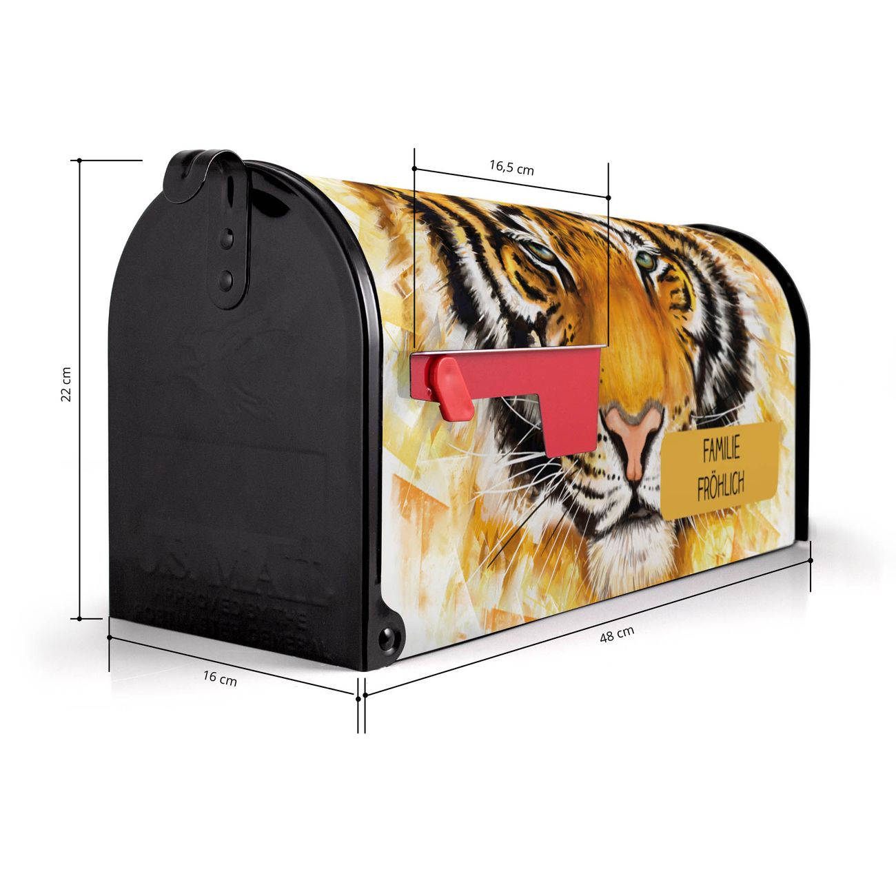 Der amerikanische Briefkasten von banjado mit Tigerkopf Motiv bietet Ihnen ausreichend Fassungsvermögen, um große A4 Sendungen und Zeitschriften zu empfangen. Die typisch amerikanische rote Fahne zeigt Ihnen an, wenn Sie Post erhalten haben. Die US-Mailbox besteht aus verzinktem Stahlblech welches lackiert wurde und ist 48 x 22 x 16 CM (BxHxT) groß. Die Folie mit Motiv Tigerkopf besteht aus einer wetter- und UV-resistenten Folie, die mit einem Schutzlaminat überzogen ist, sodass die US Mailbox zusätzlich vor Kratzern geschützt ist. An der Unterkante sind 4 Löcher je Seite um die Mailbox, typisch amerikanisch, an einem Holzpfahl oder einem Zaun zu befestigen. Auf Wunsch können Sie bei uns den passenden Standfuß oder die passende Wandhalterung kaufen um die US-Mailbox sicher zu befestigen. Wir bieten Ihnen ebenfalls Namensschilder, bereits beschriftet oder frei zu beschriften, und verschiedene selbst gestaltete Bitte-Keine-Werbung-Aufkleber.