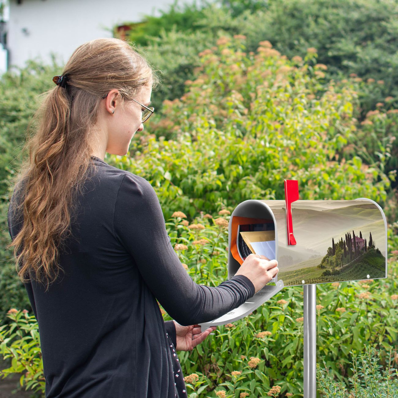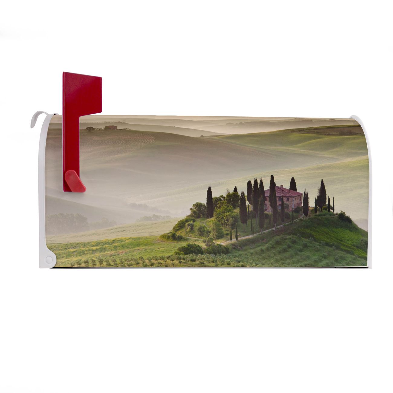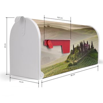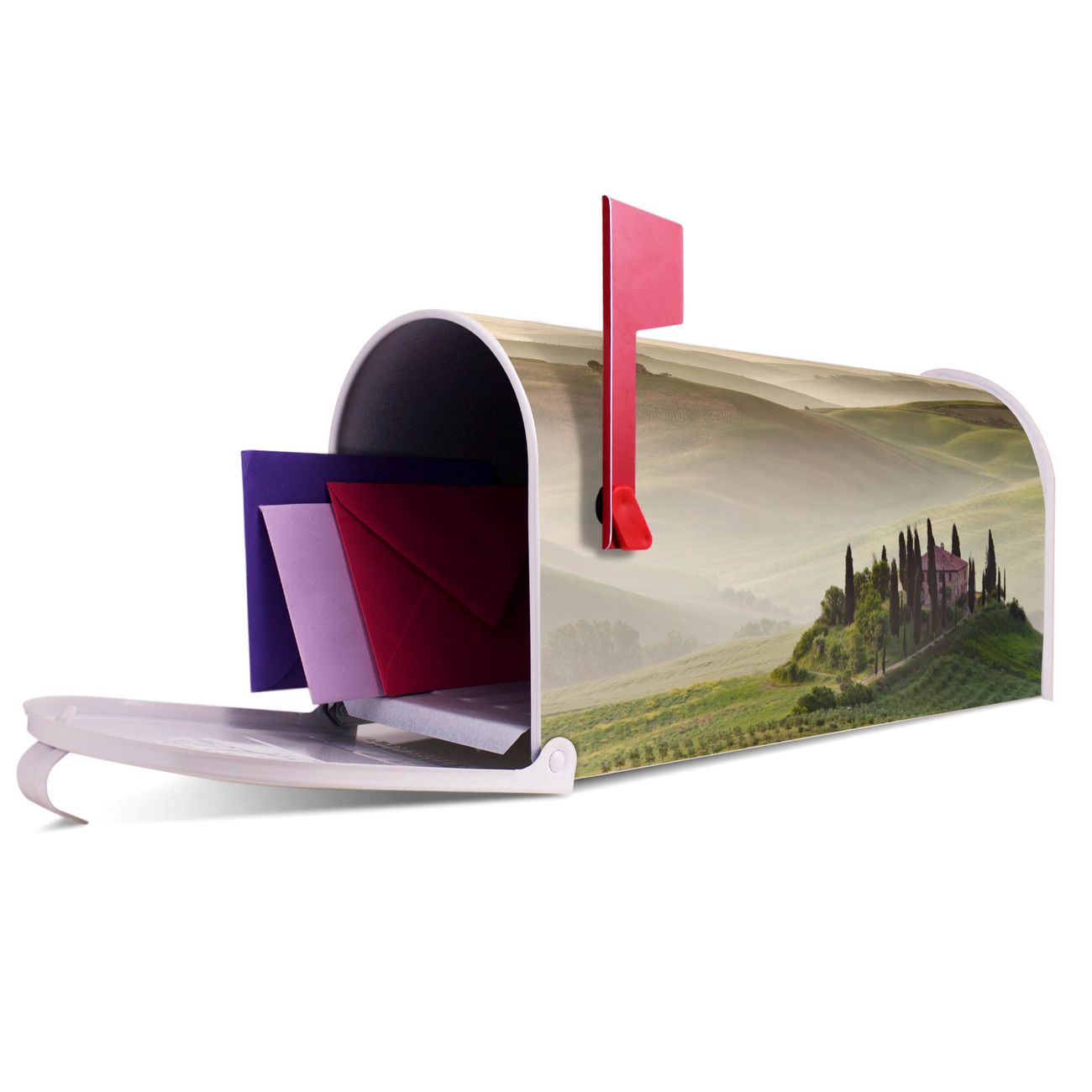 Der amerikanische Briefkasten von banjado mit Toscana Motiv bietet Ihnen ausreichend Fassungsvermögen, um große A4 Sendungen und Zeitschriften zu empfangen. Die typisch amerikanische rote Fahne zeigt Ihnen an, wenn Sie Post erhalten haben. Die US-Mailbox besteht aus verzinktem Stahlblech welches lackiert wurde und ist 48 x 22 x 16 CM (BxHxT) groß. Die Folie mit Motiv Toscana besteht aus einer wetter- und UV-resistenten Folie, die mit einem Schutzlaminat überzogen ist, sodass die US Mailbox zusätzlich vor Kratzern geschützt ist. An der Unterkante sind 4 Löcher je Seite um die Mailbox, typisch amerikanisch, an einem Holzpfahl oder einem Zaun zu befestigen. Auf Wunsch können Sie bei uns den passenden Standfuß oder die passende Wandhalterung kaufen um die US-Mailbox sicher zu befestigen. Wir bieten Ihnen ebenfalls Namensschilder, bereits beschriftet oder frei zu beschriften, und verschiedene selbst gestaltete Bitte-Keine-Werbung-Aufkleber.