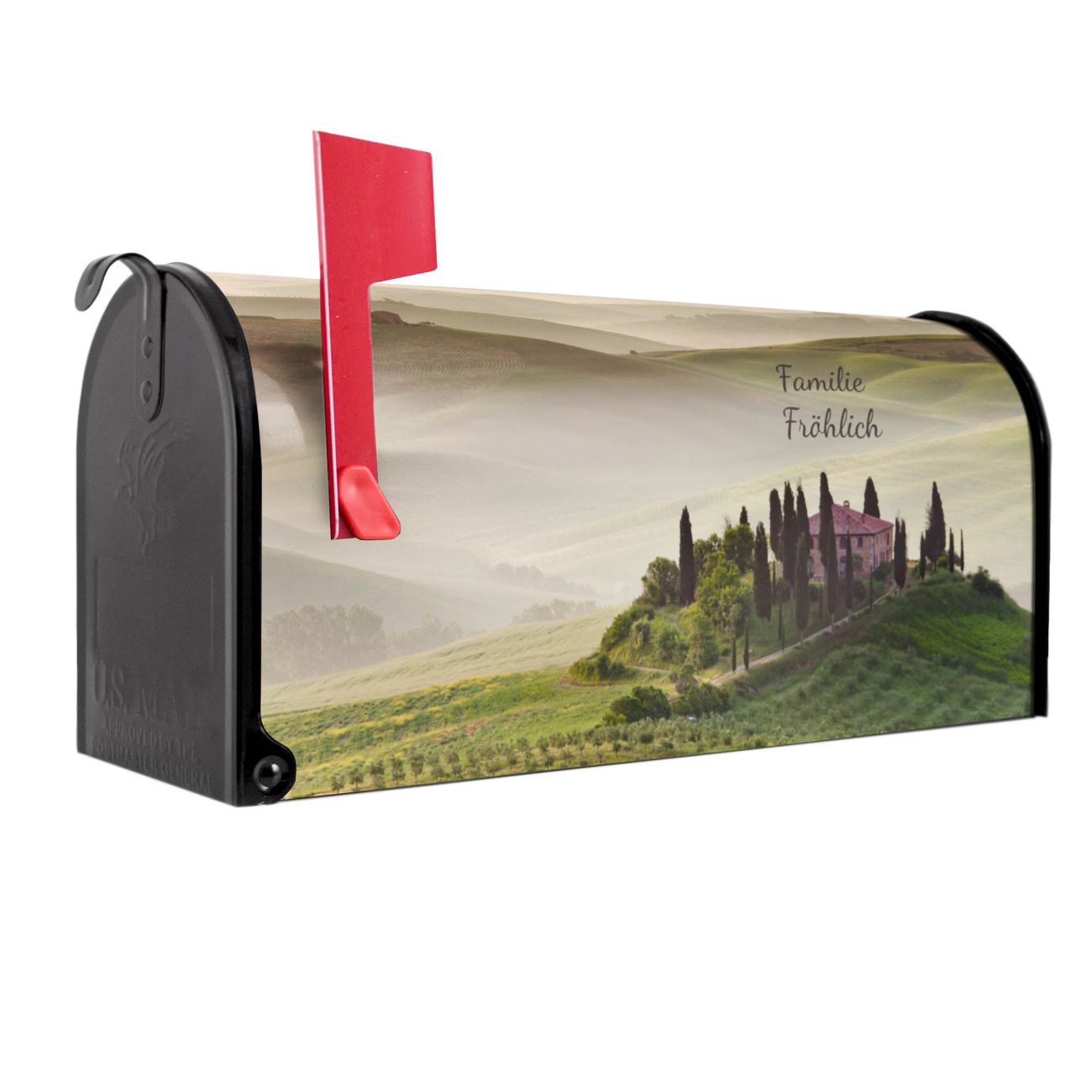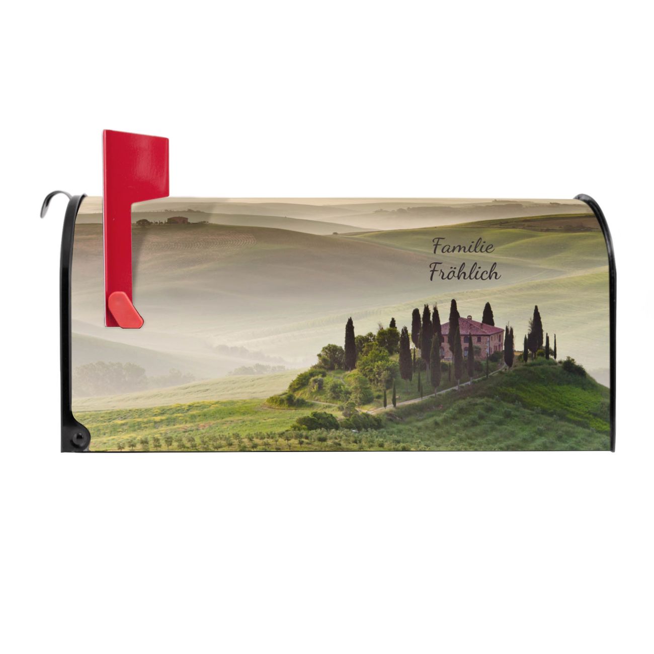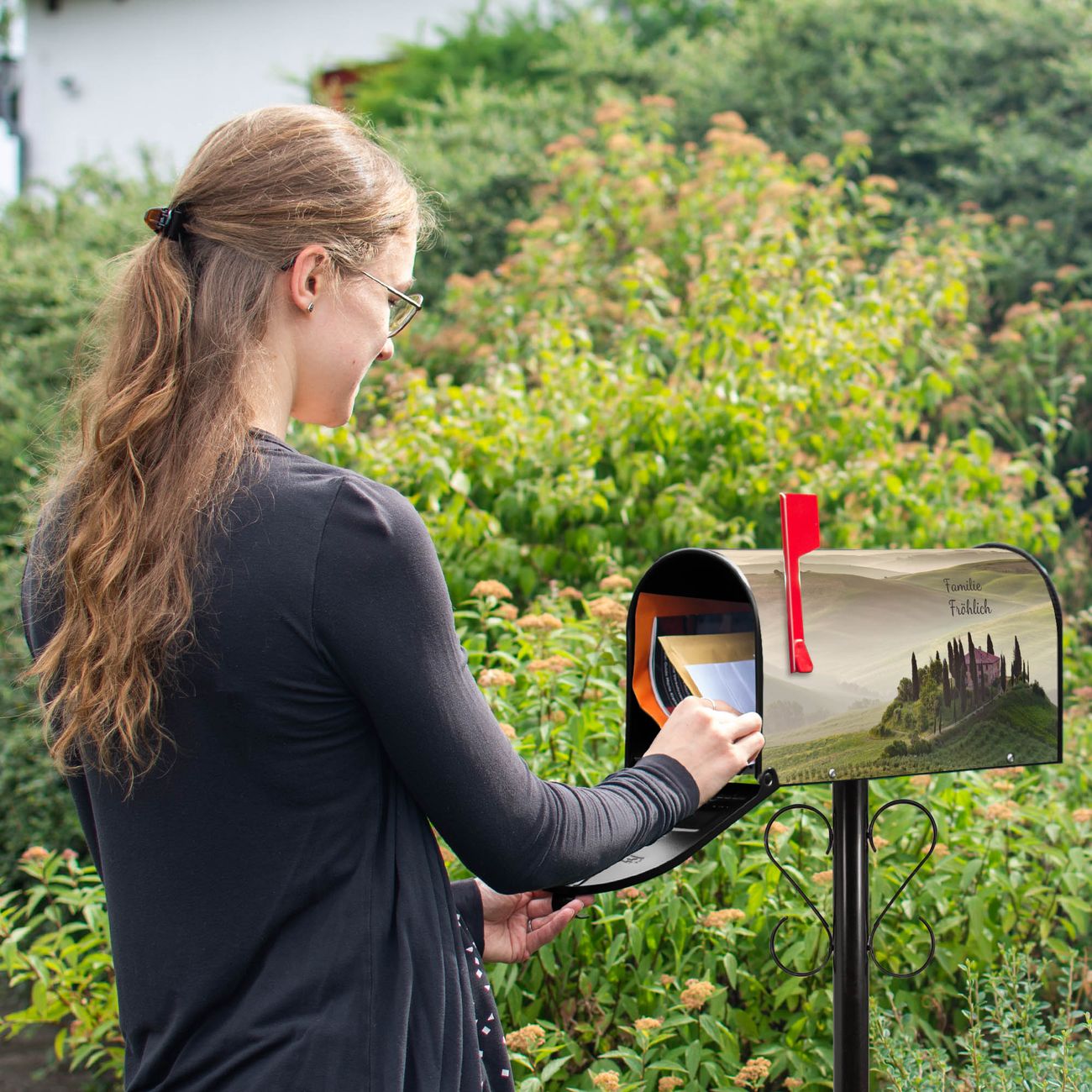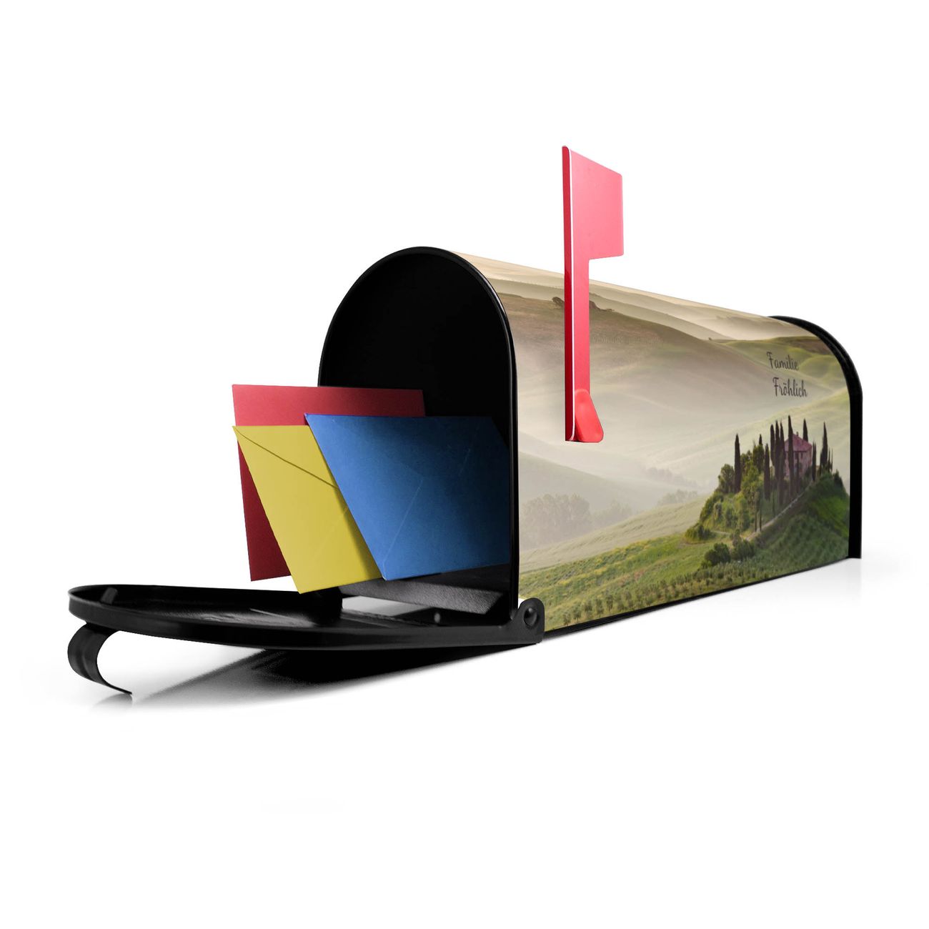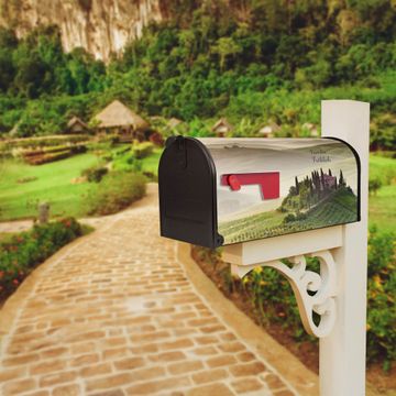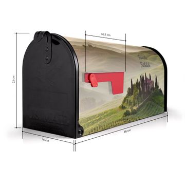 Der amerikanische Briefkasten von banjado mit Toscana Motiv bietet Ihnen ausreichend Fassungsvermögen, um große A4 Sendungen und Zeitschriften zu empfangen. Die typisch amerikanische rote Fahne zeigt Ihnen an, wenn Sie Post erhalten haben. Die US-Mailbox besteht aus verzinktem Stahlblech welches lackiert wurde und ist 48 x 22 x 16 CM (BxHxT) groß. Die Folie mit Motiv Toscana besteht aus einer wetter- und UV-resistenten Folie, die mit einem Schutzlaminat überzogen ist, sodass die US Mailbox zusätzlich vor Kratzern geschützt ist. An der Unterkante sind 4 Löcher je Seite um die Mailbox, typisch amerikanisch, an einem Holzpfahl oder einem Zaun zu befestigen. Auf Wunsch können Sie bei uns den passenden Standfuß oder die passende Wandhalterung kaufen um die US-Mailbox sicher zu befestigen. Wir bieten Ihnen ebenfalls Namensschilder, bereits beschriftet oder frei zu beschriften, und verschiedene selbst gestaltete Bitte-Keine-Werbung-Aufkleber.