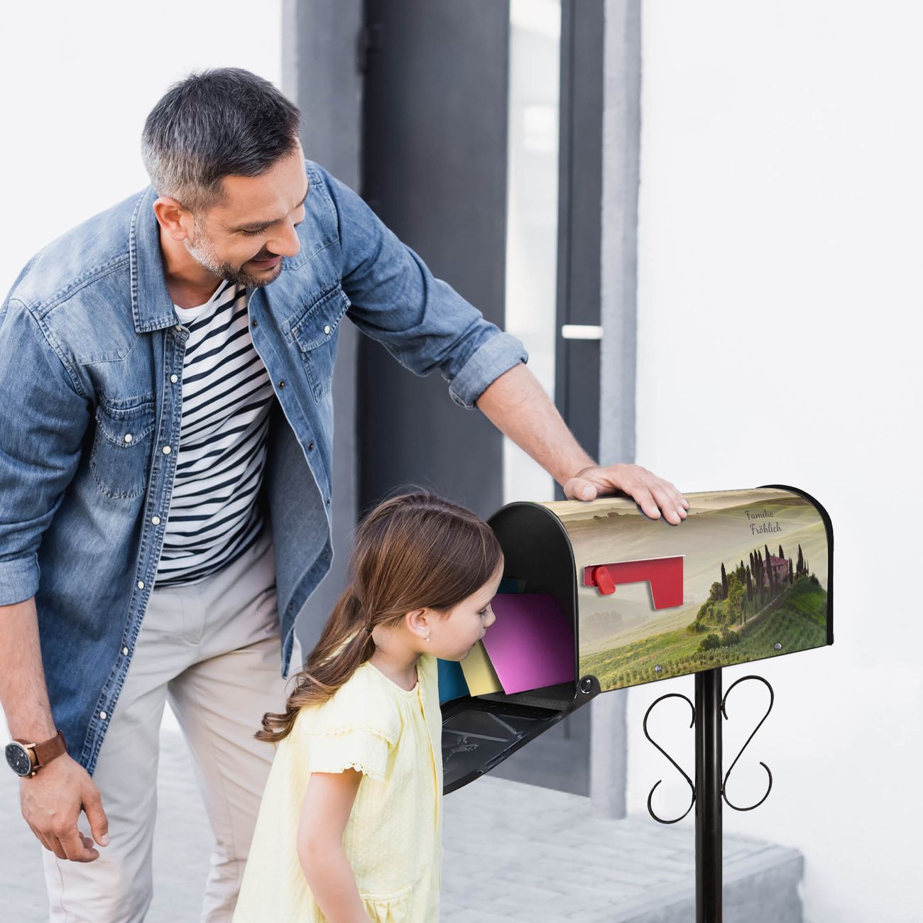 Unser amerikanischer Briefkasten mit dem Motiv Toscana hat ein sehr ansprechendes und ausgefallenes Design, ist in der Grundfarbe weiß, grün oder schwarz erhältlich. Damit entlocken Sie Ihren Nachbarn und dem Postboten immer wieder ein Lächeln. Die Mailbox ist ein Original Import aus Mississippi USA und wird von unserer kleinen Manufaktur in Sachsen von Hand veredelt. Die US-Mailbox bietet ausreichend Platz auch für große Sendungen, eine Fahne die Ihnen Post anzeigt, wetterfestes und äußerst stabiles Material - so macht Post empfangen Freude.