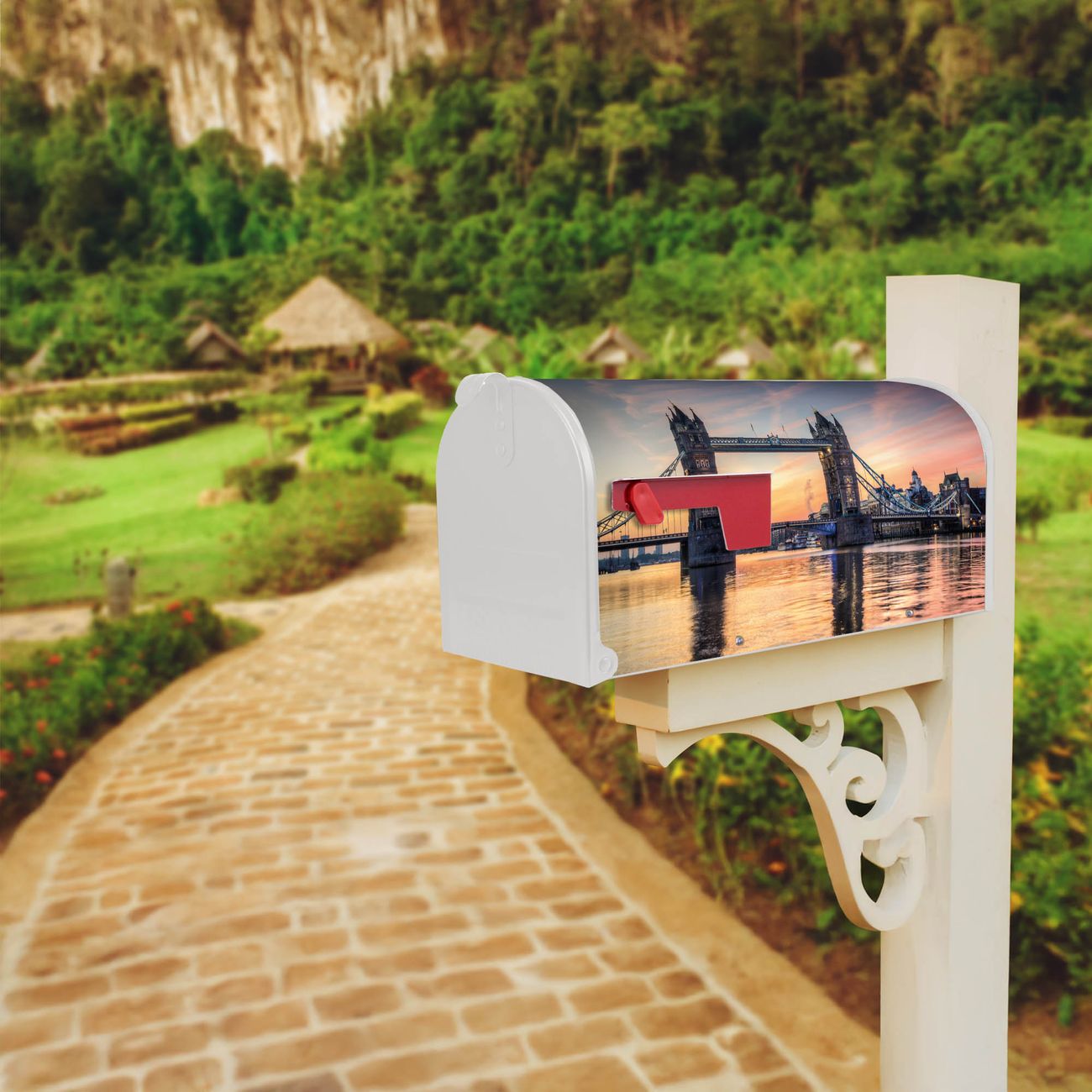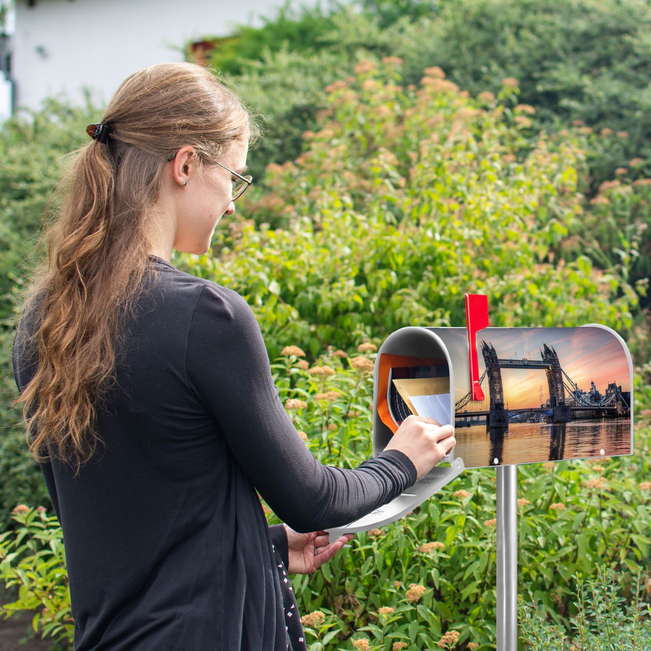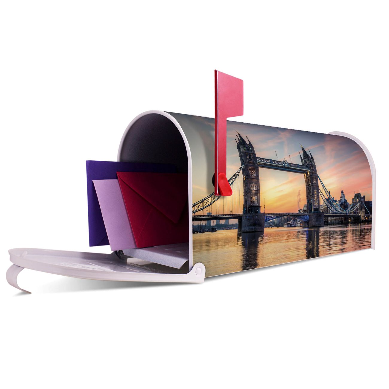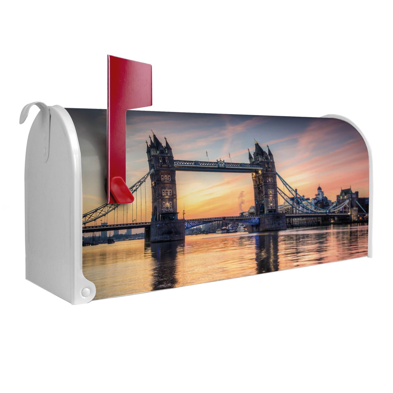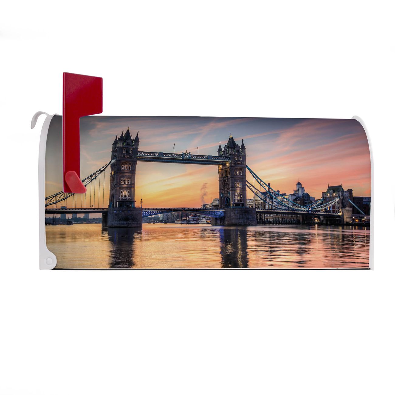 Der amerikanische Briefkasten von banjado mit Tower Bridge Motiv bietet Ihnen ausreichend Fassungsvermögen, um große A4 Sendungen und Zeitschriften zu empfangen. Die typisch amerikanische rote Fahne zeigt Ihnen an, wenn Sie Post erhalten haben. Die US-Mailbox besteht aus verzinktem Stahlblech welches lackiert wurde und ist 48 x 22 x 16 CM (BxHxT) groß. Die Folie mit Motiv Tower Bridge besteht aus einer wetter- und UV-resistenten Folie, die mit einem Schutzlaminat überzogen ist, sodass die US Mailbox zusätzlich vor Kratzern geschützt ist. An der Unterkante sind 4 Löcher je Seite um die Mailbox, typisch amerikanisch, an einem Holzpfahl oder einem Zaun zu befestigen. Auf Wunsch können Sie bei uns den passenden Standfuß oder die passende Wandhalterung kaufen um die US-Mailbox sicher zu befestigen. Wir bieten Ihnen ebenfalls Namensschilder, bereits beschriftet oder frei zu beschriften, und verschiedene selbst gestaltete Bitte-Keine-Werbung-Aufkleber.