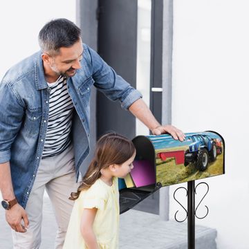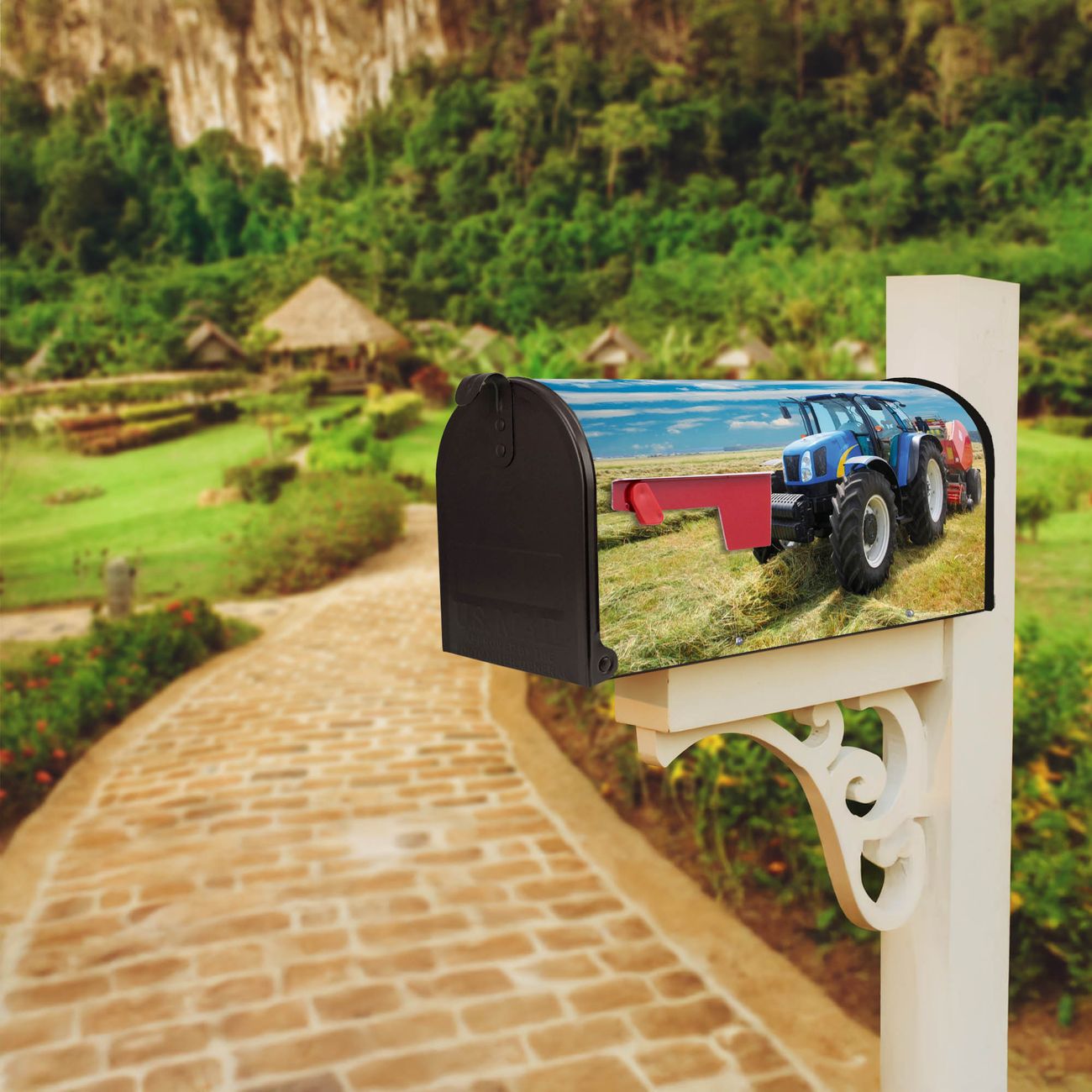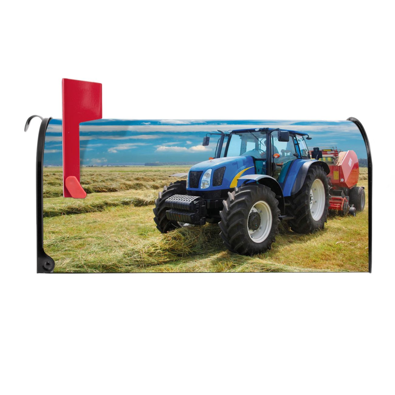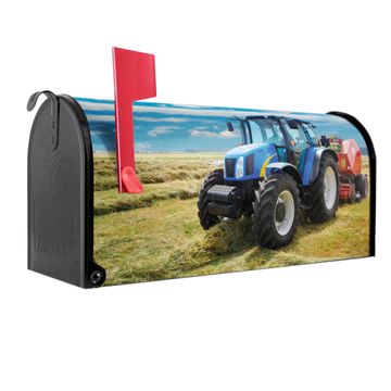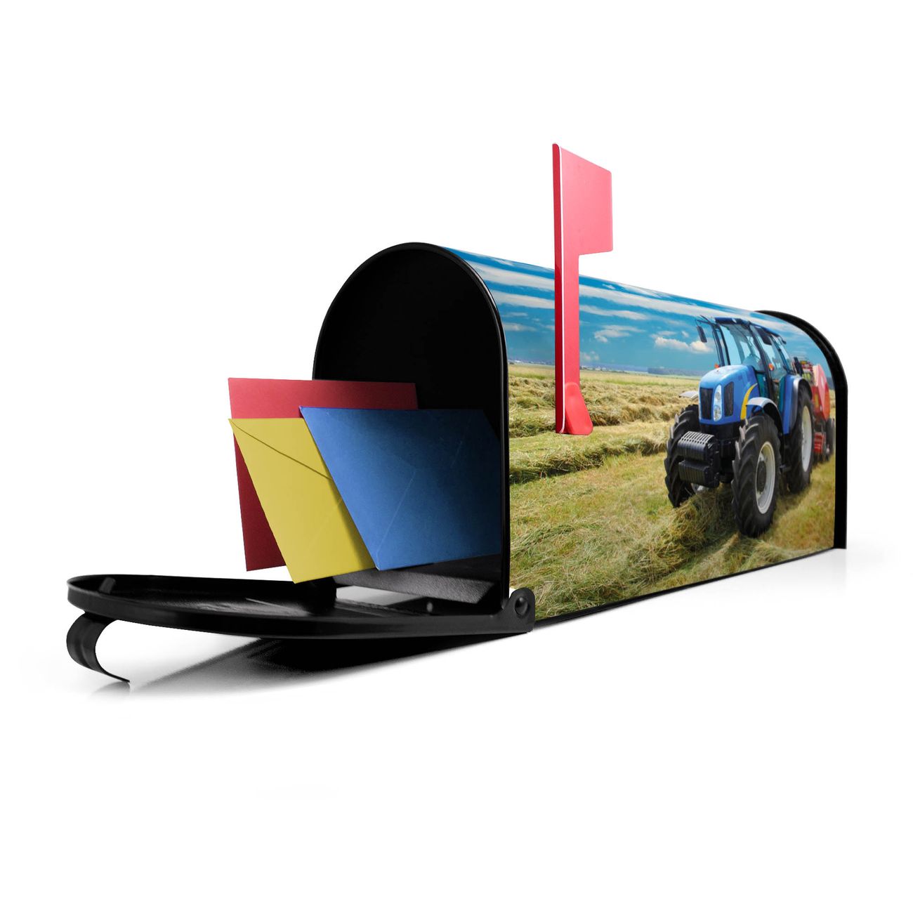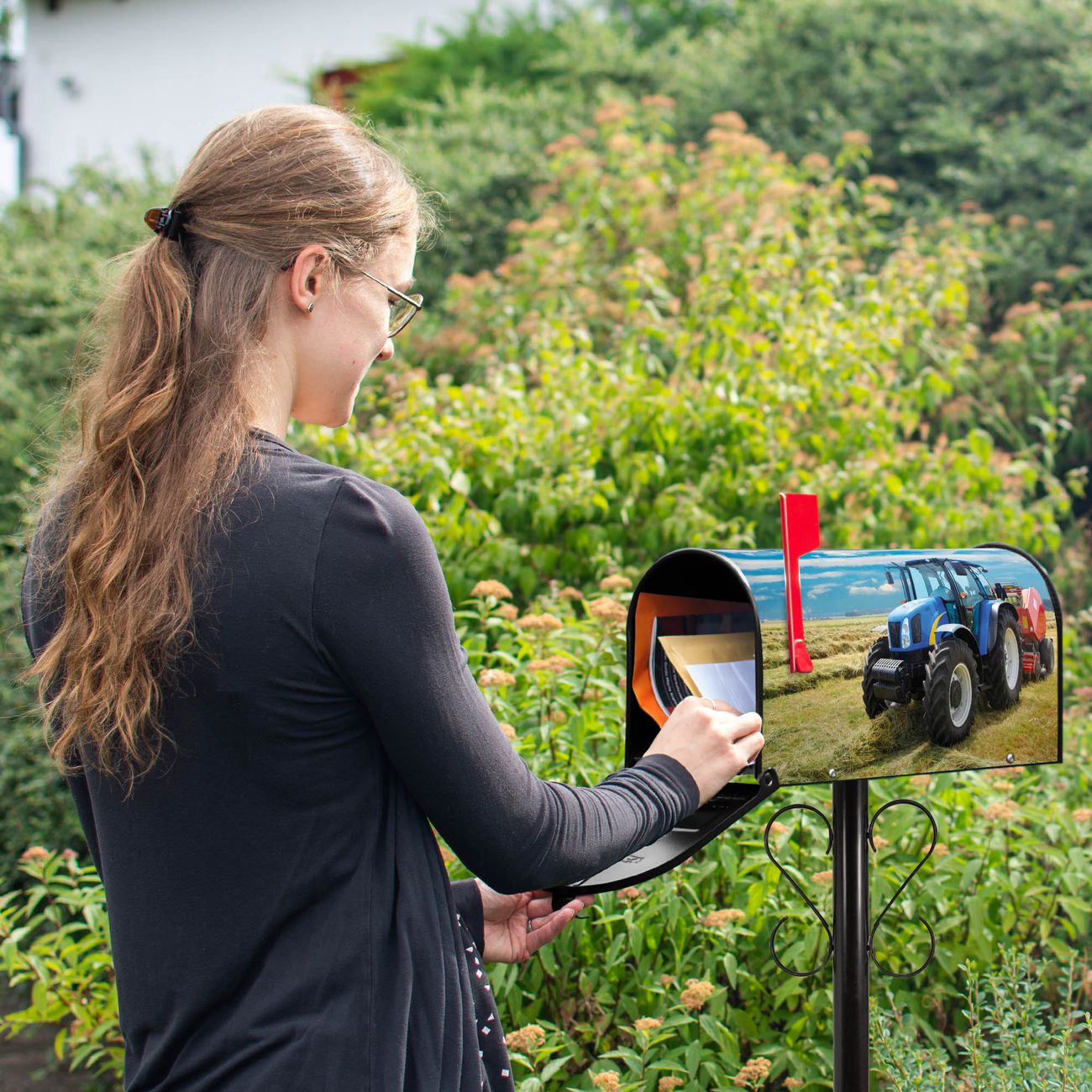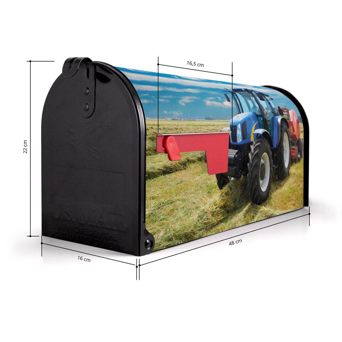Der amerikanische Briefkasten von banjado mit Traktor Motiv bietet Ihnen ausreichend Fassungsvermögen, um große A4 Sendungen und Zeitschriften zu empfangen. Die typisch amerikanische rote Fahne zeigt Ihnen an, wenn Sie Post erhalten haben. Die US-Mailbox besteht aus verzinktem Stahlblech welches lackiert wurde und ist 48 x 22 x 16 CM (BxHxT) groß. Die Folie mit Motiv Traktor besteht aus einer wetter- und UV-resistenten Folie, die mit einem Schutzlaminat überzogen ist, sodass die US Mailbox zusätzlich vor Kratzern geschützt ist. An der Unterkante sind 4 Löcher je Seite um die Mailbox, typisch amerikanisch, an einem Holzpfahl oder einem Zaun zu befestigen. Auf Wunsch können Sie bei uns den passenden Standfuß oder die passende Wandhalterung kaufen um die US-Mailbox sicher zu befestigen. Wir bieten Ihnen ebenfalls Namensschilder, bereits beschriftet oder frei zu beschriften, und verschiedene selbst gestaltete Bitte-Keine-Werbung-Aufkleber.
