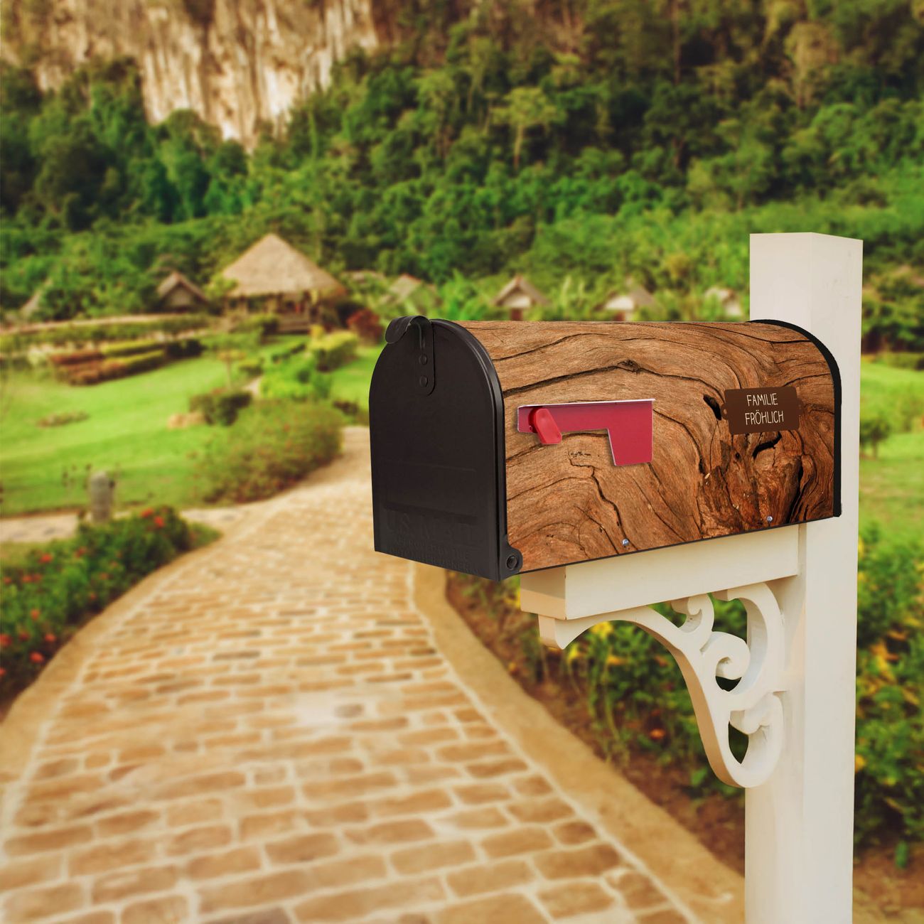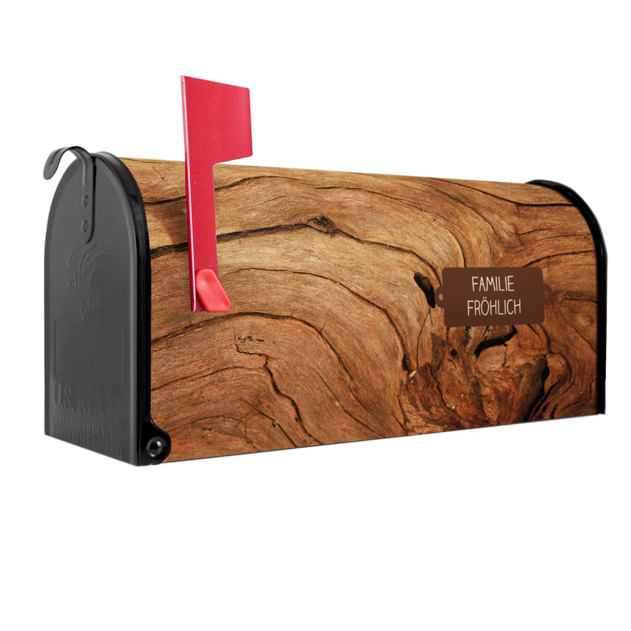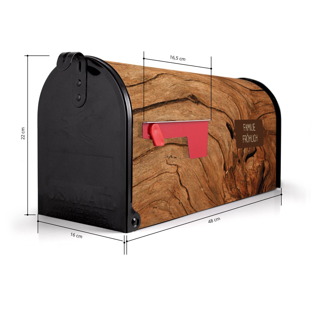 Der amerikanische Briefkasten von banjado mit Trockenes Holz Motiv bietet Ihnen ausreichend Fassungsvermögen, um große A4 Sendungen und Zeitschriften zu empfangen. Die typisch amerikanische rote Fahne zeigt Ihnen an, wenn Sie Post erhalten haben. Die US-Mailbox besteht aus verzinktem Stahlblech welches lackiert wurde und ist 48 x 22 x 16 CM (BxHxT) groß. Die Folie mit Motiv Trockenes Holz besteht aus einer wetter- und UV-resistenten Folie, die mit einem Schutzlaminat überzogen ist, sodass die US Mailbox zusätzlich vor Kratzern geschützt ist. An der Unterkante sind 4 Löcher je Seite um die Mailbox, typisch amerikanisch, an einem Holzpfahl oder einem Zaun zu befestigen. Auf Wunsch können Sie bei uns den passenden Standfuß oder die passende Wandhalterung kaufen um die US-Mailbox sicher zu befestigen. Wir bieten Ihnen ebenfalls Namensschilder, bereits beschriftet oder frei zu beschriften, und verschiedene selbst gestaltete Bitte-Keine-Werbung-Aufkleber.