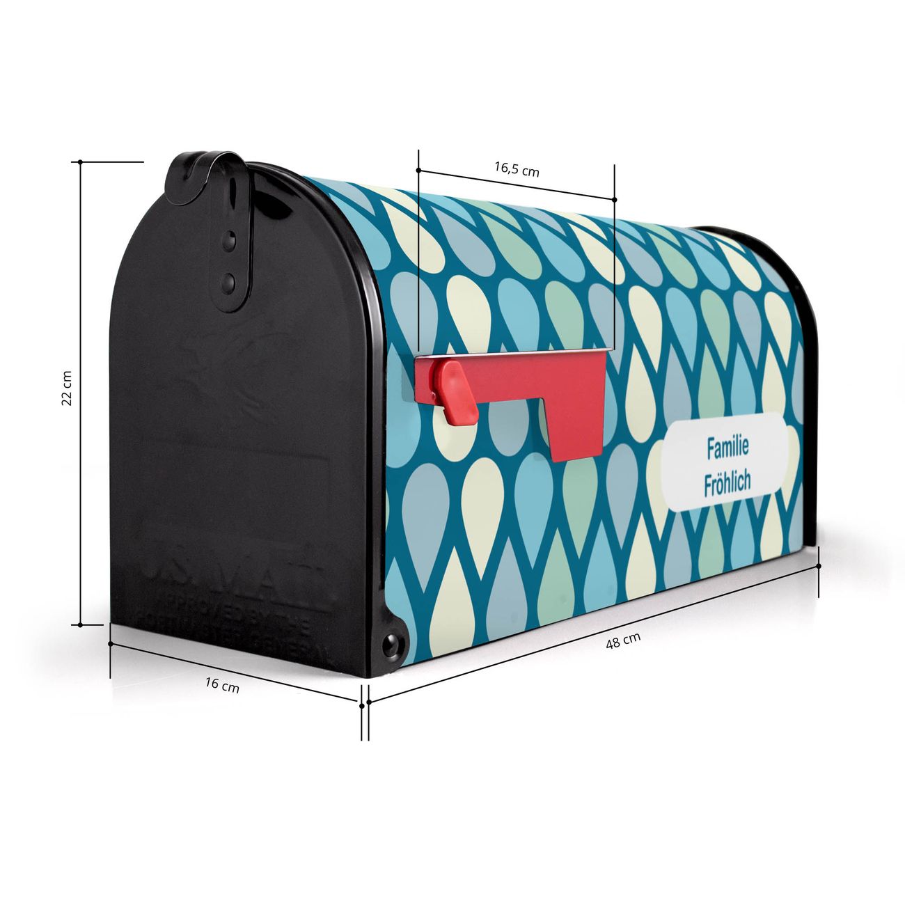 Der amerikanische Briefkasten von banjado mit Tropfen Motiv bietet Ihnen ausreichend Fassungsvermögen, um große A4 Sendungen und Zeitschriften zu empfangen. Die typisch amerikanische rote Fahne zeigt Ihnen an, wenn Sie Post erhalten haben. Die US-Mailbox besteht aus verzinktem Stahlblech welches lackiert wurde und ist 48 x 22 x 16 CM (BxHxT) groß. Die Folie mit Motiv Tropfen besteht aus einer wetter- und UV-resistenten Folie, die mit einem Schutzlaminat überzogen ist, sodass die US Mailbox zusätzlich vor Kratzern geschützt ist. An der Unterkante sind 4 Löcher je Seite um die Mailbox, typisch amerikanisch, an einem Holzpfahl oder einem Zaun zu befestigen. Auf Wunsch können Sie bei uns den passenden Standfuß oder die passende Wandhalterung kaufen um die US-Mailbox sicher zu befestigen. Wir bieten Ihnen ebenfalls Namensschilder, bereits beschriftet oder frei zu beschriften, und verschiedene selbst gestaltete Bitte-Keine-Werbung-Aufkleber.