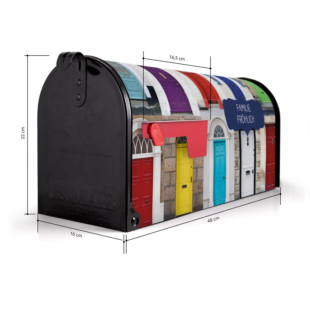 Der amerikanische Briefkasten von banjado mit Türen Motiv bietet Ihnen ausreichend Fassungsvermögen, um große A4 Sendungen und Zeitschriften zu empfangen. Die typisch amerikanische rote Fahne zeigt Ihnen an, wenn Sie Post erhalten haben. Die US-Mailbox besteht aus verzinktem Stahlblech welches lackiert wurde und ist 48 x 22 x 16 CM (BxHxT) groß. Die Folie mit Motiv Türen besteht aus einer wetter- und UV-resistenten Folie, die mit einem Schutzlaminat überzogen ist, sodass die US Mailbox zusätzlich vor Kratzern geschützt ist. An der Unterkante sind 4 Löcher je Seite um die Mailbox, typisch amerikanisch, an einem Holzpfahl oder einem Zaun zu befestigen. Auf Wunsch können Sie bei uns den passenden Standfuß oder die passende Wandhalterung kaufen um die US-Mailbox sicher zu befestigen. Wir bieten Ihnen ebenfalls Namensschilder, bereits beschriftet oder frei zu beschriften, und verschiedene selbst gestaltete Bitte-Keine-Werbung-Aufkleber.