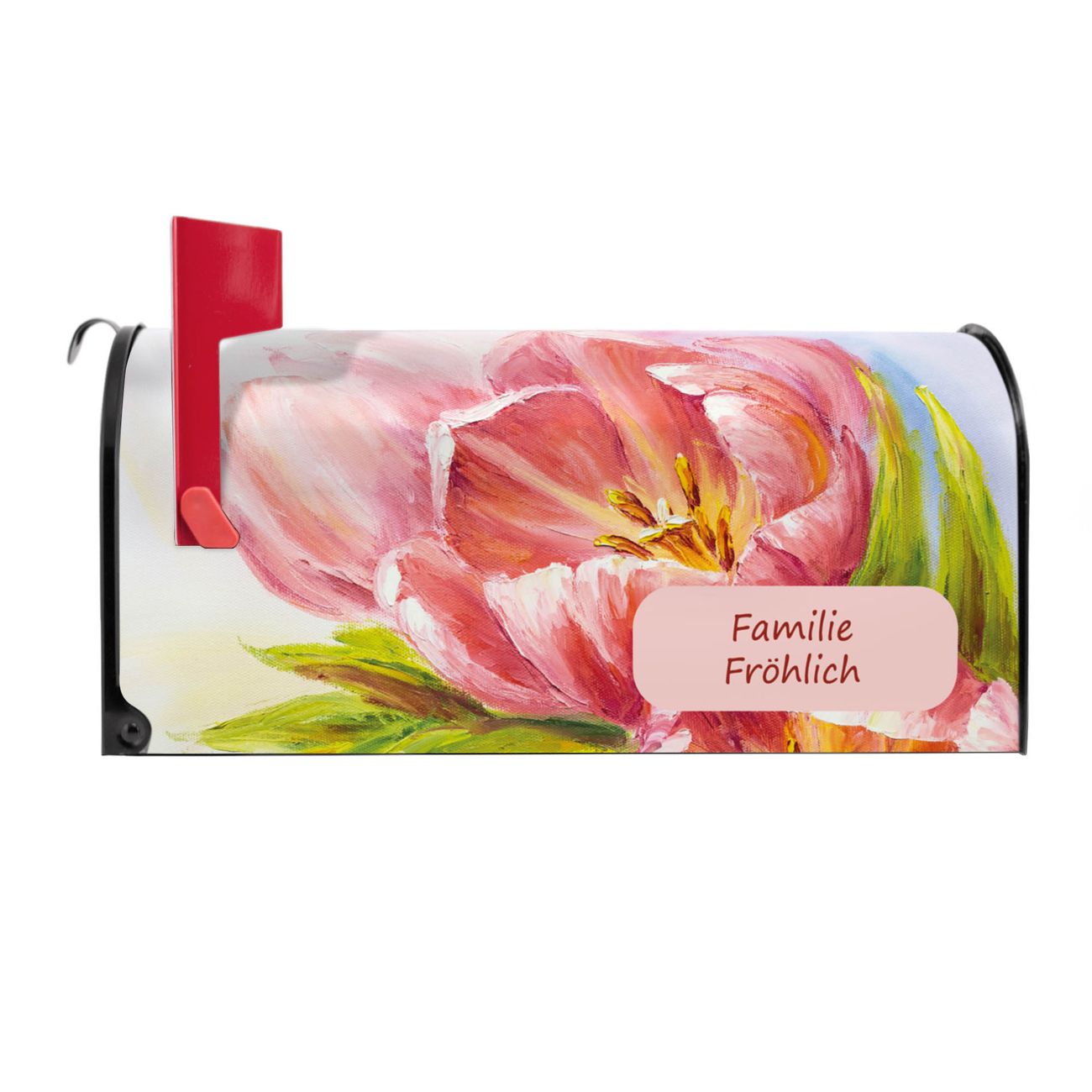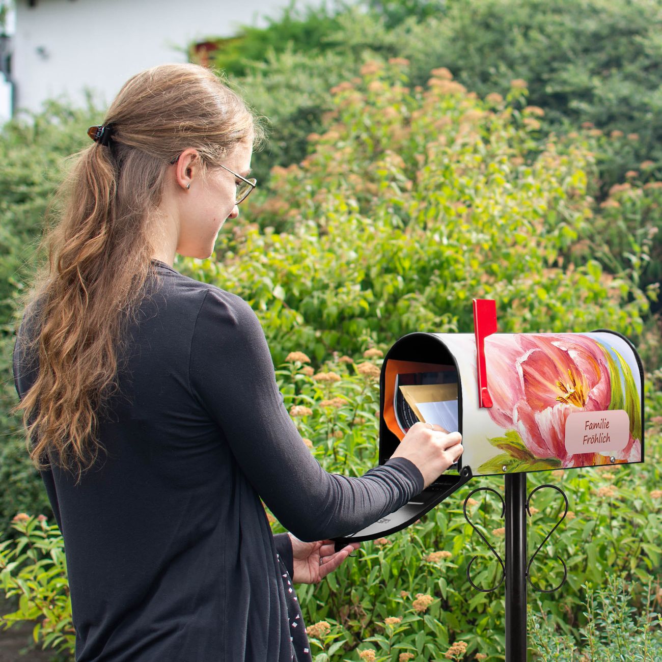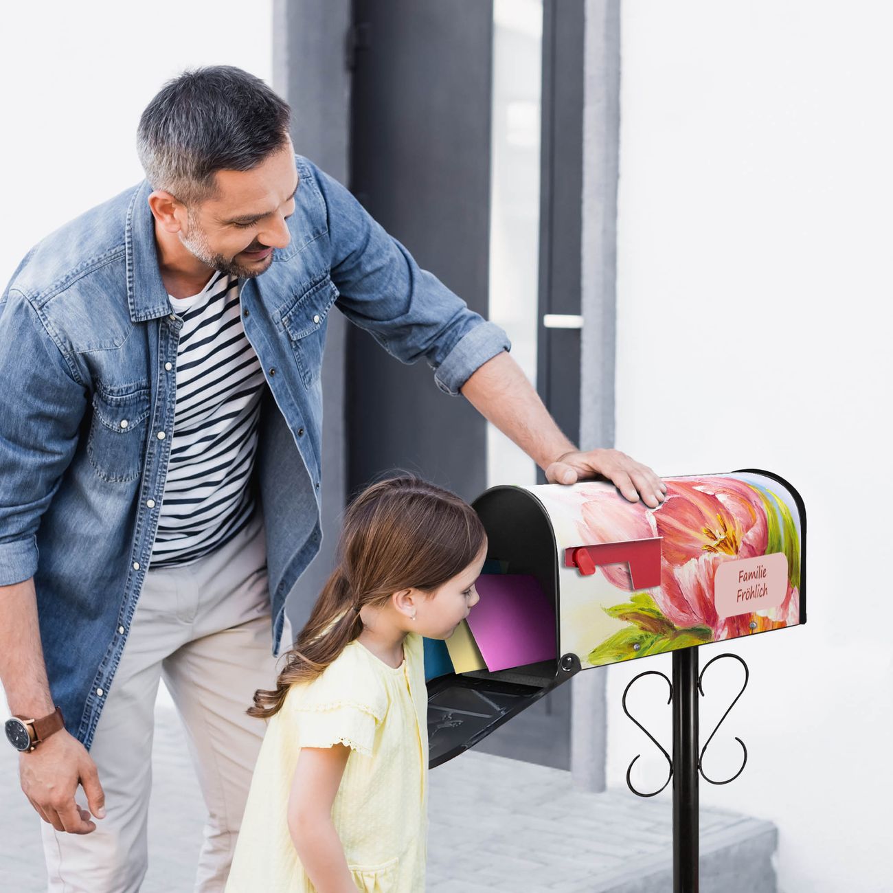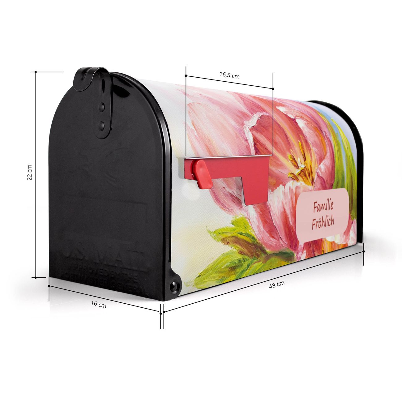 Der amerikanische Briefkasten von banjado mit Tulpen Detail Motiv bietet Ihnen ausreichend Fassungsvermögen, um große A4 Sendungen und Zeitschriften zu empfangen. Die typisch amerikanische rote Fahne zeigt Ihnen an, wenn Sie Post erhalten haben. Die US-Mailbox besteht aus verzinktem Stahlblech welches lackiert wurde und ist 48 x 22 x 16 CM (BxHxT) groß. Die Folie mit Motiv Tulpen Detail besteht aus einer wetter- und UV-resistenten Folie, die mit einem Schutzlaminat überzogen ist, sodass die US Mailbox zusätzlich vor Kratzern geschützt ist. An der Unterkante sind 4 Löcher je Seite um die Mailbox, typisch amerikanisch, an einem Holzpfahl oder einem Zaun zu befestigen. Auf Wunsch können Sie bei uns den passenden Standfuß oder die passende Wandhalterung kaufen um die US-Mailbox sicher zu befestigen. Wir bieten Ihnen ebenfalls Namensschilder, bereits beschriftet oder frei zu beschriften, und verschiedene selbst gestaltete Bitte-Keine-Werbung-Aufkleber.
