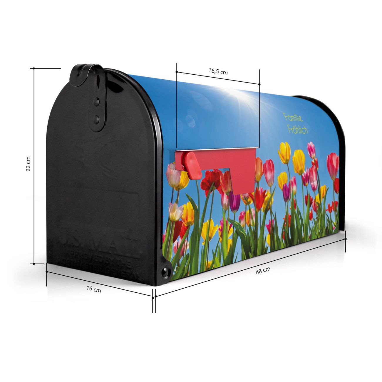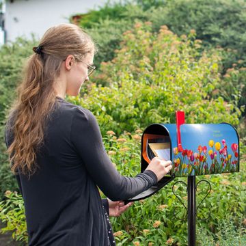 Der amerikanische Briefkasten von banjado mit Tulpenmeer Motiv bietet Ihnen ausreichend Fassungsvermögen, um große A4 Sendungen und Zeitschriften zu empfangen. Die typisch amerikanische rote Fahne zeigt Ihnen an, wenn Sie Post erhalten haben. Die US-Mailbox besteht aus verzinktem Stahlblech welches lackiert wurde und ist 48 x 22 x 16 CM (BxHxT) groß. Die Folie mit Motiv Tulpenmeer besteht aus einer wetter- und UV-resistenten Folie, die mit einem Schutzlaminat überzogen ist, sodass die US Mailbox zusätzlich vor Kratzern geschützt ist. An der Unterkante sind 4 Löcher je Seite um die Mailbox, typisch amerikanisch, an einem Holzpfahl oder einem Zaun zu befestigen. Auf Wunsch können Sie bei uns den passenden Standfuß oder die passende Wandhalterung kaufen um die US-Mailbox sicher zu befestigen. Wir bieten Ihnen ebenfalls Namensschilder, bereits beschriftet oder frei zu beschriften, und verschiedene selbst gestaltete Bitte-Keine-Werbung-Aufkleber.