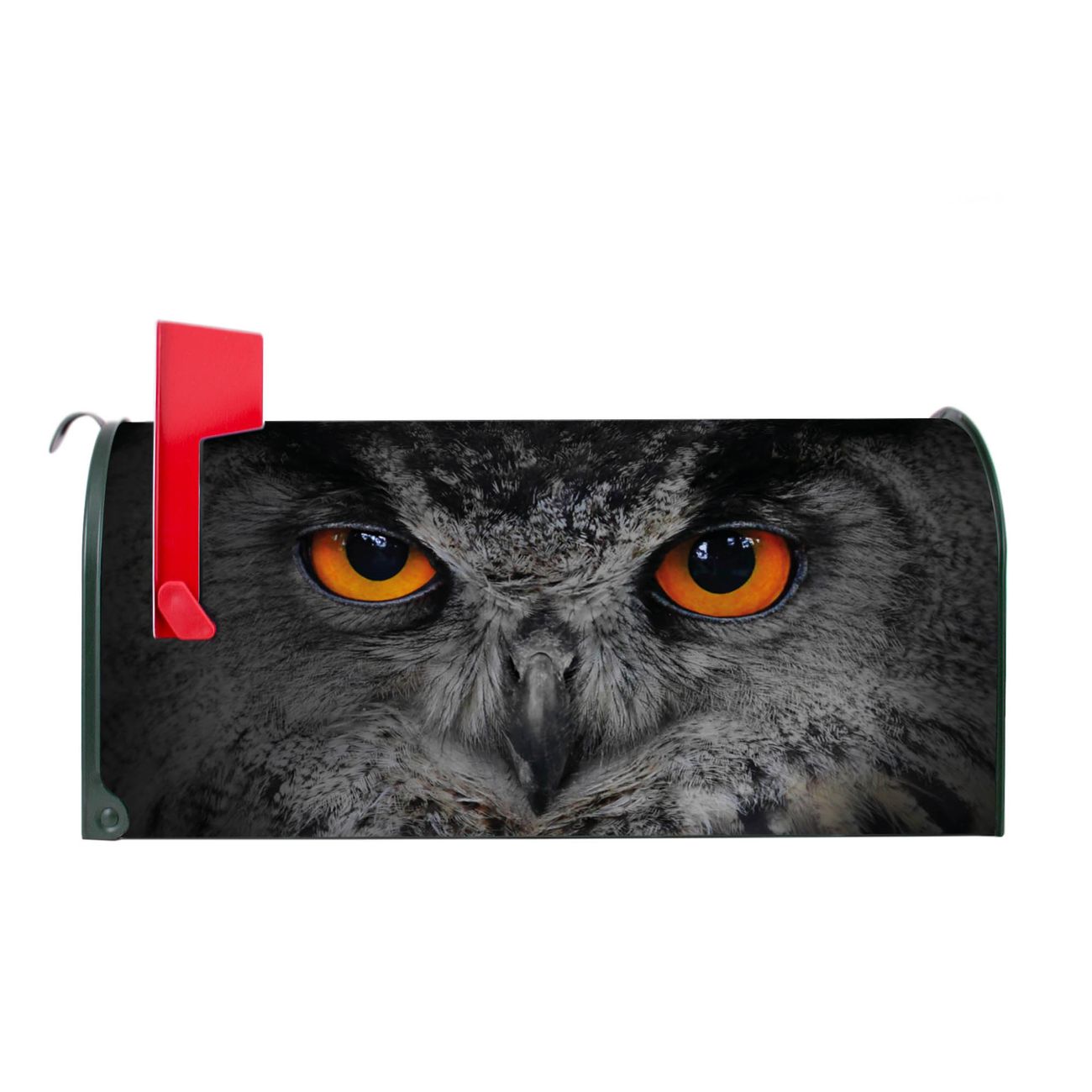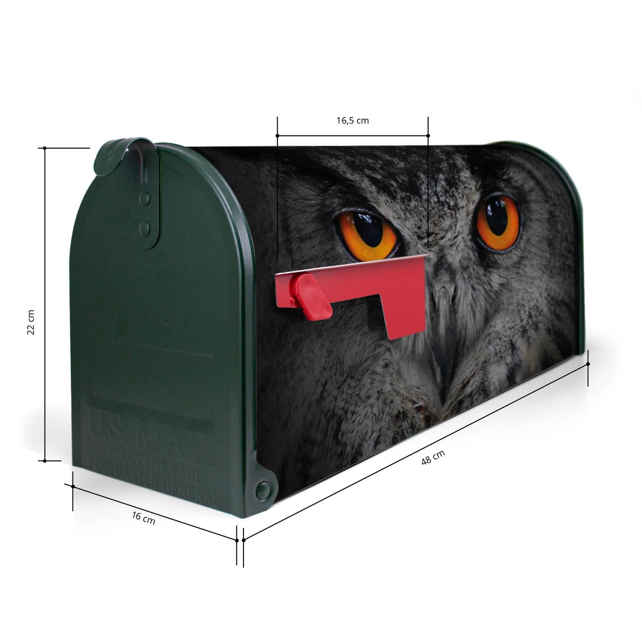 Der amerikanische Briefkasten von banjado mit Uhu Motiv bietet Ihnen ausreichend Fassungsvermögen, um große A4 Sendungen und Zeitschriften zu empfangen. Die typisch amerikanische rote Fahne zeigt Ihnen an, wenn Sie Post erhalten haben. Die US-Mailbox besteht aus verzinktem Stahlblech welches lackiert wurde und ist 48 x 22 x 16 CM (BxHxT) groß. Die Folie mit Motiv Uhu besteht aus einer wetter- und UV-resistenten Folie, die mit einem Schutzlaminat überzogen ist, sodass die US Mailbox zusätzlich vor Kratzern geschützt ist. An der Unterkante sind 4 Löcher je Seite um die Mailbox, typisch amerikanisch, an einem Holzpfahl oder einem Zaun zu befestigen. Auf Wunsch können Sie bei uns den passenden Standfuß oder die passende Wandhalterung kaufen um die US-Mailbox sicher zu befestigen. Wir bieten Ihnen ebenfalls Namensschilder, bereits beschriftet oder frei zu beschriften, und verschiedene selbst gestaltete Bitte-Keine-Werbung-Aufkleber.