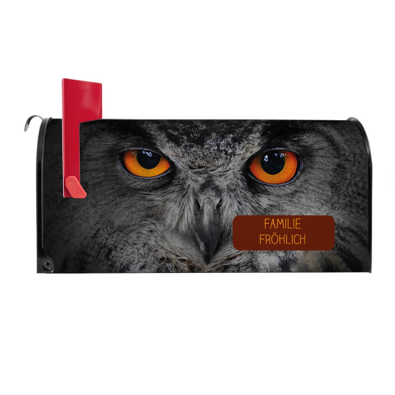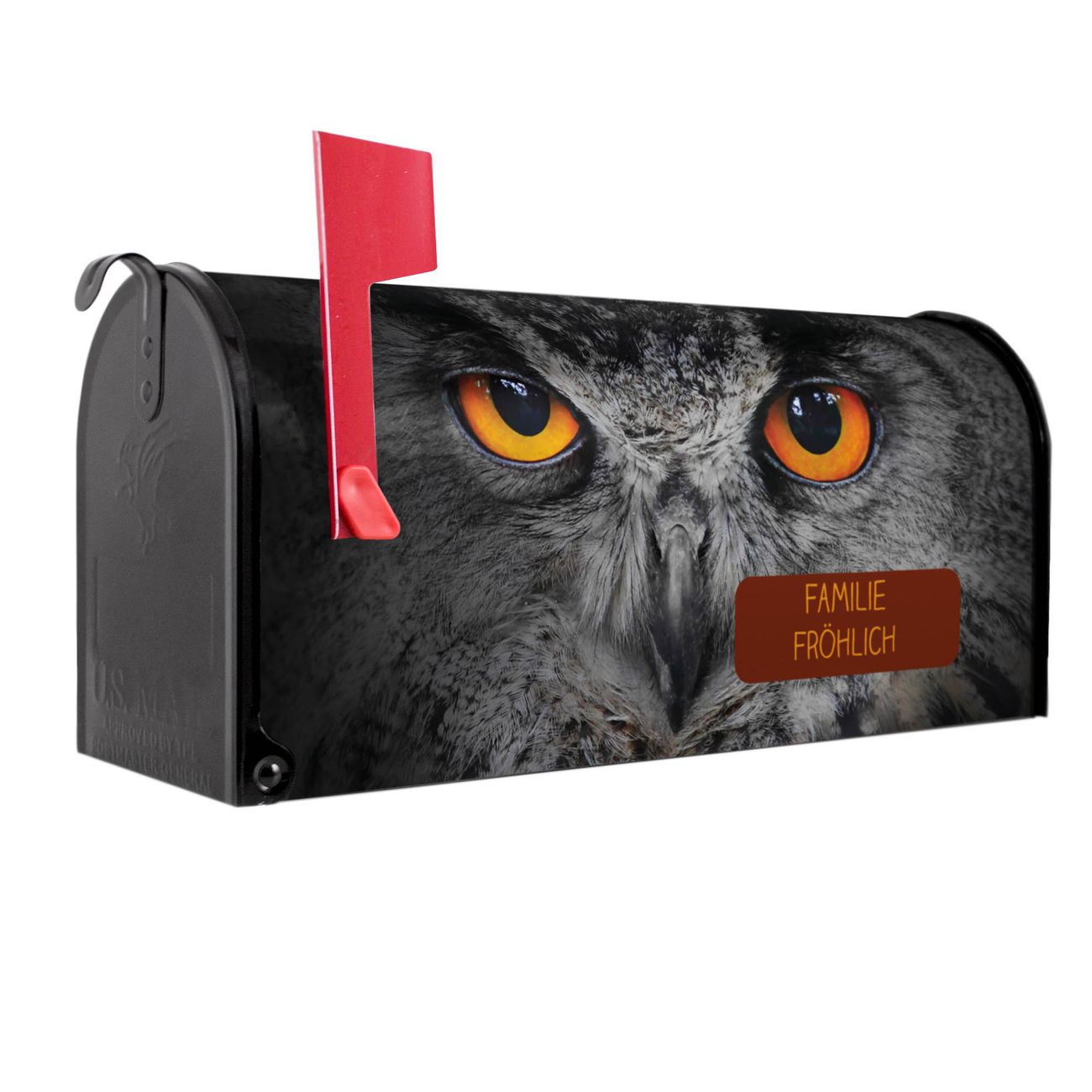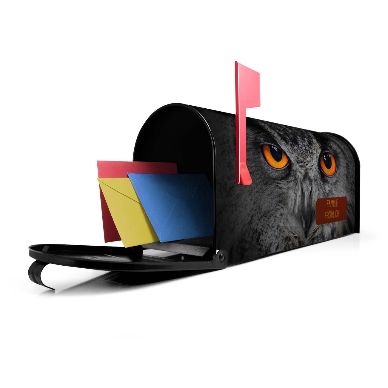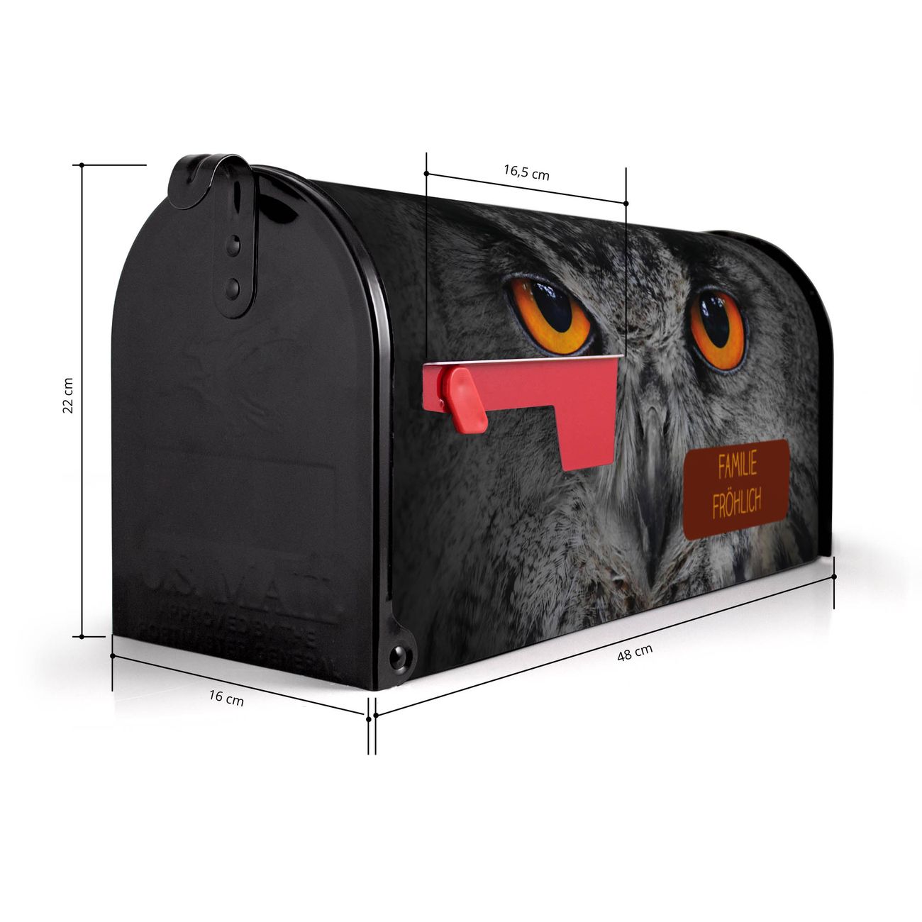 Der amerikanische Briefkasten von banjado mit Uhu Motiv bietet Ihnen ausreichend Fassungsvermögen, um große A4 Sendungen und Zeitschriften zu empfangen. Die typisch amerikanische rote Fahne zeigt Ihnen an, wenn Sie Post erhalten haben. Die US-Mailbox besteht aus verzinktem Stahlblech welches lackiert wurde und ist 48 x 22 x 16 CM (BxHxT) groß. Die Folie mit Motiv Uhu besteht aus einer wetter- und UV-resistenten Folie, die mit einem Schutzlaminat überzogen ist, sodass die US Mailbox zusätzlich vor Kratzern geschützt ist. An der Unterkante sind 4 Löcher je Seite um die Mailbox, typisch amerikanisch, an einem Holzpfahl oder einem Zaun zu befestigen. Auf Wunsch können Sie bei uns den passenden Standfuß oder die passende Wandhalterung kaufen um die US-Mailbox sicher zu befestigen. Wir bieten Ihnen ebenfalls Namensschilder, bereits beschriftet oder frei zu beschriften, und verschiedene selbst gestaltete Bitte-Keine-Werbung-Aufkleber.