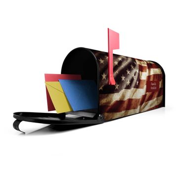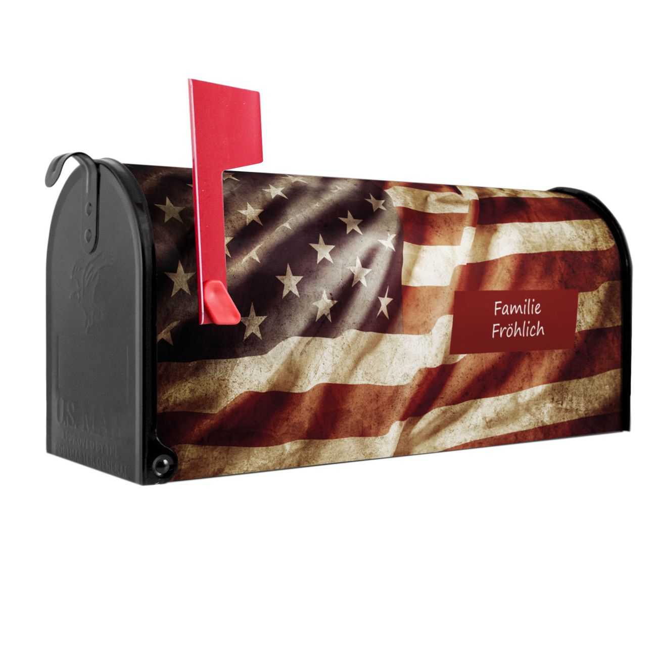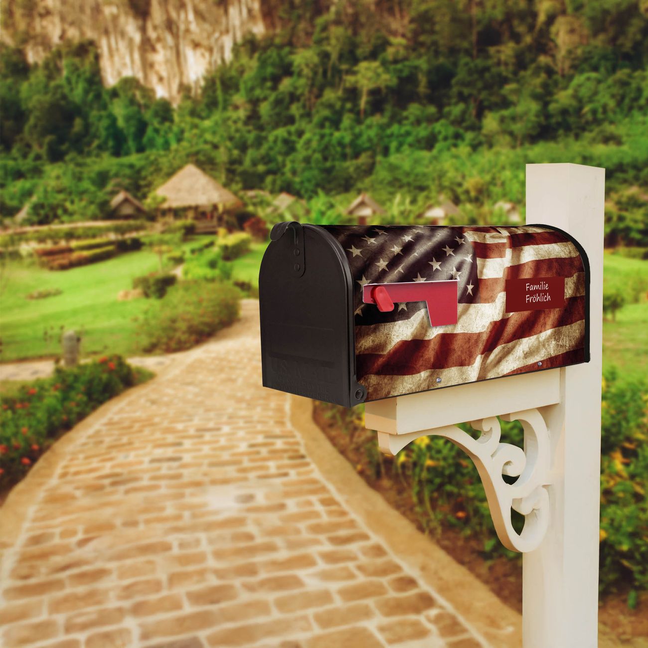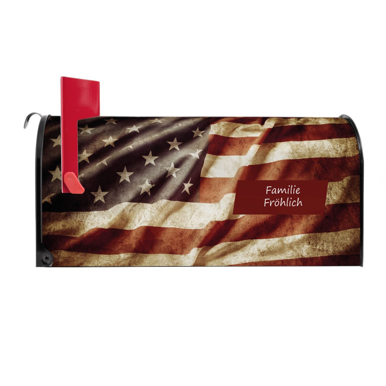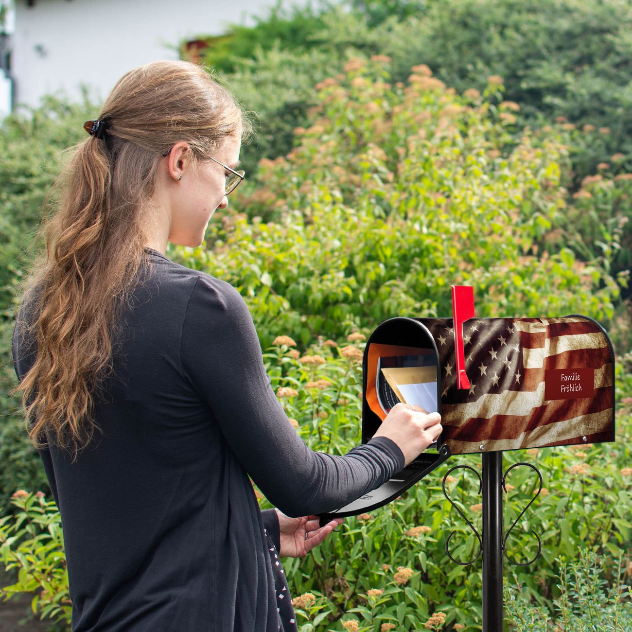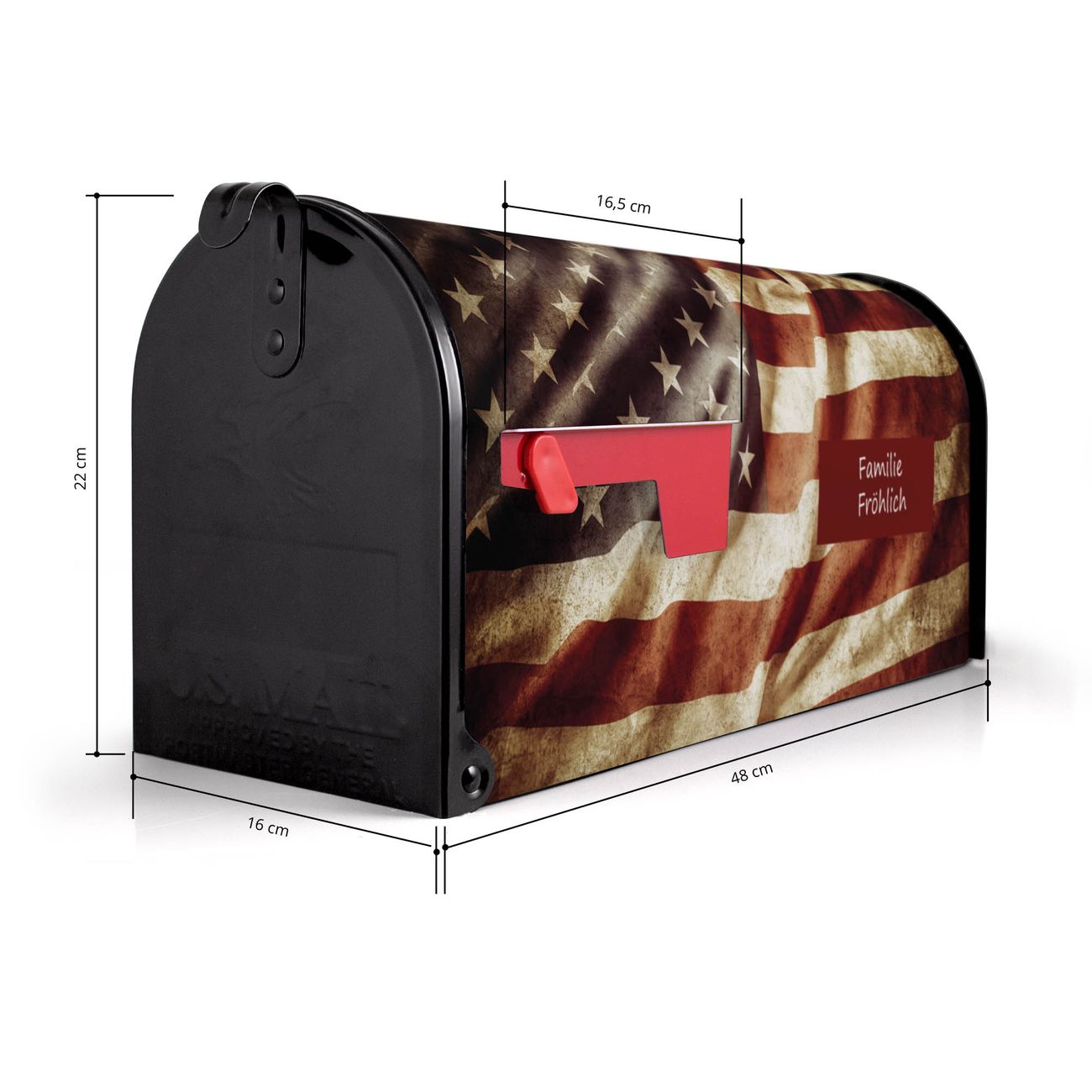 Der amerikanische Briefkasten von banjado mit United States Motiv bietet Ihnen ausreichend Fassungsvermögen, um große A4 Sendungen und Zeitschriften zu empfangen. Die typisch amerikanische rote Fahne zeigt Ihnen an, wenn Sie Post erhalten haben. Die US-Mailbox besteht aus verzinktem Stahlblech welches lackiert wurde und ist 48 x 22 x 16 CM (BxHxT) groß. Die Folie mit Motiv United States besteht aus einer wetter- und UV-resistenten Folie, die mit einem Schutzlaminat überzogen ist, sodass die US Mailbox zusätzlich vor Kratzern geschützt ist. An der Unterkante sind 4 Löcher je Seite um die Mailbox, typisch amerikanisch, an einem Holzpfahl oder einem Zaun zu befestigen. Auf Wunsch können Sie bei uns den passenden Standfuß oder die passende Wandhalterung kaufen um die US-Mailbox sicher zu befestigen. Wir bieten Ihnen ebenfalls Namensschilder, bereits beschriftet oder frei zu beschriften, und verschiedene selbst gestaltete Bitte-Keine-Werbung-Aufkleber.