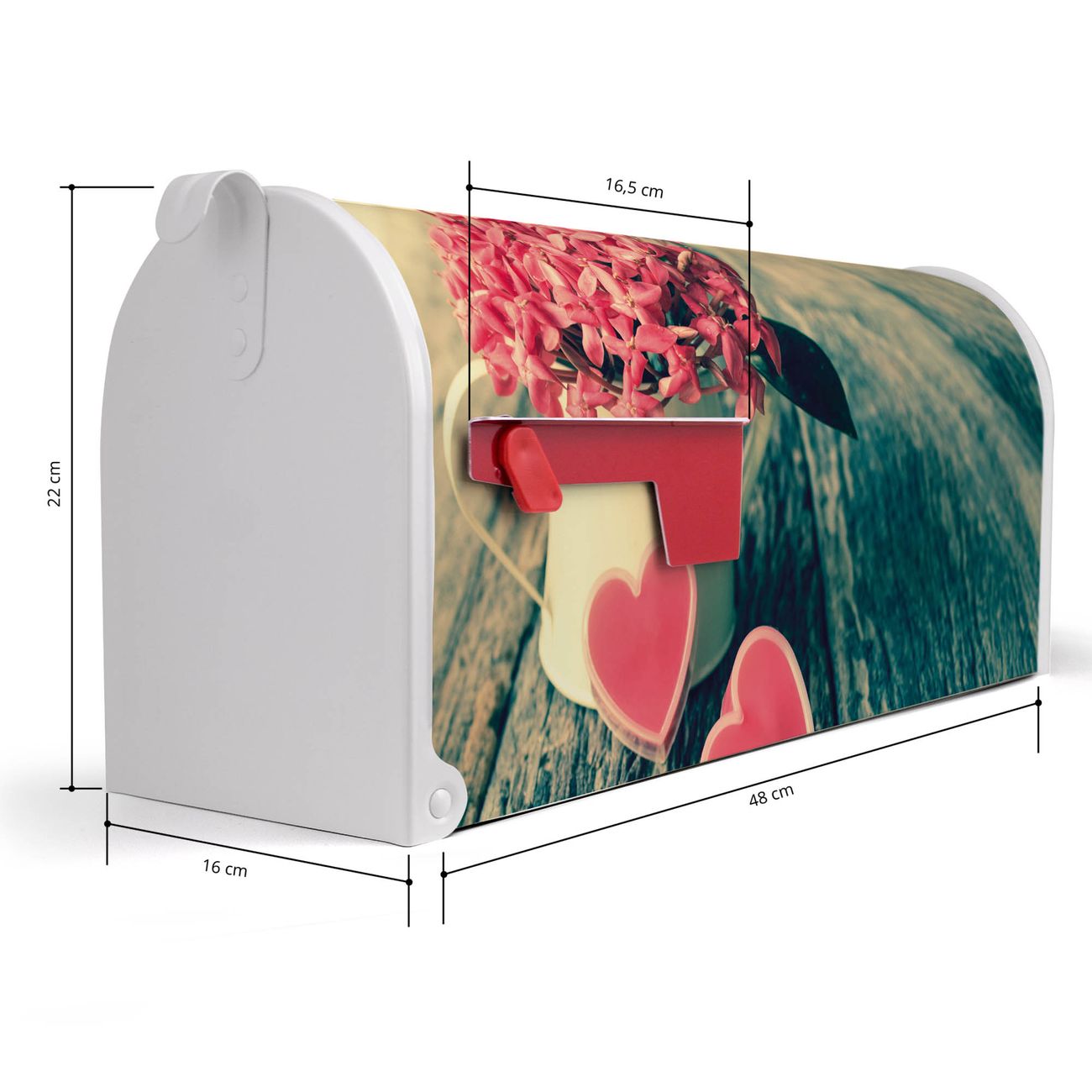 Der amerikanische Briefkasten von banjado mit Valentin Motiv bietet Ihnen ausreichend Fassungsvermögen, um große A4 Sendungen und Zeitschriften zu empfangen. Die typisch amerikanische rote Fahne zeigt Ihnen an, wenn Sie Post erhalten haben. Die US-Mailbox besteht aus verzinktem Stahlblech welches lackiert wurde und ist 48 x 22 x 16 CM (BxHxT) groß. Die Folie mit Motiv Valentin besteht aus einer wetter- und UV-resistenten Folie, die mit einem Schutzlaminat überzogen ist, sodass die US Mailbox zusätzlich vor Kratzern geschützt ist. An der Unterkante sind 4 Löcher je Seite um die Mailbox, typisch amerikanisch, an einem Holzpfahl oder einem Zaun zu befestigen. Auf Wunsch können Sie bei uns den passenden Standfuß oder die passende Wandhalterung kaufen um die US-Mailbox sicher zu befestigen. Wir bieten Ihnen ebenfalls Namensschilder, bereits beschriftet oder frei zu beschriften, und verschiedene selbst gestaltete Bitte-Keine-Werbung-Aufkleber.