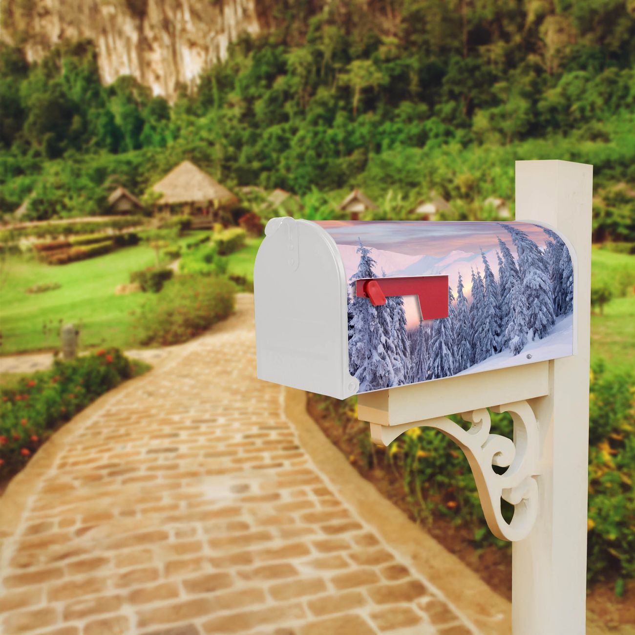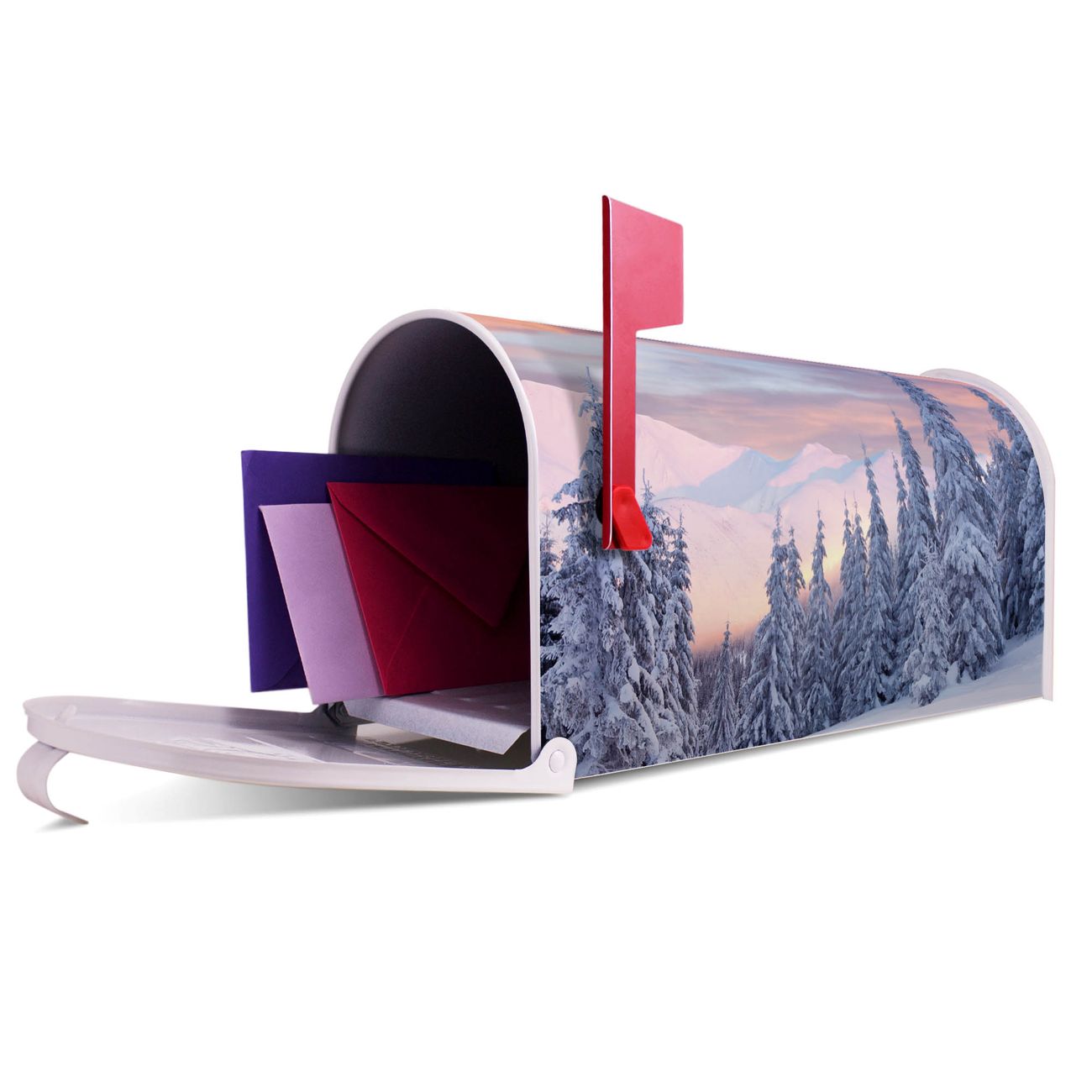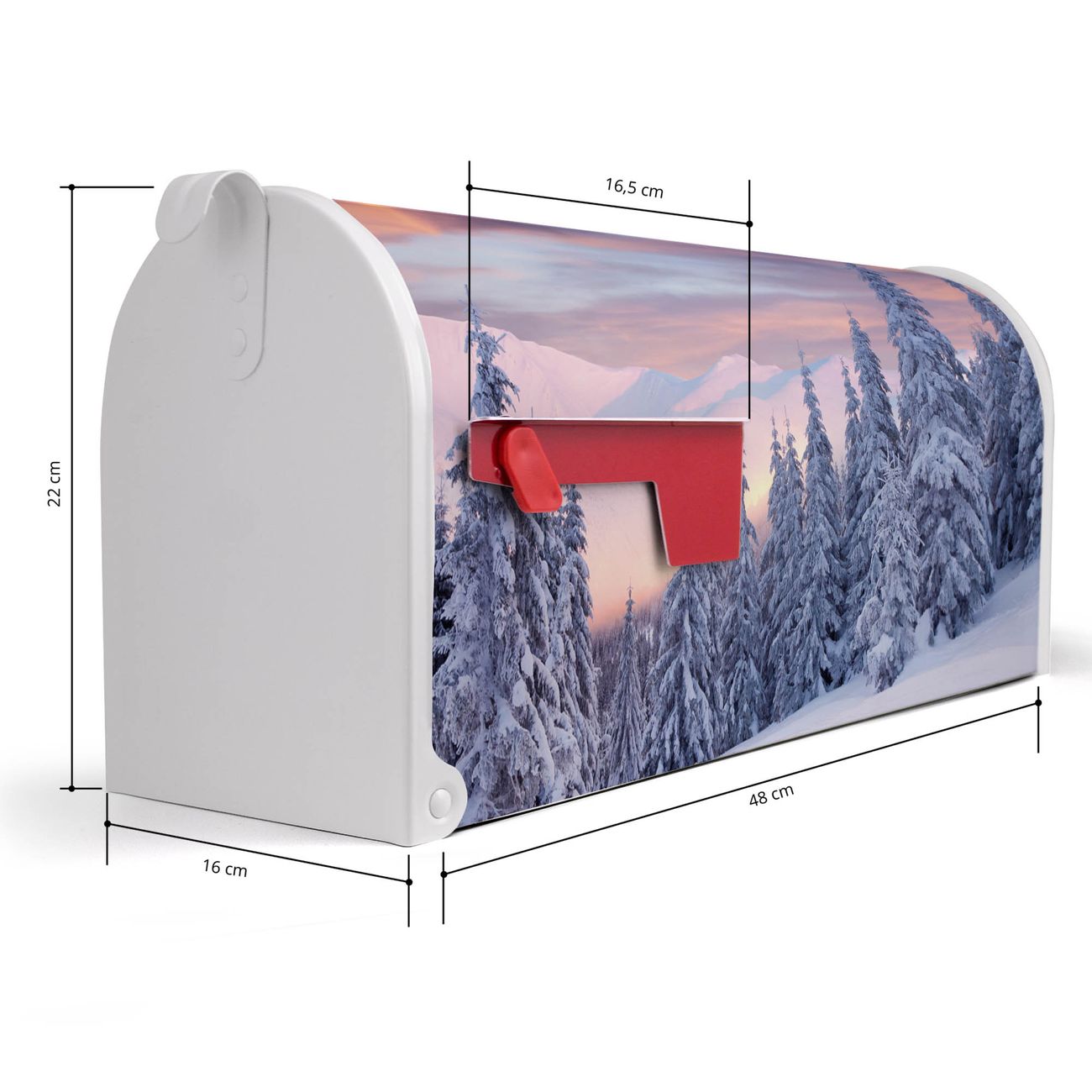 Der amerikanische Briefkasten von banjado mit Verschneite Berge Motiv bietet Ihnen ausreichend Fassungsvermögen, um große A4 Sendungen und Zeitschriften zu empfangen. Die typisch amerikanische rote Fahne zeigt Ihnen an, wenn Sie Post erhalten haben. Die US-Mailbox besteht aus verzinktem Stahlblech welches lackiert wurde und ist 48 x 22 x 16 CM (BxHxT) groß. Die Folie mit Motiv Verschneite Berge besteht aus einer wetter- und UV-resistenten Folie, die mit einem Schutzlaminat überzogen ist, sodass die US Mailbox zusätzlich vor Kratzern geschützt ist. An der Unterkante sind 4 Löcher je Seite um die Mailbox, typisch amerikanisch, an einem Holzpfahl oder einem Zaun zu befestigen. Auf Wunsch können Sie bei uns den passenden Standfuß oder die passende Wandhalterung kaufen um die US-Mailbox sicher zu befestigen. Wir bieten Ihnen ebenfalls Namensschilder, bereits beschriftet oder frei zu beschriften, und verschiedene selbst gestaltete Bitte-Keine-Werbung-Aufkleber.