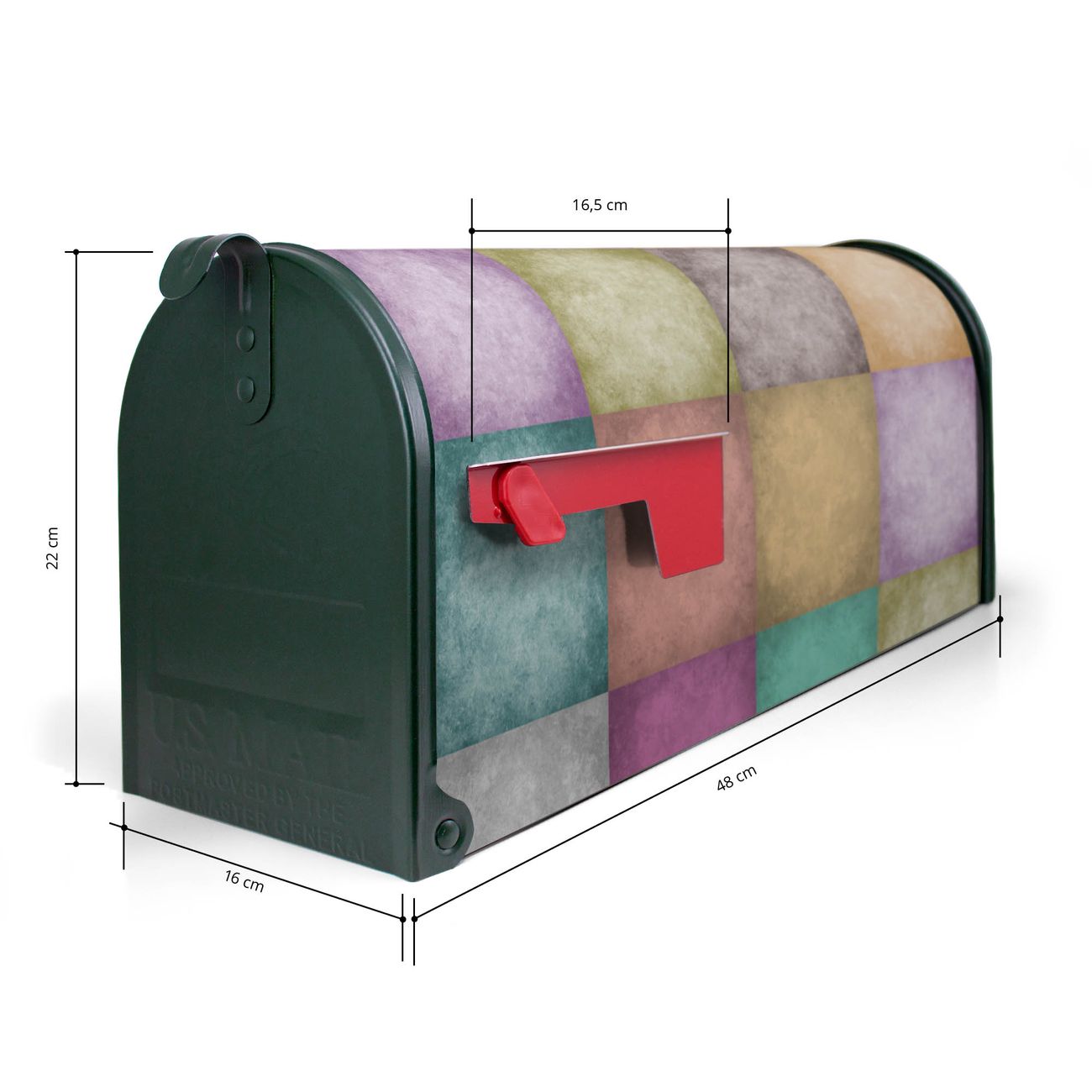 Unser amerikanischer Briefkasten mit dem Motiv Verwaschene Quadrate hat ein sehr ansprechendes und ausgefallenes Design, ist in der Grundfarbe weiß, grün oder schwarz erhältlich. Damit entlocken Sie Ihren Nachbarn und dem Postboten immer wieder ein Lächeln. Die Mailbox ist ein Original Import aus Mississippi USA und wird von unserer kleinen Manufaktur in Sachsen von Hand veredelt. Die US-Mailbox bietet ausreichend Platz auch für große Sendungen, eine Fahne die Ihnen Post anzeigt, wetterfestes und äußerst stabiles Material - so macht Post empfangen Freude.