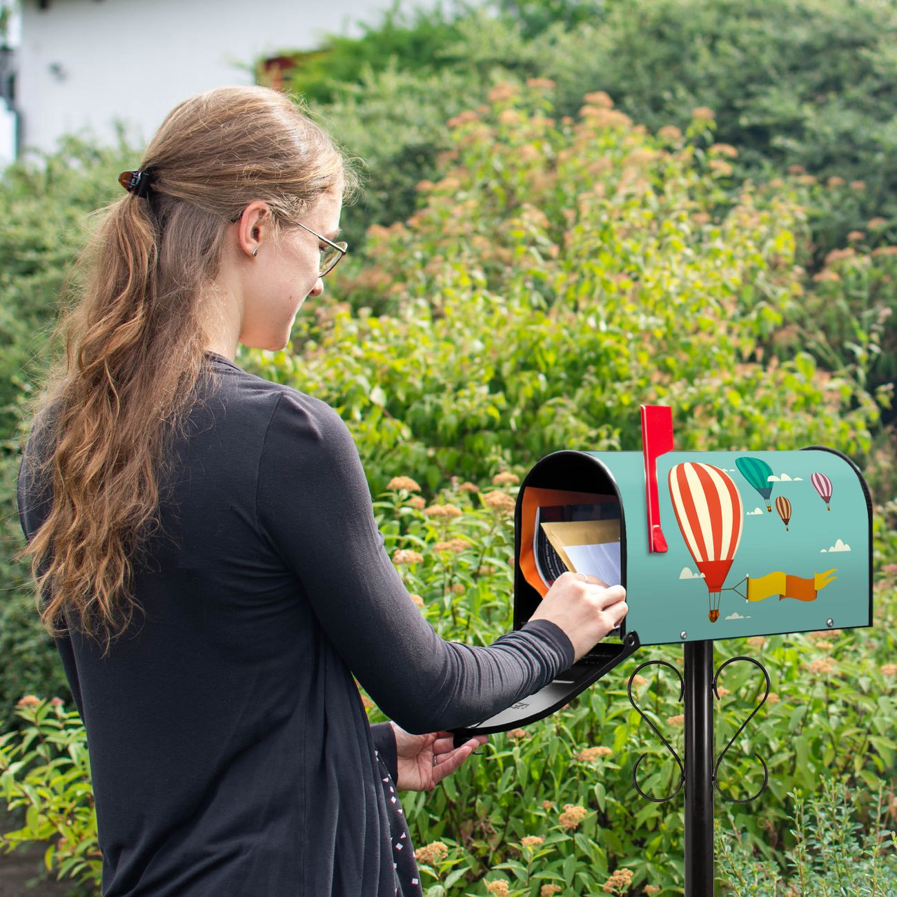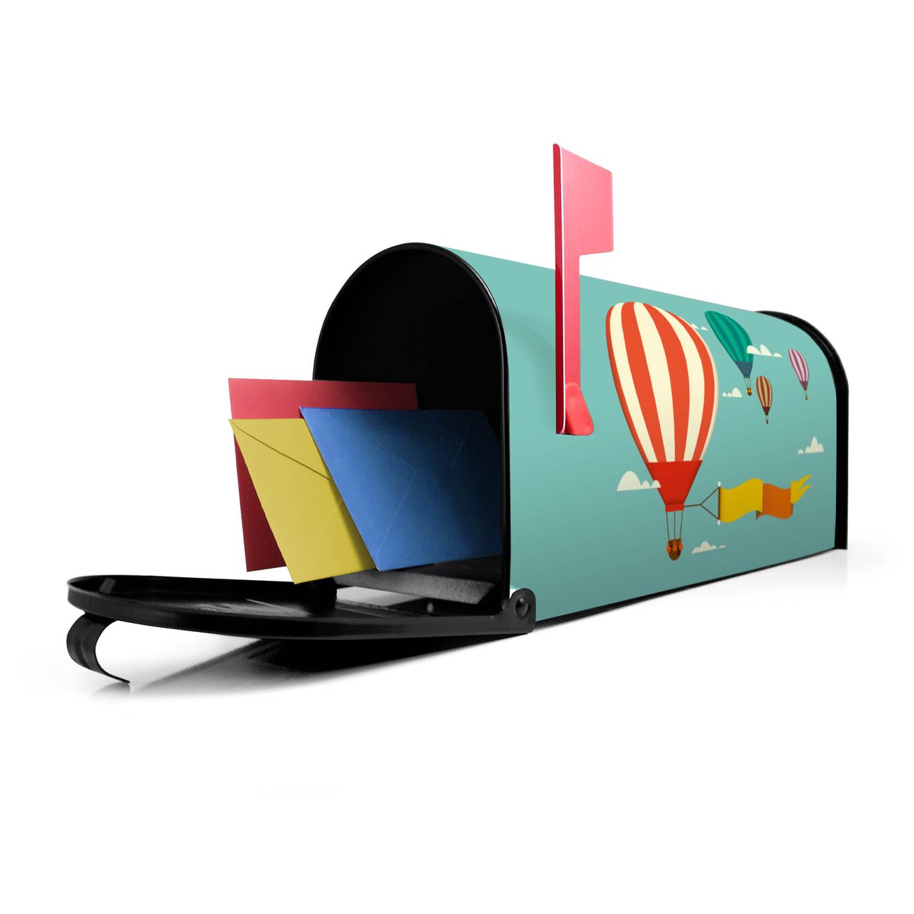 Der amerikanische Briefkasten von banjado mit Vier Ballons Motiv bietet Ihnen ausreichend Fassungsvermögen, um große A4 Sendungen und Zeitschriften zu empfangen. Die typisch amerikanische rote Fahne zeigt Ihnen an, wenn Sie Post erhalten haben. Die US-Mailbox besteht aus verzinktem Stahlblech welches lackiert wurde und ist 48 x 22 x 16 CM (BxHxT) groß. Die Folie mit Motiv Vier Ballons besteht aus einer wetter- und UV-resistenten Folie, die mit einem Schutzlaminat überzogen ist, sodass die US Mailbox zusätzlich vor Kratzern geschützt ist. An der Unterkante sind 4 Löcher je Seite um die Mailbox, typisch amerikanisch, an einem Holzpfahl oder einem Zaun zu befestigen. Auf Wunsch können Sie bei uns den passenden Standfuß oder die passende Wandhalterung kaufen um die US-Mailbox sicher zu befestigen. Wir bieten Ihnen ebenfalls Namensschilder, bereits beschriftet oder frei zu beschriften, und verschiedene selbst gestaltete Bitte-Keine-Werbung-Aufkleber.