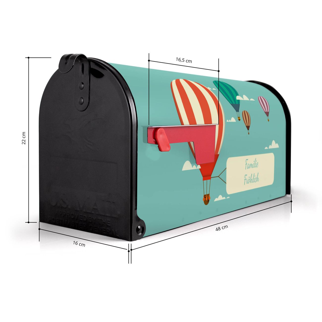 Der amerikanische Briefkasten von banjado mit Vier Ballons Motiv bietet Ihnen ausreichend Fassungsvermögen, um große A4 Sendungen und Zeitschriften zu empfangen. Die typisch amerikanische rote Fahne zeigt Ihnen an, wenn Sie Post erhalten haben. Die US-Mailbox besteht aus verzinktem Stahlblech welches lackiert wurde und ist 48 x 22 x 16 CM (BxHxT) groß. Die Folie mit Motiv Vier Ballons besteht aus einer wetter- und UV-resistenten Folie, die mit einem Schutzlaminat überzogen ist, sodass die US Mailbox zusätzlich vor Kratzern geschützt ist. An der Unterkante sind 4 Löcher je Seite um die Mailbox, typisch amerikanisch, an einem Holzpfahl oder einem Zaun zu befestigen. Auf Wunsch können Sie bei uns den passenden Standfuß oder die passende Wandhalterung kaufen um die US-Mailbox sicher zu befestigen. Wir bieten Ihnen ebenfalls Namensschilder, bereits beschriftet oder frei zu beschriften, und verschiedene selbst gestaltete Bitte-Keine-Werbung-Aufkleber.