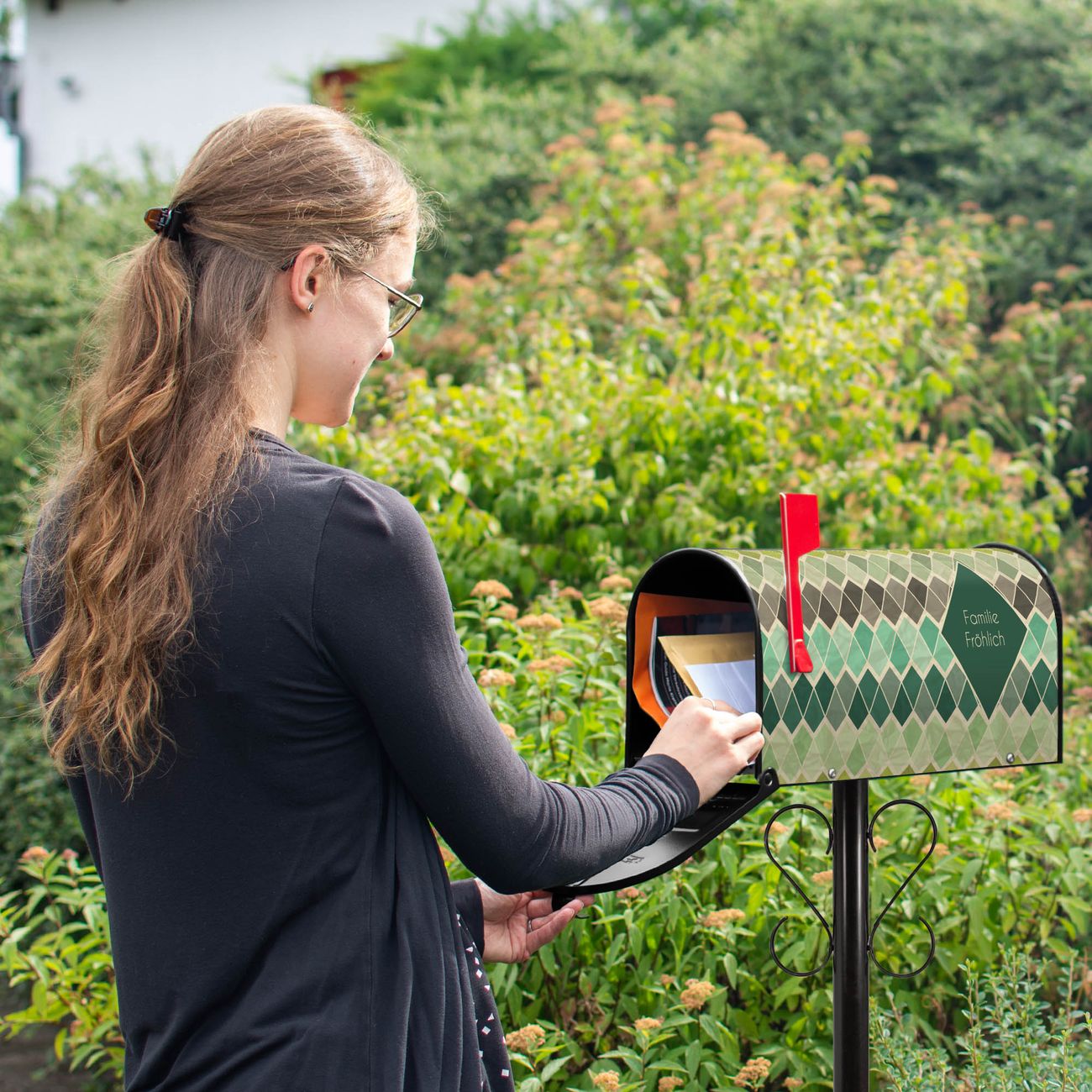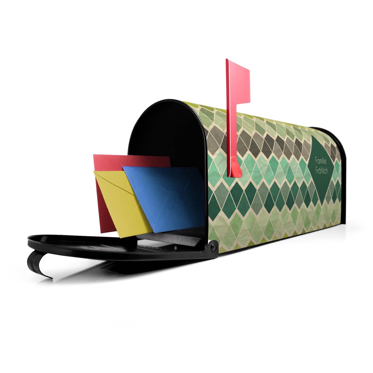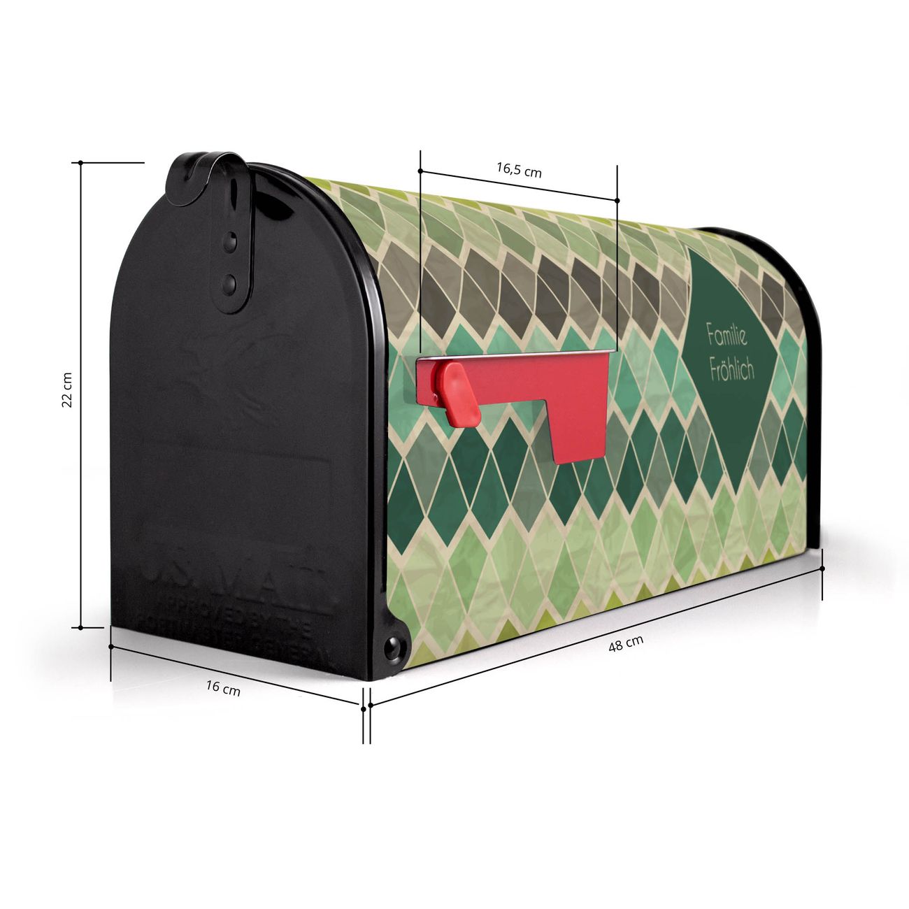 Der amerikanische Briefkasten von banjado mit Vier Farben Grün Motiv bietet Ihnen ausreichend Fassungsvermögen, um große A4 Sendungen und Zeitschriften zu empfangen. Die typisch amerikanische rote Fahne zeigt Ihnen an, wenn Sie Post erhalten haben. Die US-Mailbox besteht aus verzinktem Stahlblech welches lackiert wurde und ist 48 x 22 x 16 CM (BxHxT) groß. Die Folie mit Motiv Vier Farben Grün besteht aus einer wetter- und UV-resistenten Folie, die mit einem Schutzlaminat überzogen ist, sodass die US Mailbox zusätzlich vor Kratzern geschützt ist. An der Unterkante sind 4 Löcher je Seite um die Mailbox, typisch amerikanisch, an einem Holzpfahl oder einem Zaun zu befestigen. Auf Wunsch können Sie bei uns den passenden Standfuß oder die passende Wandhalterung kaufen um die US-Mailbox sicher zu befestigen. Wir bieten Ihnen ebenfalls Namensschilder, bereits beschriftet oder frei zu beschriften, und verschiedene selbst gestaltete Bitte-Keine-Werbung-Aufkleber.