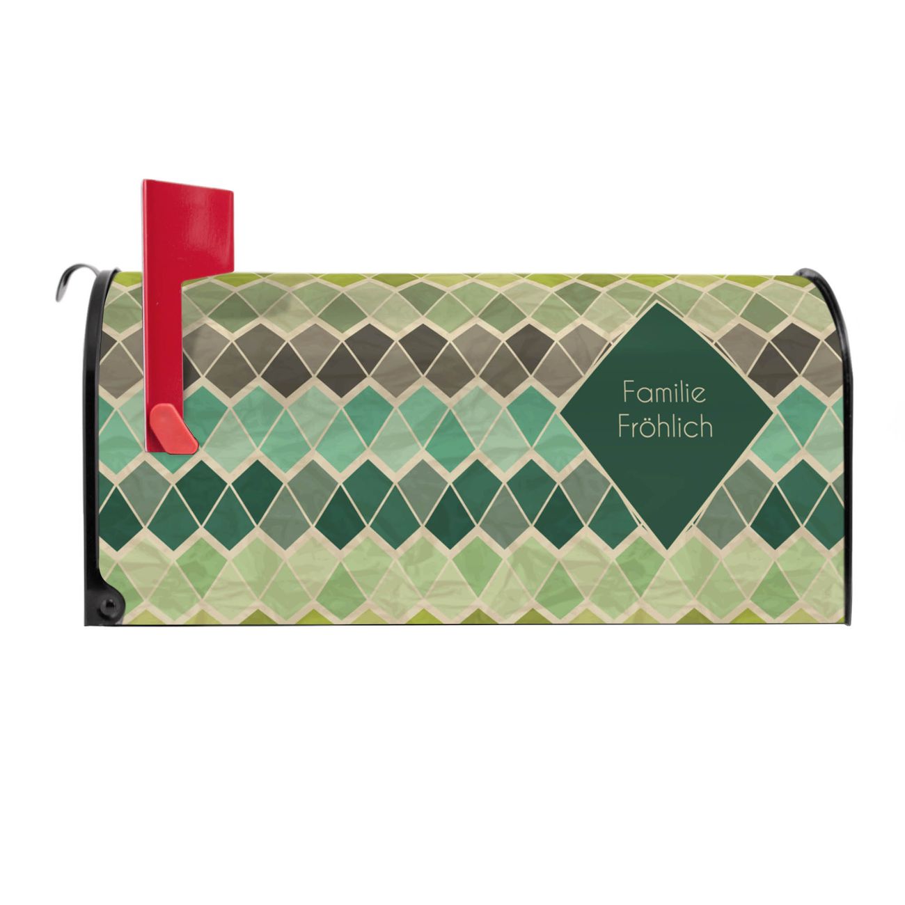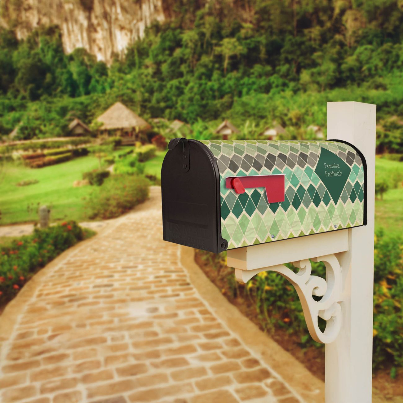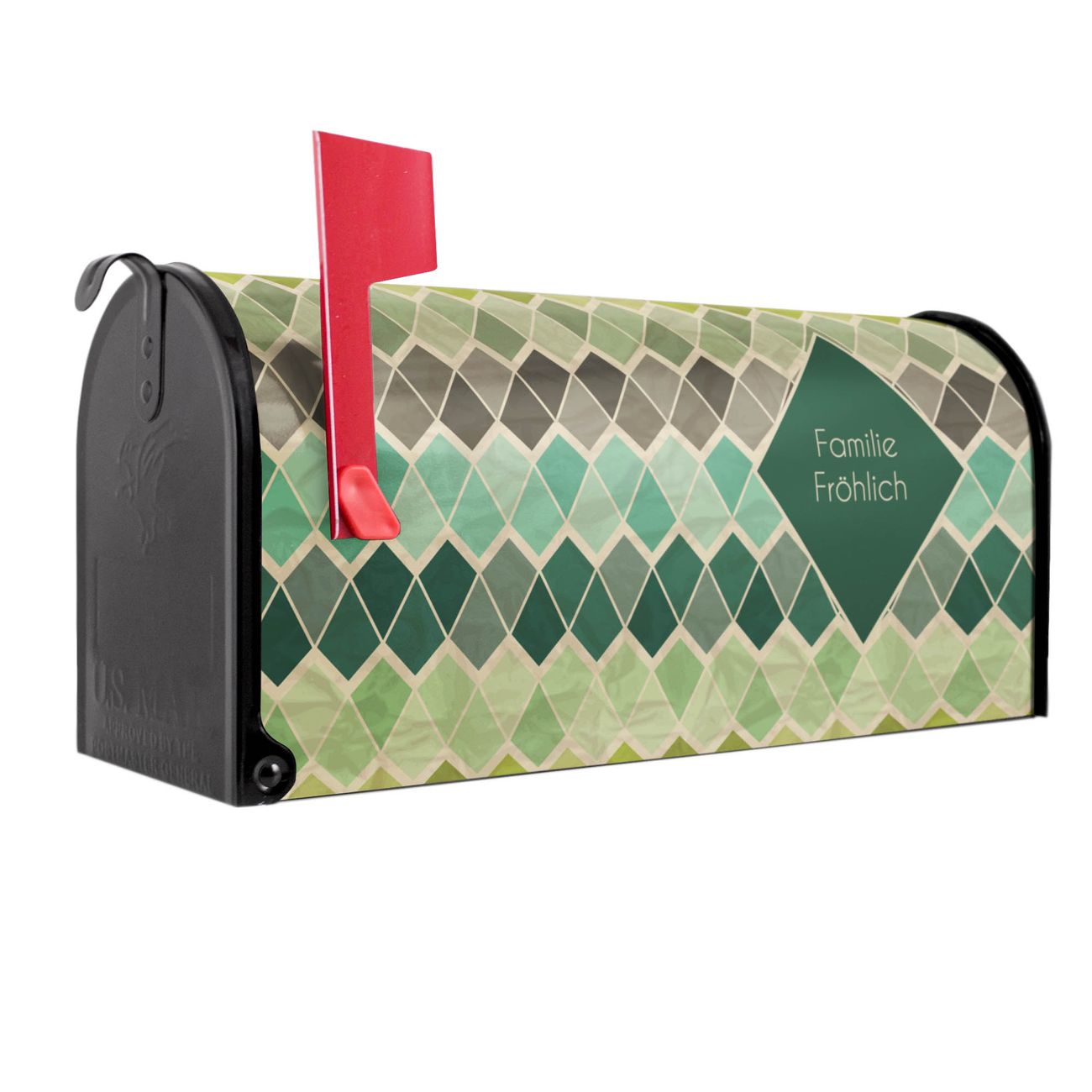 Der amerikanische Briefkasten von banjado mit Vier Farben Grün Motiv bietet Ihnen ausreichend Fassungsvermögen, um große A4 Sendungen und Zeitschriften zu empfangen. Die typisch amerikanische rote Fahne zeigt Ihnen an, wenn Sie Post erhalten haben. Die US-Mailbox besteht aus verzinktem Stahlblech welches lackiert wurde und ist 48 x 22 x 16 CM (BxHxT) groß. Die Folie mit Motiv Vier Farben Grün besteht aus einer wetter- und UV-resistenten Folie, die mit einem Schutzlaminat überzogen ist, sodass die US Mailbox zusätzlich vor Kratzern geschützt ist. An der Unterkante sind 4 Löcher je Seite um die Mailbox, typisch amerikanisch, an einem Holzpfahl oder einem Zaun zu befestigen. Auf Wunsch können Sie bei uns den passenden Standfuß oder die passende Wandhalterung kaufen um die US-Mailbox sicher zu befestigen. Wir bieten Ihnen ebenfalls Namensschilder, bereits beschriftet oder frei zu beschriften, und verschiedene selbst gestaltete Bitte-Keine-Werbung-Aufkleber.