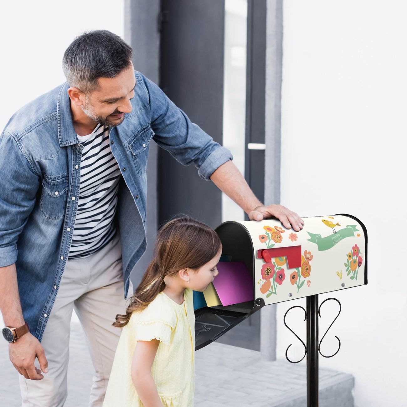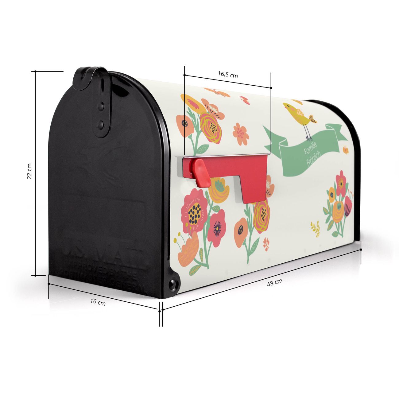Der amerikanische Briefkasten von banjado mit WT Vintage Flower Motiv bietet Ihnen ausreichend Fassungsvermögen, um große A4 Sendungen und Zeitschriften zu empfangen. Die typisch amerikanische rote Fahne zeigt Ihnen an, wenn Sie Post erhalten haben. Die US-Mailbox besteht aus verzinktem Stahlblech welches lackiert wurde und ist 48 x 22 x 16 CM (BxHxT) groß. Die Folie mit Motiv WT Vintage Flower besteht aus einer wetter- und UV-resistenten Folie, die mit einem Schutzlaminat überzogen ist, sodass die US Mailbox zusätzlich vor Kratzern geschützt ist. An der Unterkante sind 4 Löcher je Seite um die Mailbox, typisch amerikanisch, an einem Holzpfahl oder einem Zaun zu befestigen. Auf Wunsch können Sie bei uns den passenden Standfuß oder die passende Wandhalterung kaufen um die US-Mailbox sicher zu befestigen. Wir bieten Ihnen ebenfalls Namensschilder, bereits beschriftet oder frei zu beschriften, und verschiedene selbst gestaltete Bitte-Keine-Werbung-Aufkleber.