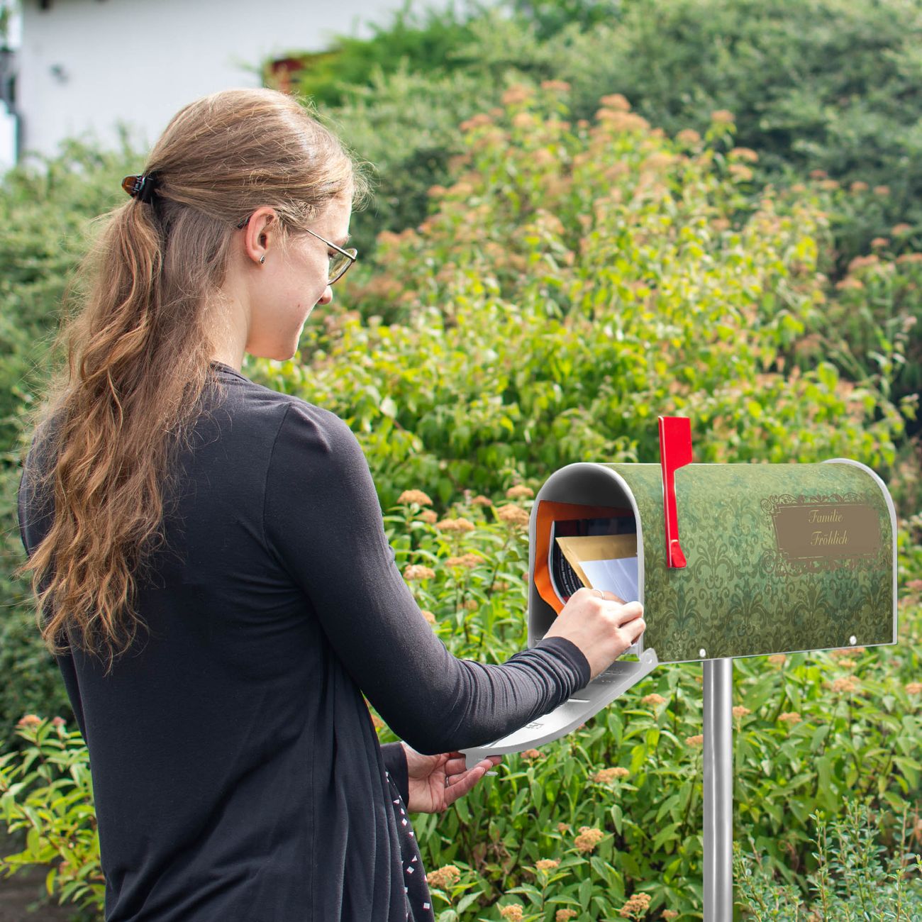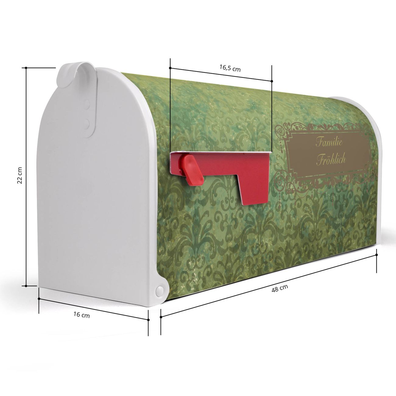 Der amerikanische Briefkasten von banjado mit WT Vintage Messing Motiv bietet Ihnen ausreichend Fassungsvermögen, um große A4 Sendungen und Zeitschriften zu empfangen. Die typisch amerikanische rote Fahne zeigt Ihnen an, wenn Sie Post erhalten haben. Die US-Mailbox besteht aus verzinktem Stahlblech welches lackiert wurde und ist 48 x 22 x 16 CM (BxHxT) groß. Die Folie mit Motiv WT Vintage Messing besteht aus einer wetter- und UV-resistenten Folie, die mit einem Schutzlaminat überzogen ist, sodass die US Mailbox zusätzlich vor Kratzern geschützt ist. An der Unterkante sind 4 Löcher je Seite um die Mailbox, typisch amerikanisch, an einem Holzpfahl oder einem Zaun zu befestigen. Auf Wunsch können Sie bei uns den passenden Standfuß oder die passende Wandhalterung kaufen um die US-Mailbox sicher zu befestigen. Wir bieten Ihnen ebenfalls Namensschilder, bereits beschriftet oder frei zu beschriften, und verschiedene selbst gestaltete Bitte-Keine-Werbung-Aufkleber.