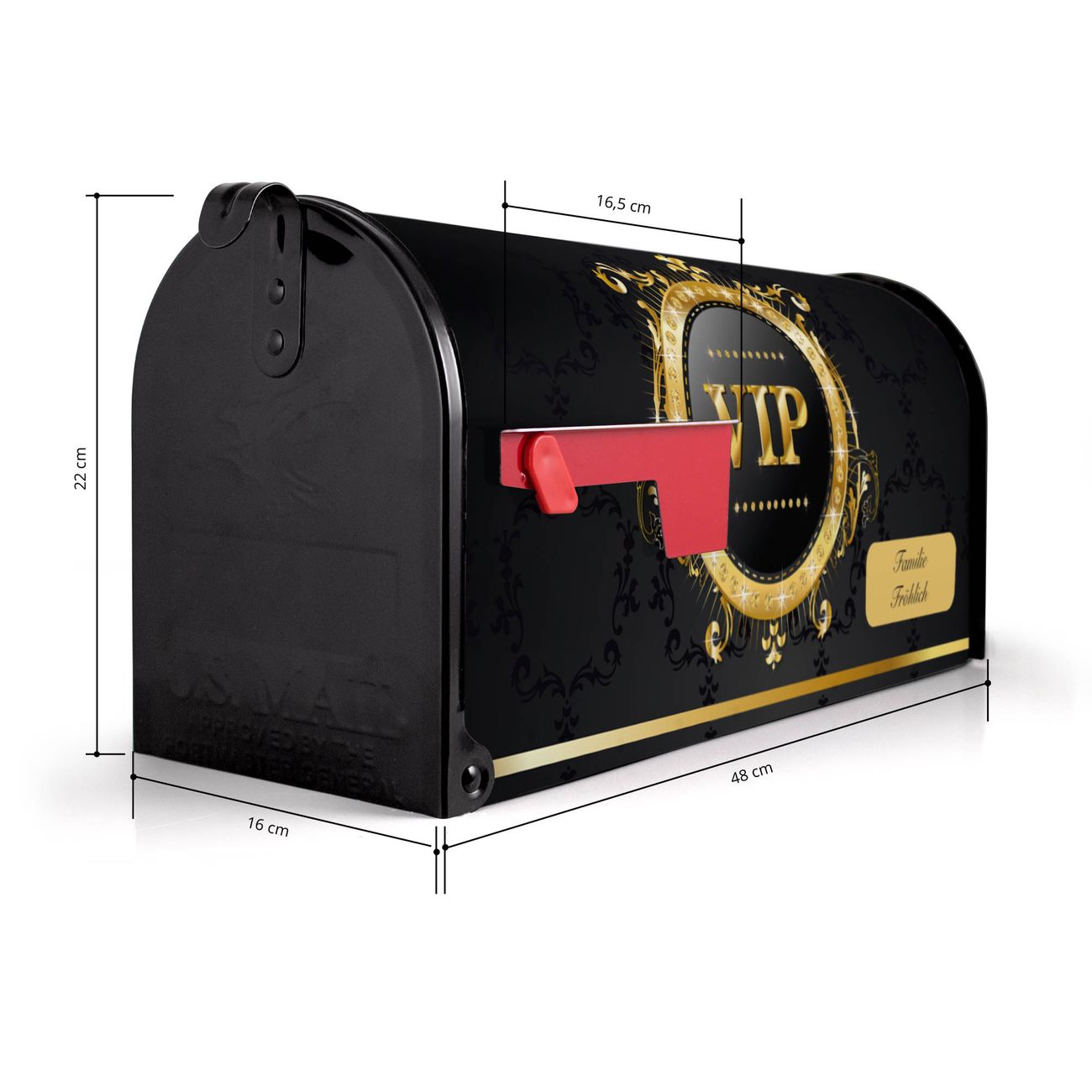 Der amerikanische Briefkasten von banjado mit VIP Motiv bietet Ihnen ausreichend Fassungsvermögen, um große A4 Sendungen und Zeitschriften zu empfangen. Die typisch amerikanische rote Fahne zeigt Ihnen an, wenn Sie Post erhalten haben. Die US-Mailbox besteht aus verzinktem Stahlblech welches lackiert wurde und ist 48 x 22 x 16 CM (BxHxT) groß. Die Folie mit Motiv VIP besteht aus einer wetter- und UV-resistenten Folie, die mit einem Schutzlaminat überzogen ist, sodass die US Mailbox zusätzlich vor Kratzern geschützt ist. An der Unterkante sind 4 Löcher je Seite um die Mailbox, typisch amerikanisch, an einem Holzpfahl oder einem Zaun zu befestigen. Auf Wunsch können Sie bei uns den passenden Standfuß oder die passende Wandhalterung kaufen um die US-Mailbox sicher zu befestigen. Wir bieten Ihnen ebenfalls Namensschilder, bereits beschriftet oder frei zu beschriften, und verschiedene selbst gestaltete Bitte-Keine-Werbung-Aufkleber.
