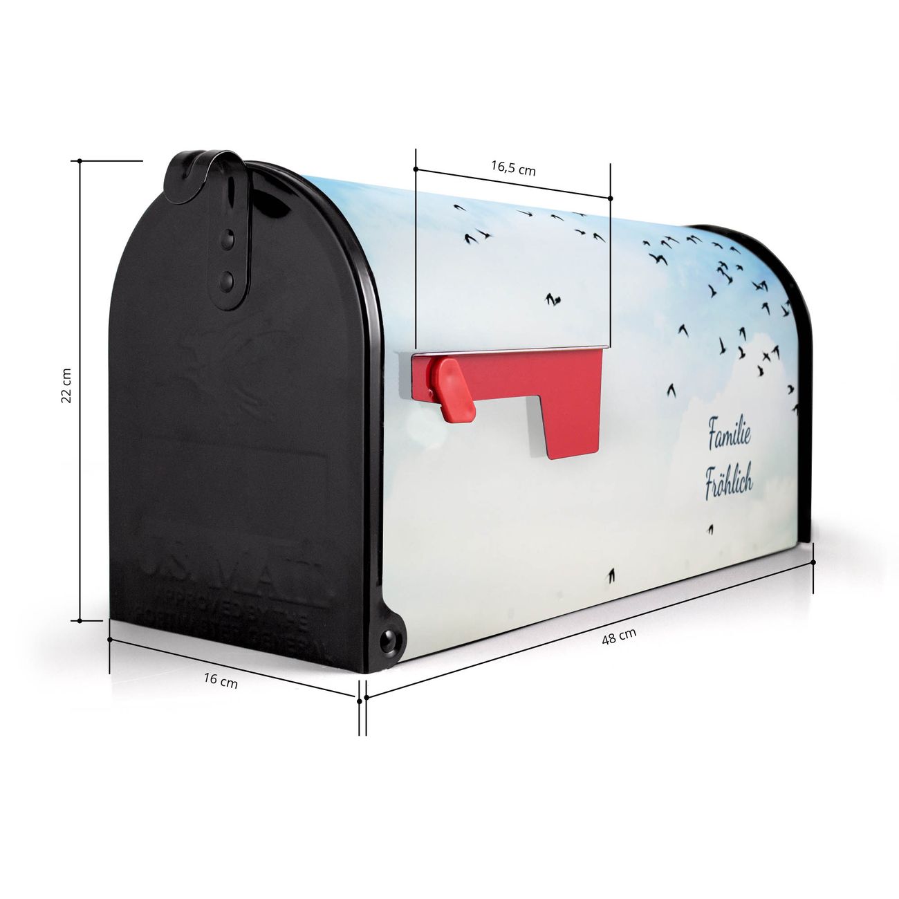 Der amerikanische Briefkasten von banjado mit Vögel am Himmel 2 Motiv bietet Ihnen ausreichend Fassungsvermögen, um große A4 Sendungen und Zeitschriften zu empfangen. Die typisch amerikanische rote Fahne zeigt Ihnen an, wenn Sie Post erhalten haben. Die US-Mailbox besteht aus verzinktem Stahlblech welches lackiert wurde und ist 48 x 22 x 16 CM (BxHxT) groß. Die Folie mit Motiv Vögel am Himmel 2 besteht aus einer wetter- und UV-resistenten Folie, die mit einem Schutzlaminat überzogen ist, sodass die US Mailbox zusätzlich vor Kratzern geschützt ist. An der Unterkante sind 4 Löcher je Seite um die Mailbox, typisch amerikanisch, an einem Holzpfahl oder einem Zaun zu befestigen. Auf Wunsch können Sie bei uns den passenden Standfuß oder die passende Wandhalterung kaufen um die US-Mailbox sicher zu befestigen. Wir bieten Ihnen ebenfalls Namensschilder, bereits beschriftet oder frei zu beschriften, und verschiedene selbst gestaltete Bitte-Keine-Werbung-Aufkleber.