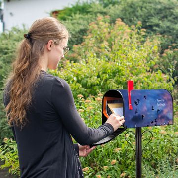 Der amerikanische Briefkasten von banjado mit Vögel am Himmel 3 Motiv bietet Ihnen ausreichend Fassungsvermögen, um große A4 Sendungen und Zeitschriften zu empfangen. Die typisch amerikanische rote Fahne zeigt Ihnen an, wenn Sie Post erhalten haben. Die US-Mailbox besteht aus verzinktem Stahlblech welches lackiert wurde und ist 48 x 22 x 16 CM (BxHxT) groß. Die Folie mit Motiv Vögel am Himmel 3 besteht aus einer wetter- und UV-resistenten Folie, die mit einem Schutzlaminat überzogen ist, sodass die US Mailbox zusätzlich vor Kratzern geschützt ist. An der Unterkante sind 4 Löcher je Seite um die Mailbox, typisch amerikanisch, an einem Holzpfahl oder einem Zaun zu befestigen. Auf Wunsch können Sie bei uns den passenden Standfuß oder die passende Wandhalterung kaufen um die US-Mailbox sicher zu befestigen. Wir bieten Ihnen ebenfalls Namensschilder, bereits beschriftet oder frei zu beschriften, und verschiedene selbst gestaltete Bitte-Keine-Werbung-Aufkleber.