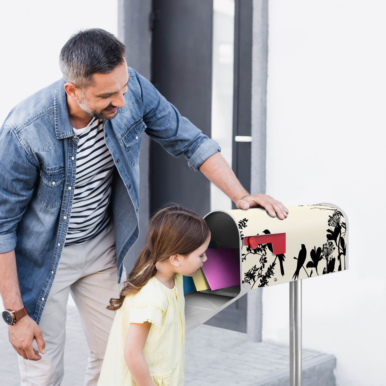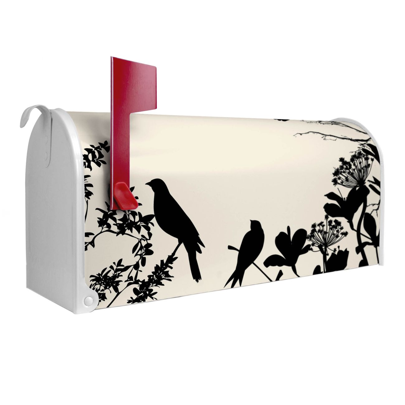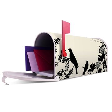 Unser amerikanischer Briefkasten mit dem Motiv Vögel Schattenriß hat ein sehr ansprechendes und ausgefallenes Design, ist in der Grundfarbe weiß, grün oder schwarz erhältlich. Damit entlocken Sie Ihren Nachbarn und dem Postboten immer wieder ein Lächeln. Die Mailbox ist ein Original Import aus Mississippi USA und wird von unserer kleinen Manufaktur in Sachsen von Hand veredelt. Die US-Mailbox bietet ausreichend Platz auch für große Sendungen, eine Fahne die Ihnen Post anzeigt, wetterfestes und äußerst stabiles Material - so macht Post empfangen Freude.