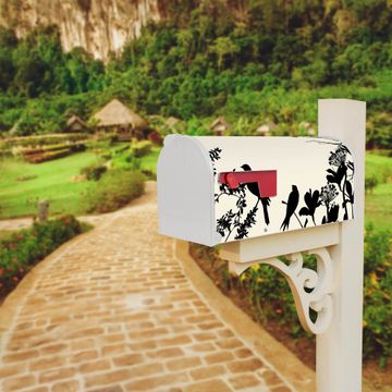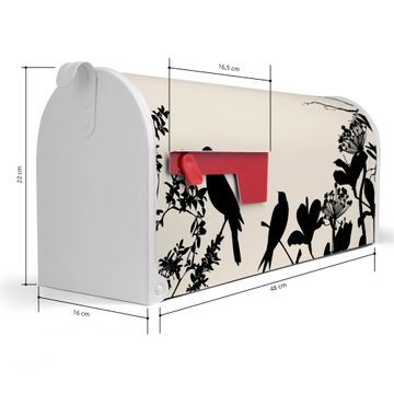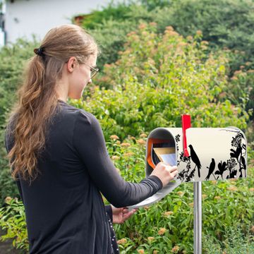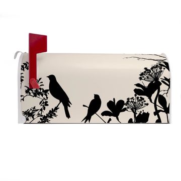 Der amerikanische Briefkasten von banjado mit Vögel Schattenriß Motiv bietet Ihnen ausreichend Fassungsvermögen, um große A4 Sendungen und Zeitschriften zu empfangen. Die typisch amerikanische rote Fahne zeigt Ihnen an, wenn Sie Post erhalten haben. Die US-Mailbox besteht aus verzinktem Stahlblech welches lackiert wurde und ist 48 x 22 x 16 CM (BxHxT) groß. Die Folie mit Motiv Vögel Schattenriß besteht aus einer wetter- und UV-resistenten Folie, die mit einem Schutzlaminat überzogen ist, sodass die US Mailbox zusätzlich vor Kratzern geschützt ist. An der Unterkante sind 4 Löcher je Seite um die Mailbox, typisch amerikanisch, an einem Holzpfahl oder einem Zaun zu befestigen. Auf Wunsch können Sie bei uns den passenden Standfuß oder die passende Wandhalterung kaufen um die US-Mailbox sicher zu befestigen. Wir bieten Ihnen ebenfalls Namensschilder, bereits beschriftet oder frei zu beschriften, und verschiedene selbst gestaltete Bitte-Keine-Werbung-Aufkleber.